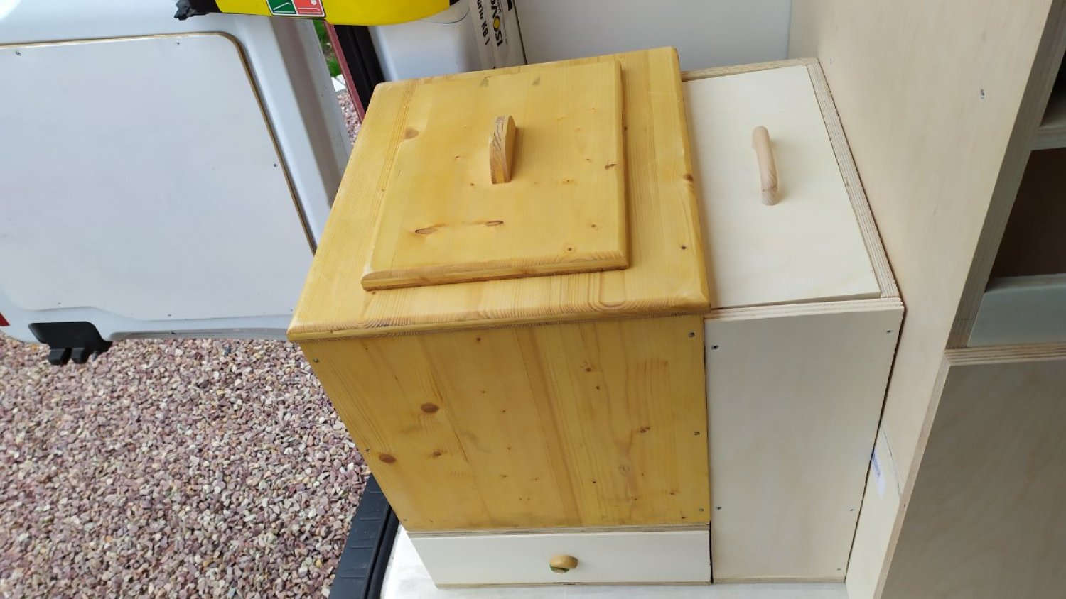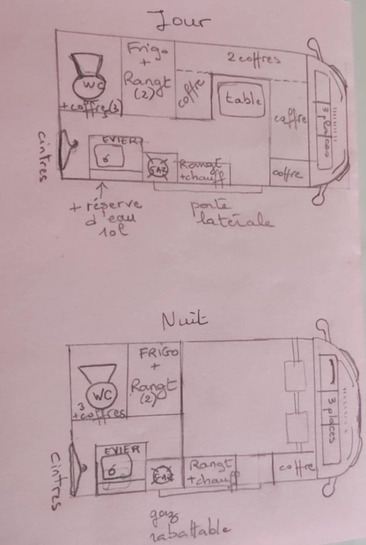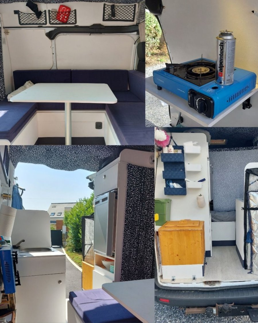 Les meubles ont été achetés chez un fabricant de kits pour fourgons et vans, Héode. Seule l'adaptation au véhicule a été réalisée par nos soins et tous les meubles sont amovibles (le contrôle technique ne pose aucun problème).