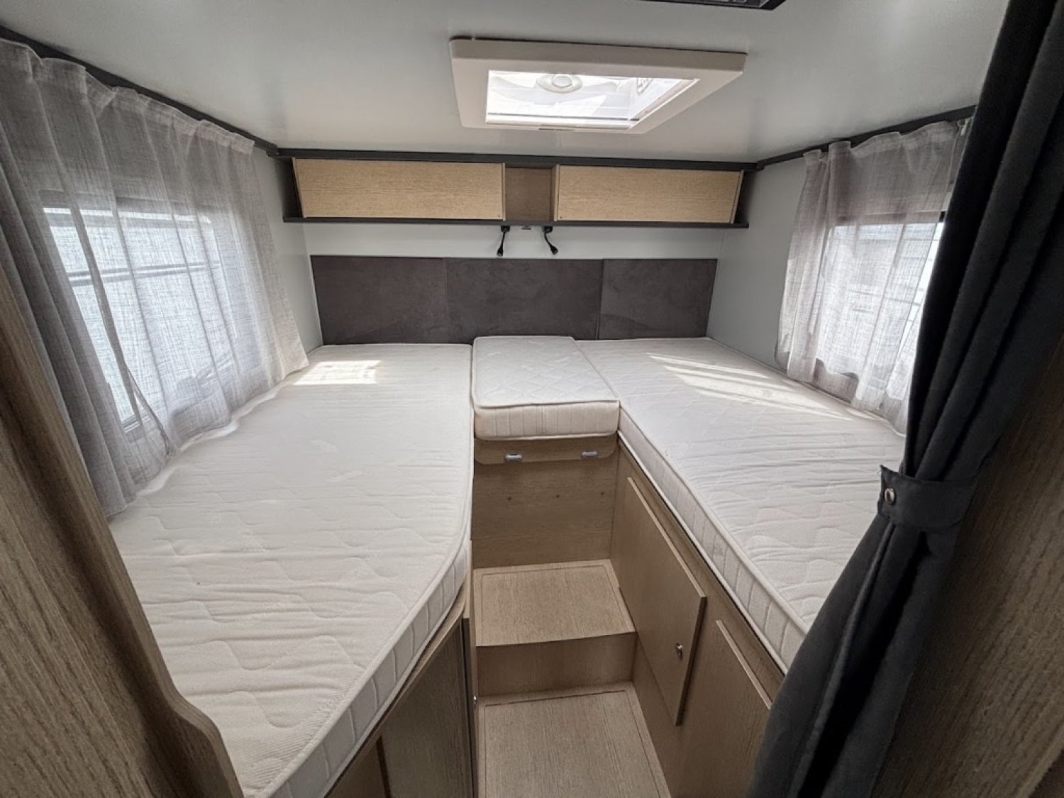 Cuisine en long, Douche à vario, Grande soute, Lit dînette avant, lit jumeaux, Salon avant sièges pivotants, WC Cassette.