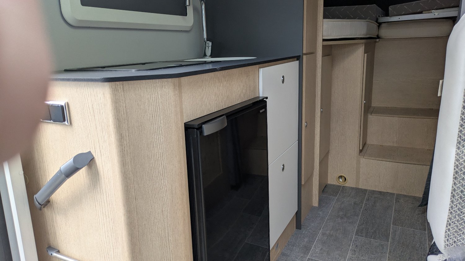 Cuisine : réchaud 2 feux, réfrigérateur 140 litres