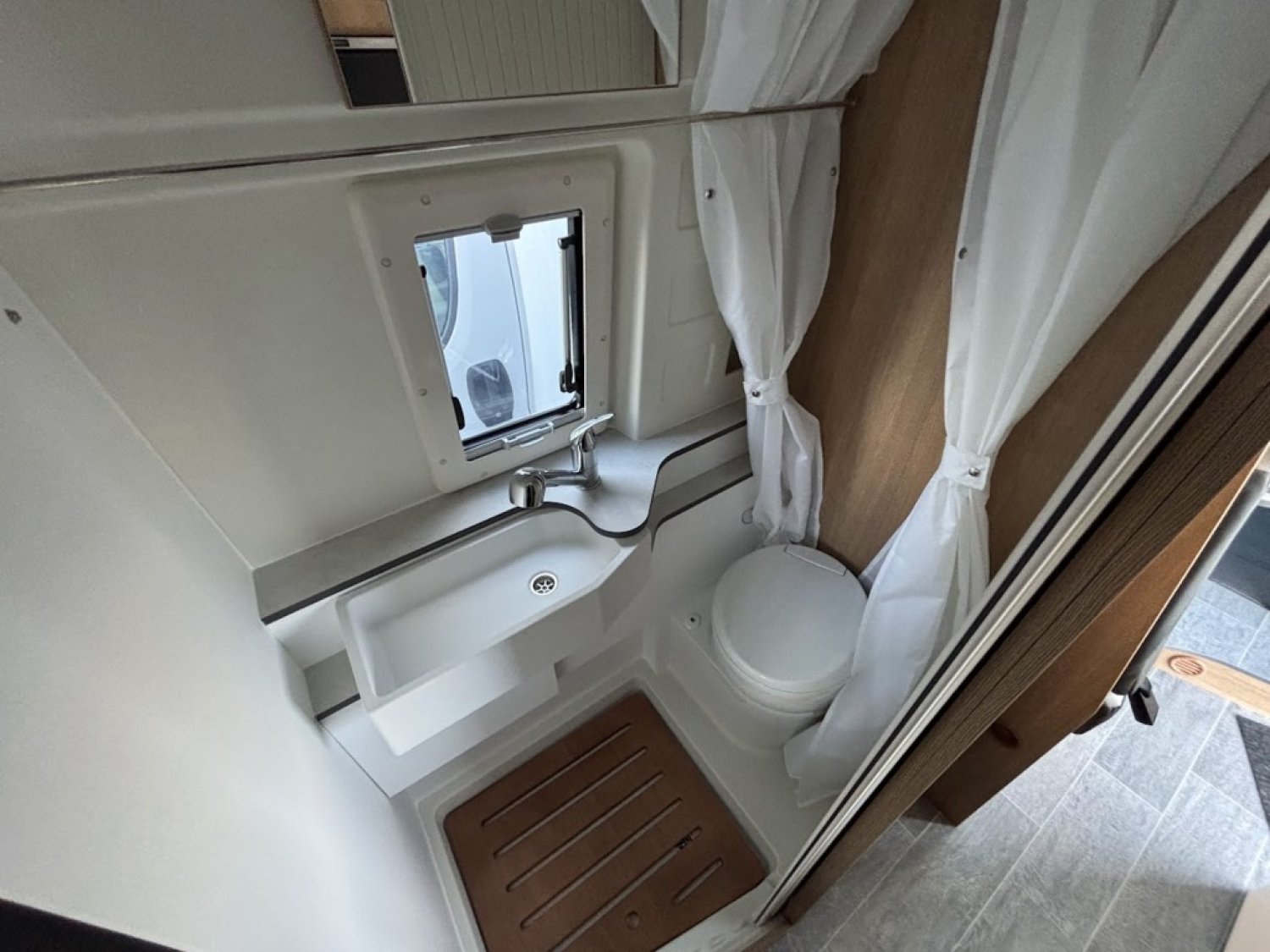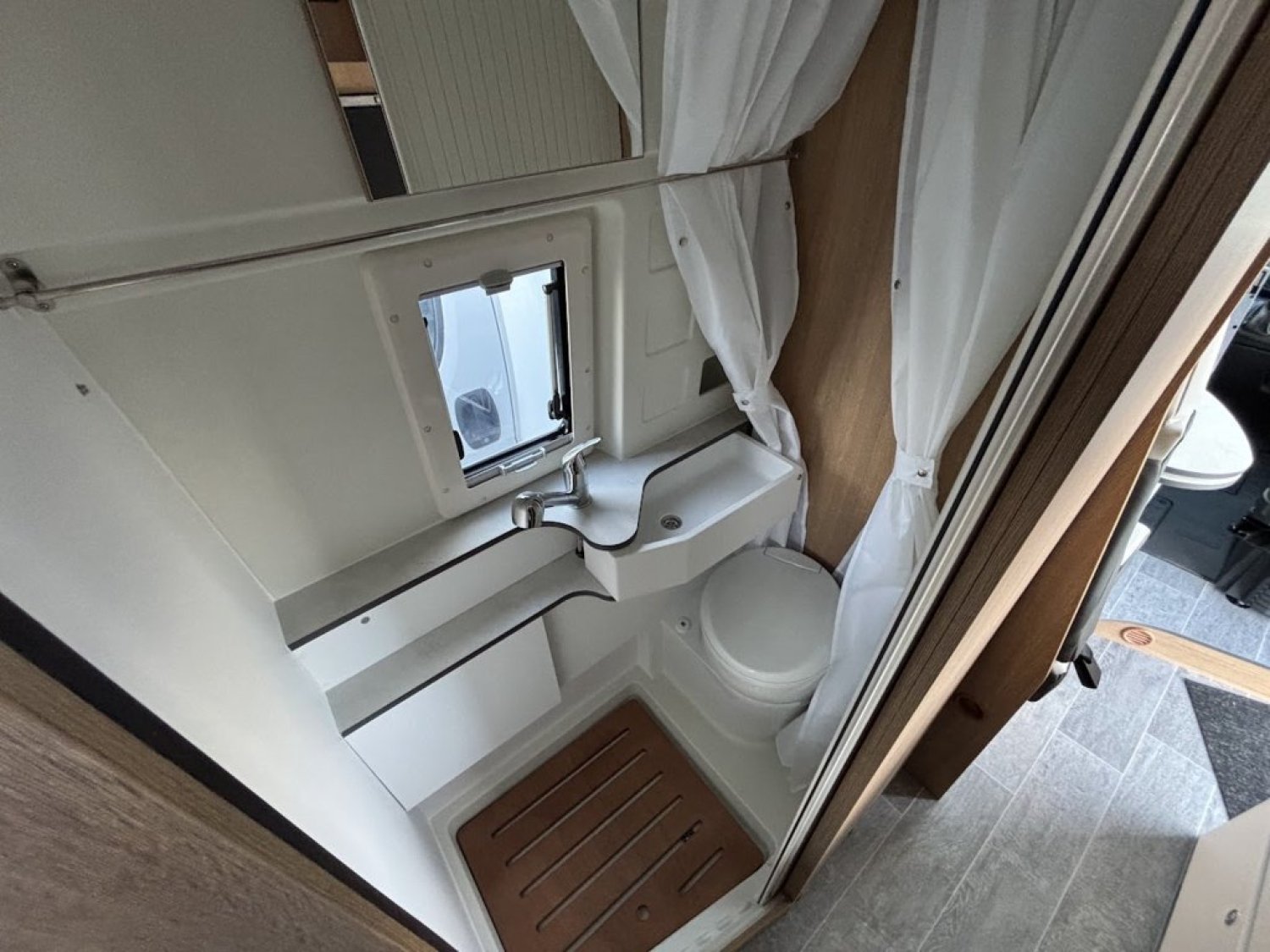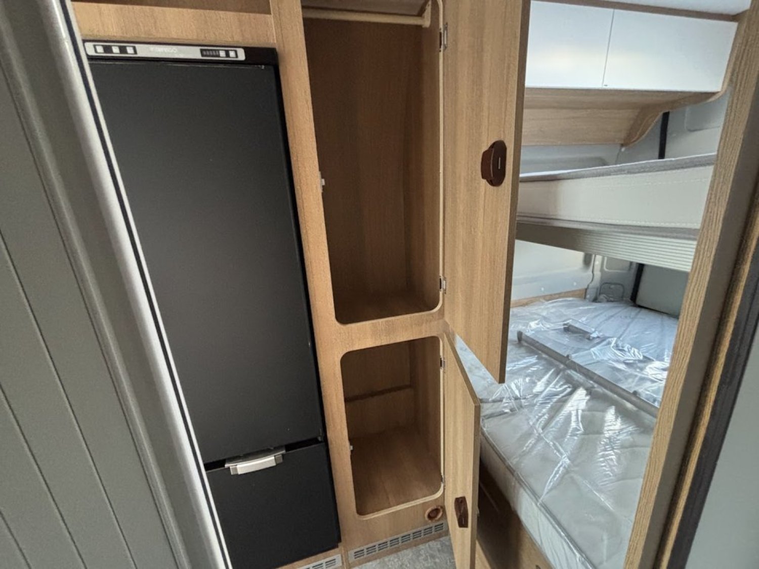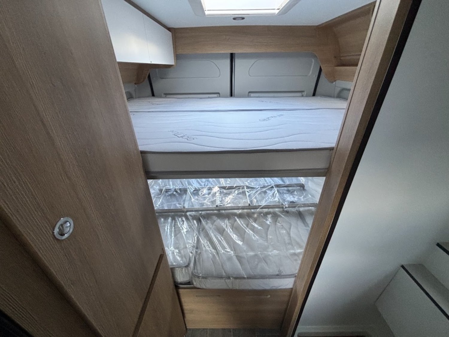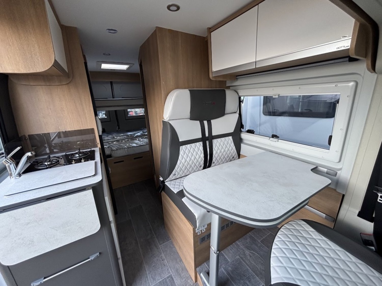 Cuisine en long, Douche modulable, Lit arrière transversal, Lit dînette avant, lit superposés, Salon avant sièges pivotants, WC Cassette.
