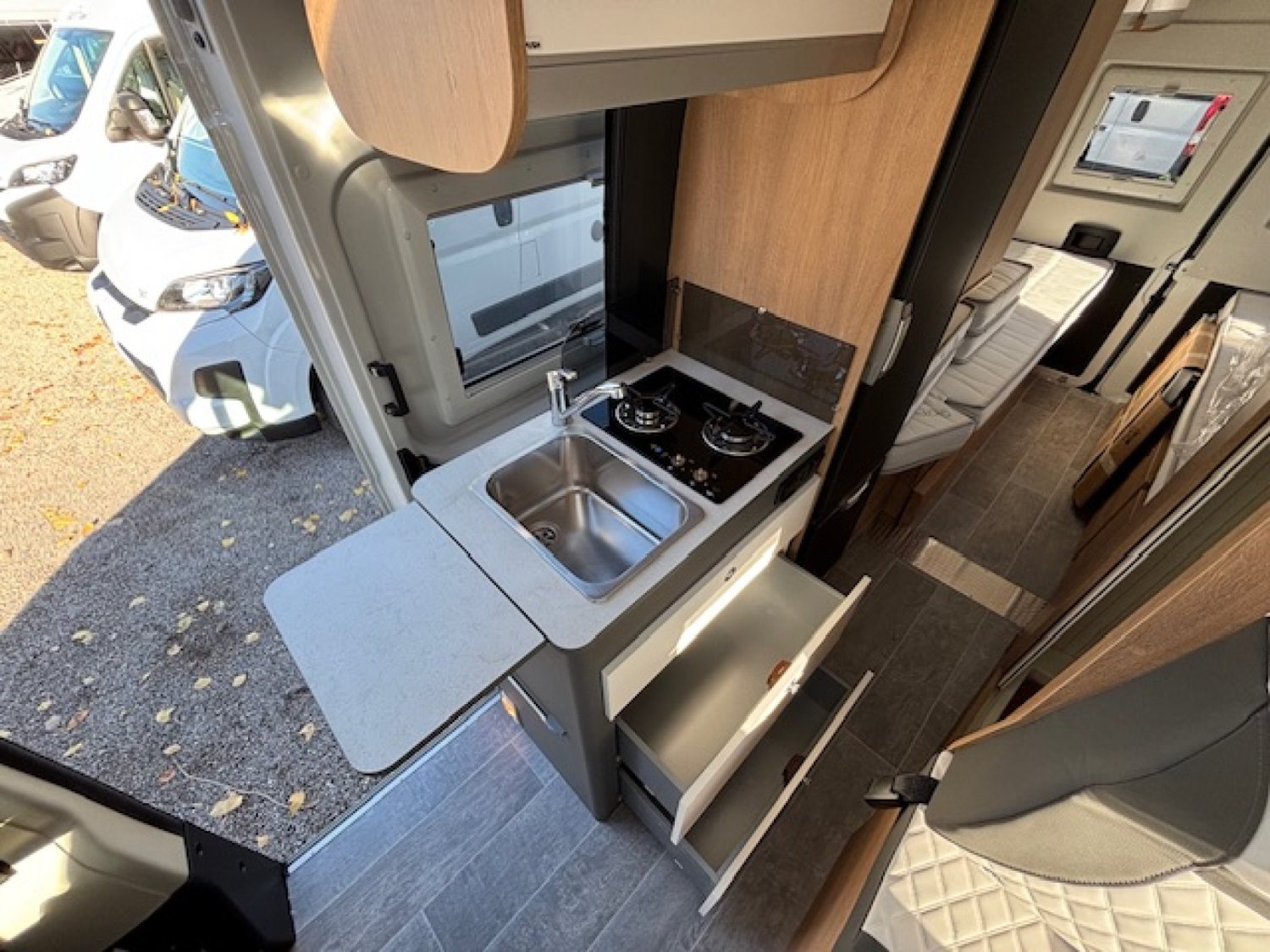 Découvrez chez Narbonne Camping Cars le Giottivan 64G première édition collection 2026 en boite automatique, un grand fourgon de 6.36m avec lit jumeaux, véhicule confortable avec de nombreux rangements, bien isolé, parfait pour ceux qui cherchent autonomie et grande capacité de chargement, tout en restant maniable comme un van.