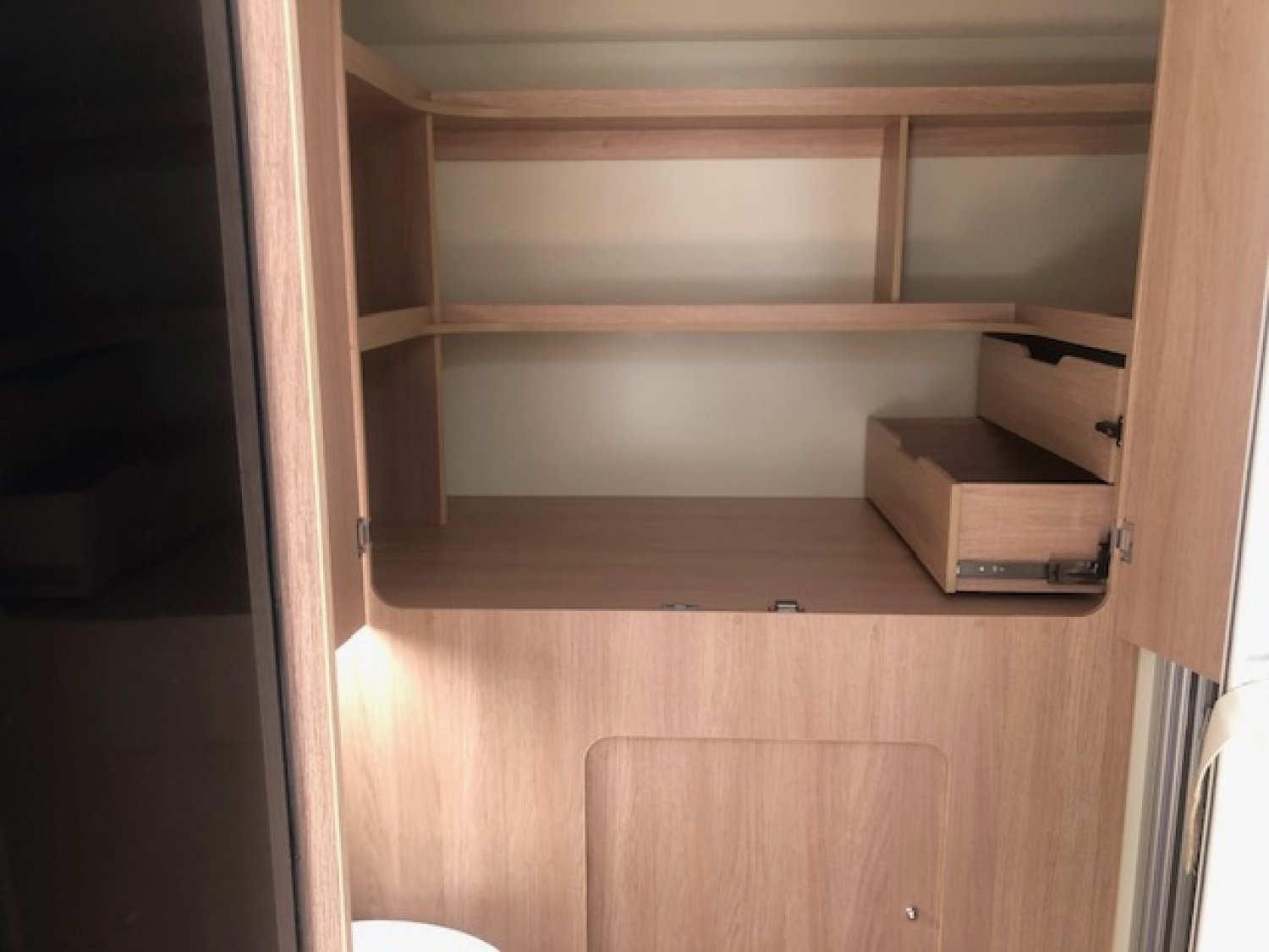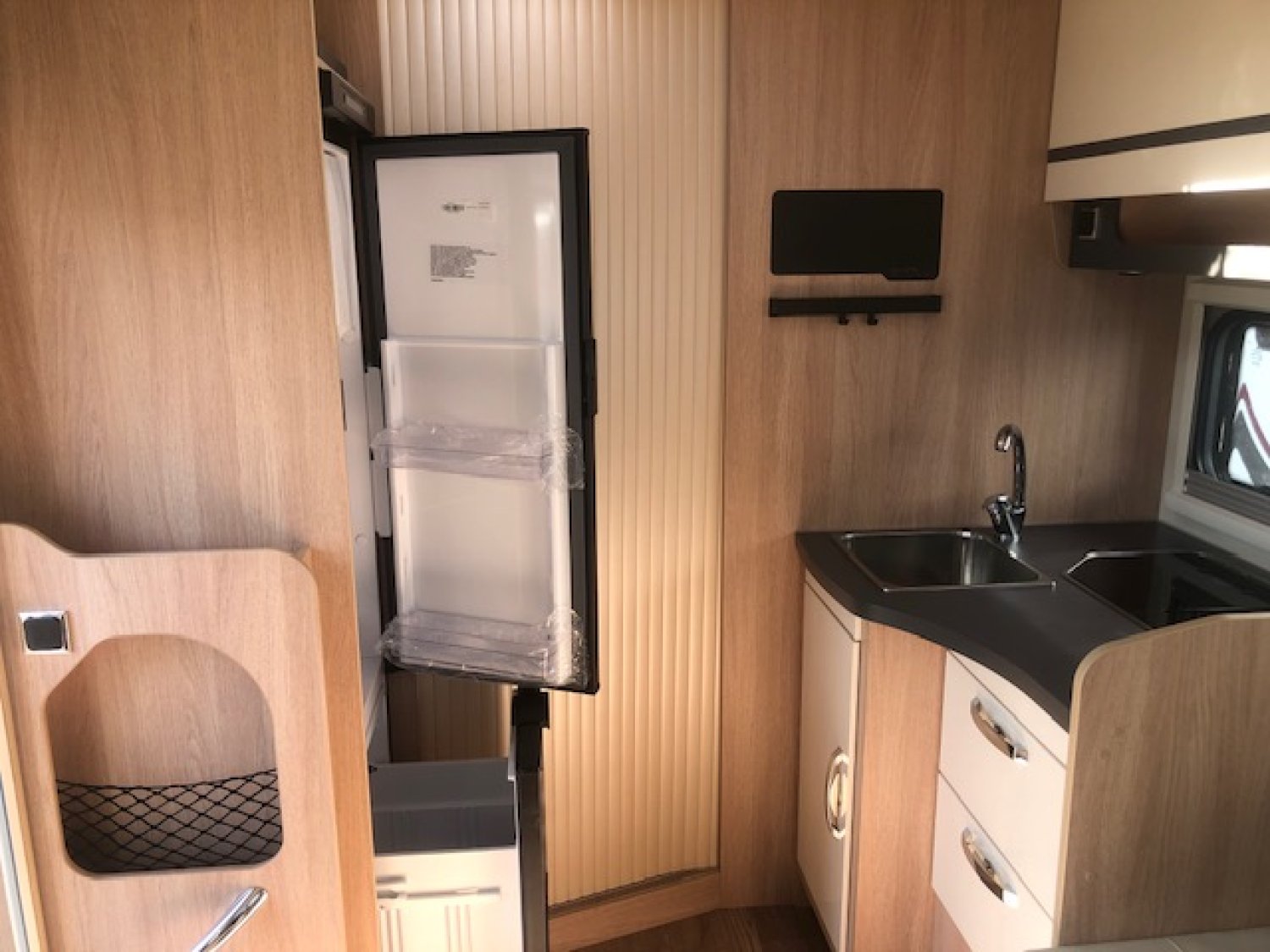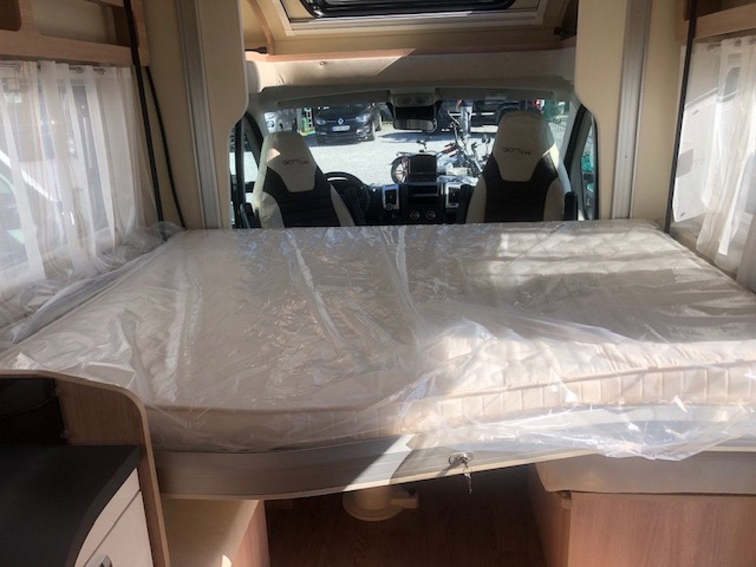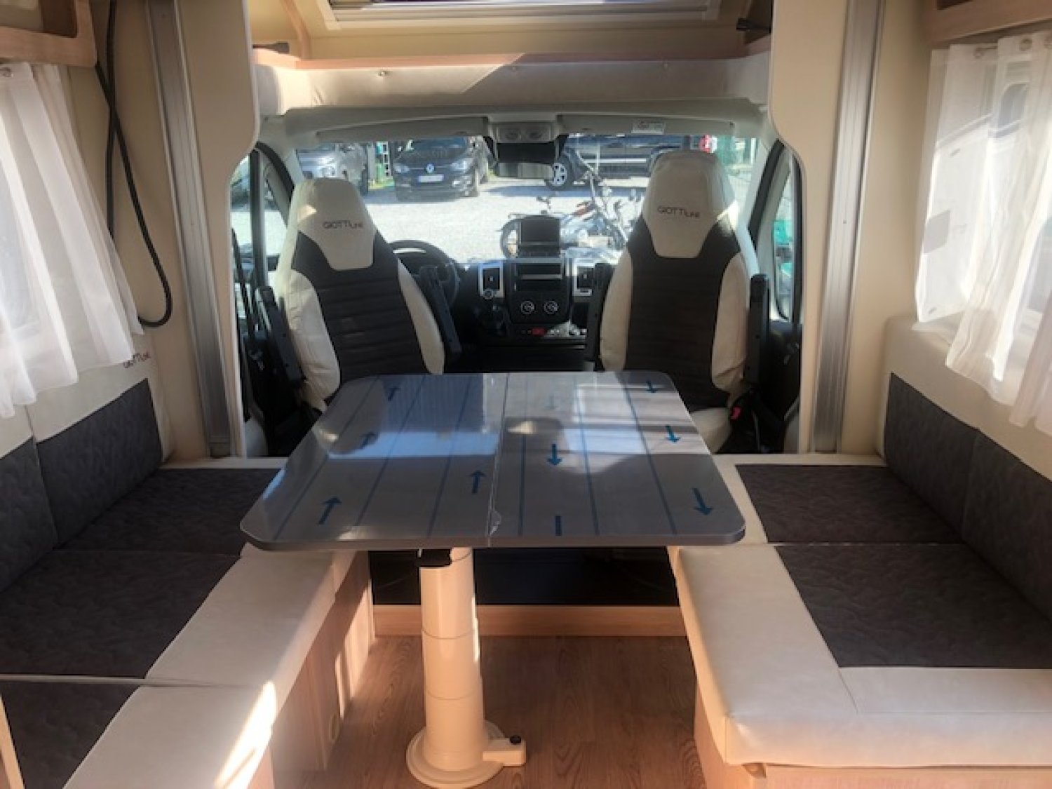 Ce camping-car de 6,36m vous offre un incroyable espace du fait de son lit de pavillon qui se remonte en journée, cela permet d'avoir de nombreux rangements et un salon face à face avec une grande table.