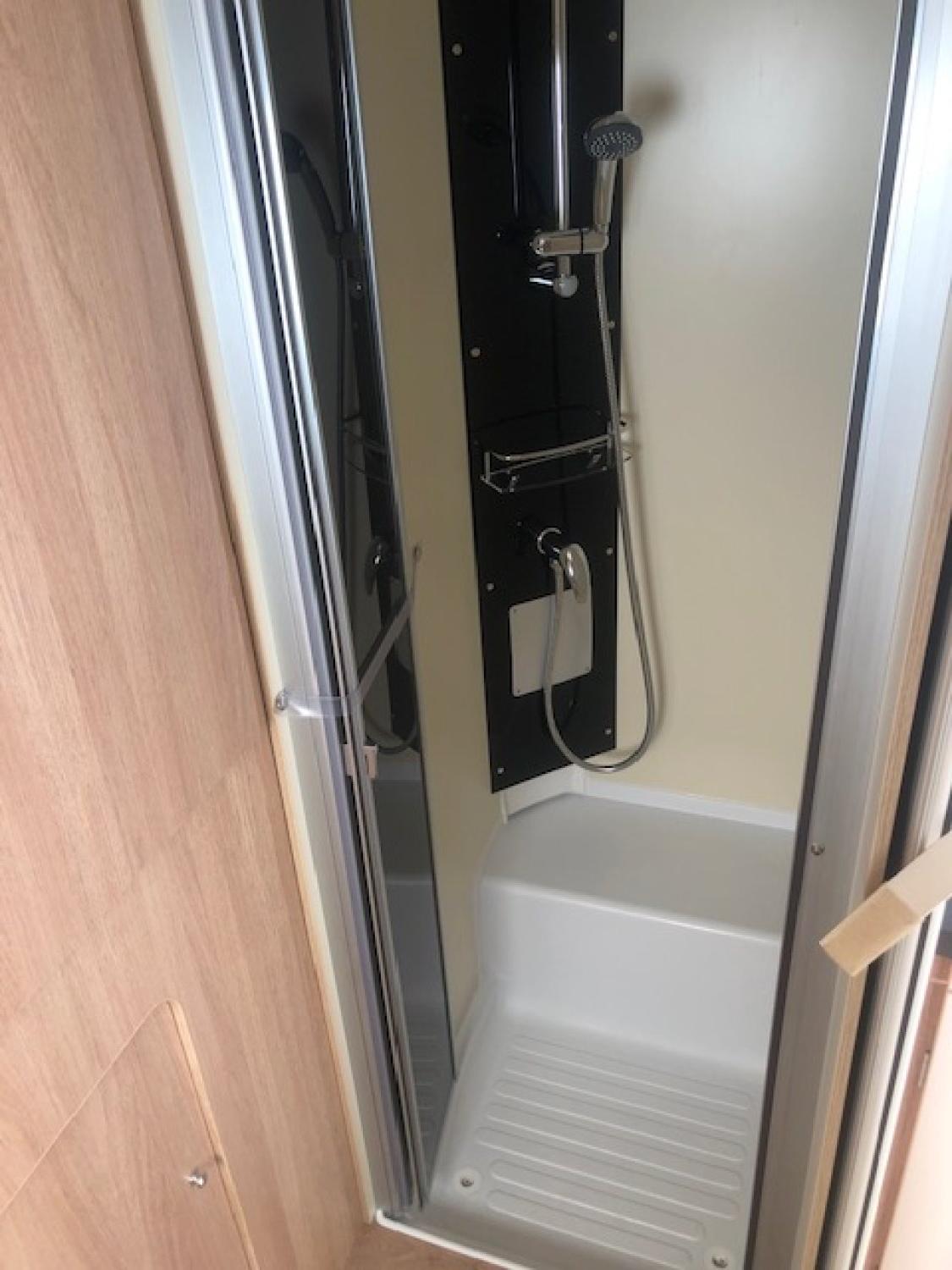 A l'arrière la salle d'eau transversale est très grande et la cabine de douche de taille confortable. Un grand dressing est également présent dans la salle d'eau.
