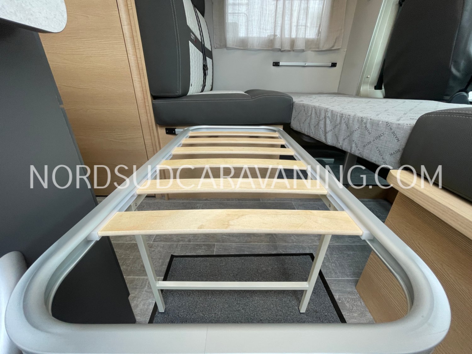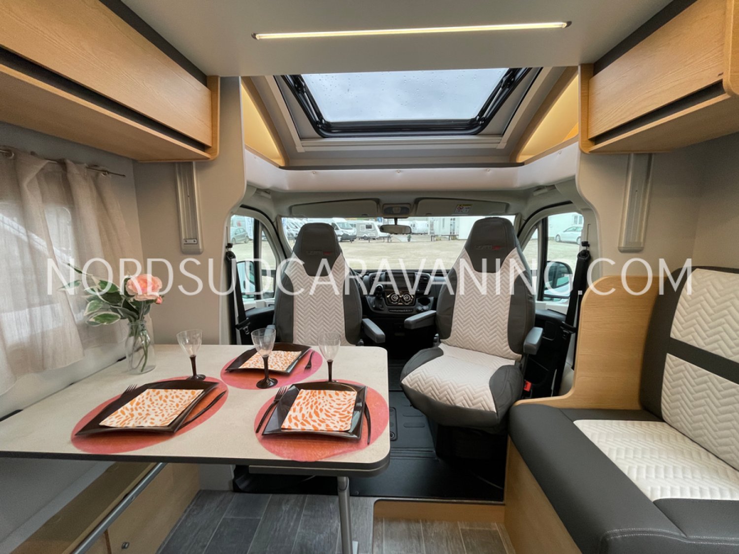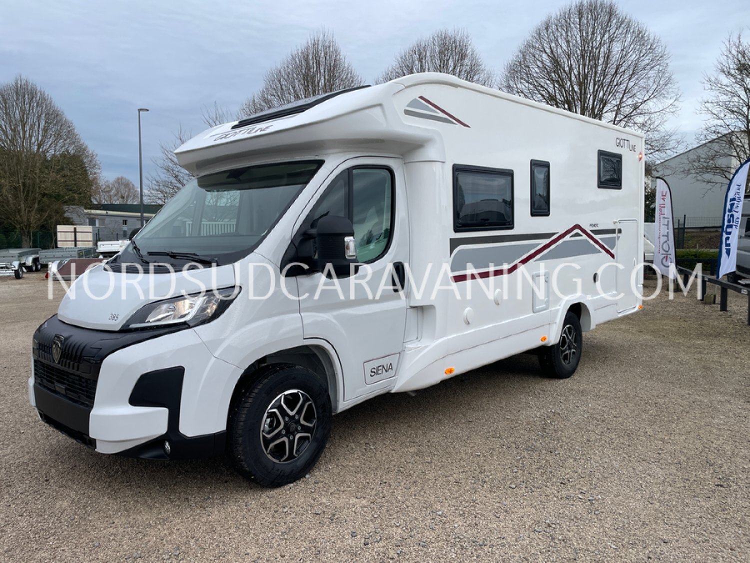 Ce camping-car profilé GIOTTILINE SIENA 385 Première Edition de moins de 7 m sur porteur Peugeot avec boîte de vitesse automatique a tout pour plaire : Lits jumeaux transformables en un lit XXL permettant un couchage pour 3 personnes, Garage d'une capacité de rangements de 300 kg, équipé d'une prise 220 V, Hauteur du garage 120 cm et accessible de l’extérieur grâce à deux portillons. Son homologation permet la circulation avec 5 personnes à bord avec ceintures de sécurité.