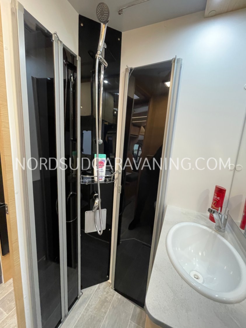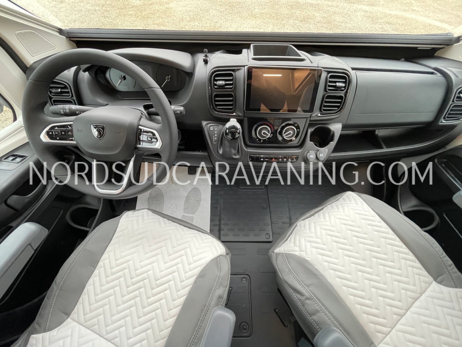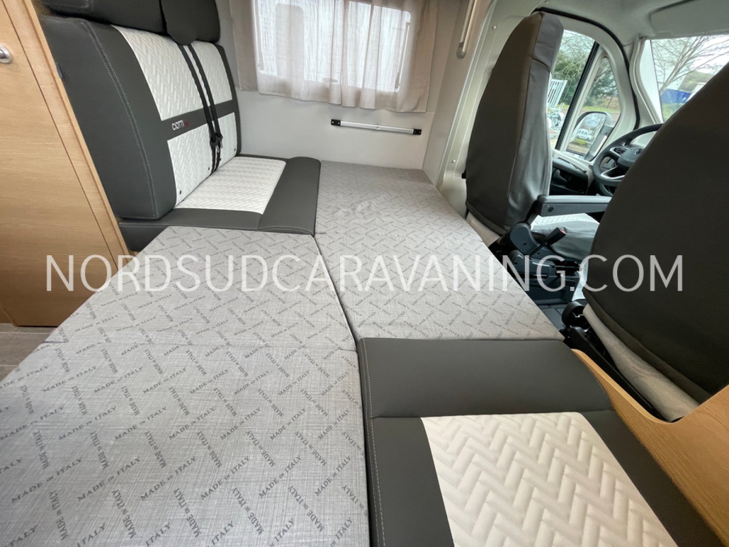Ce camping-car profilé GIOTTILINE SIENA 385 Première Edition de moins de 7 m sur porteur Peugeot avec boîte de vitesse automatique a tout pour plaire : Lits jumeaux transformables en un lit XXL permettant un couchage pour 3 personnes, Garage d'une capacité de rangements de 300 kg, équipé d'une prise 220 V, Hauteur du garage 120 cm et accessible de l’extérieur grâce à deux portillons. Son homologation permet la circulation avec 5 personnes à bord avec ceintures de sécurité.