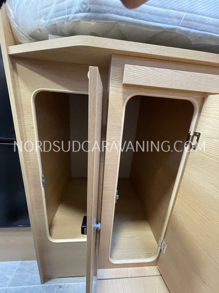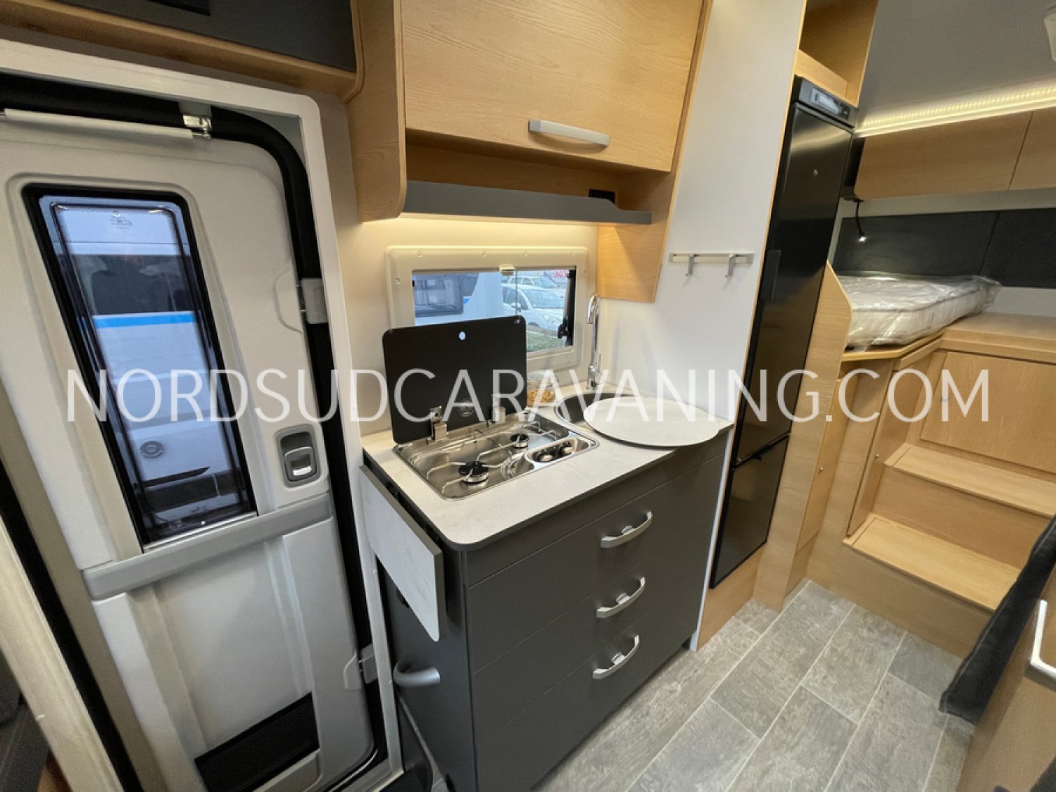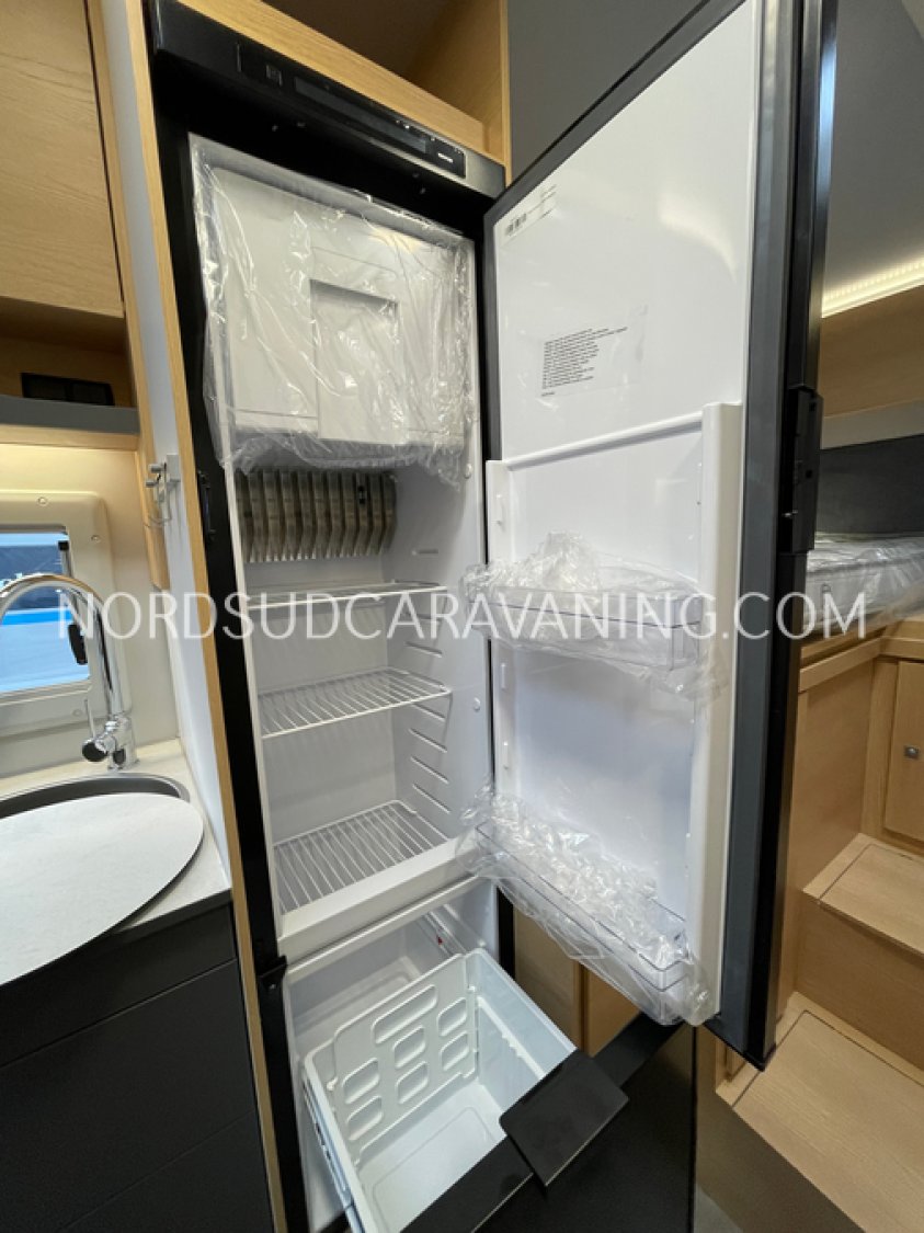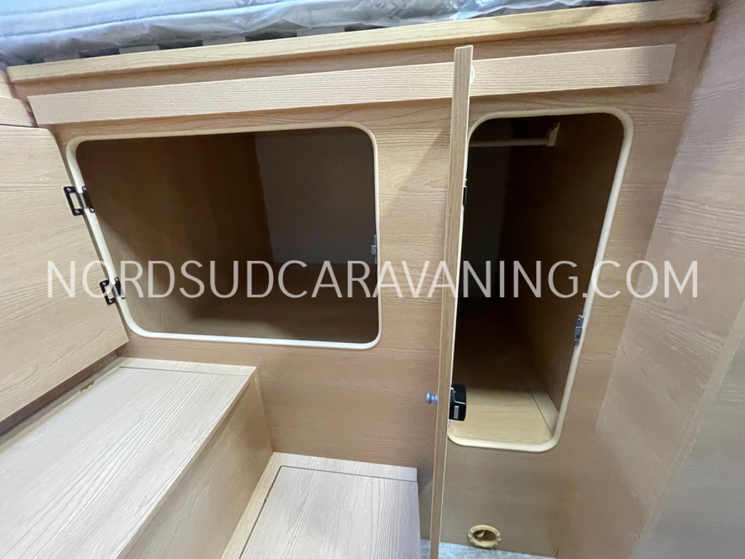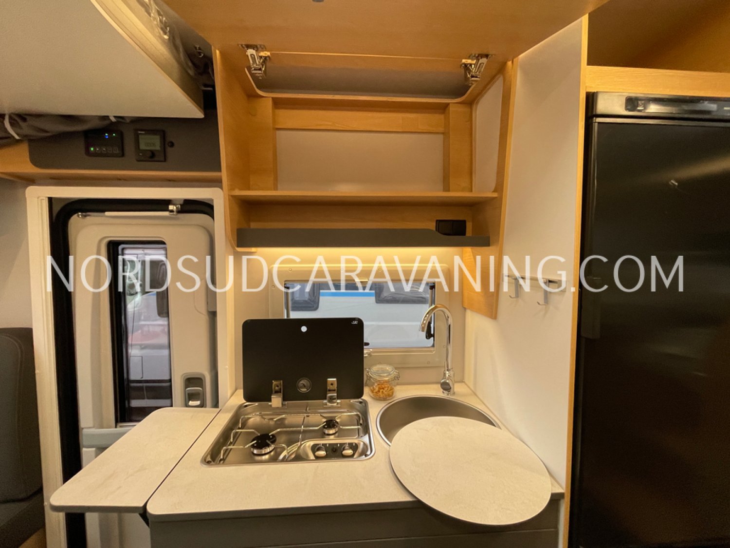Il est doté également d’une cuisine pratique et fonctionnelle équipée de plaque cuisson 2 feux, d’un évier inox et d’un grand réfrigérateur (142L), d’un joli salon transformable en couchage et de nombreux rangements astucieux. Sans oublier son coin toilette agréable et spacieux avec WC, Lavabo et douche.
