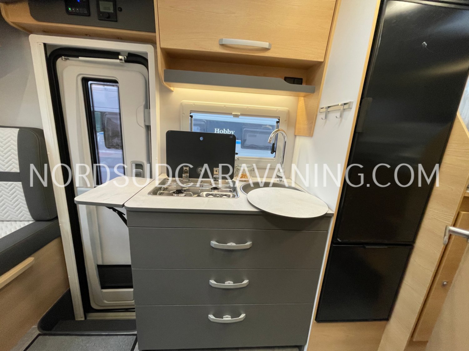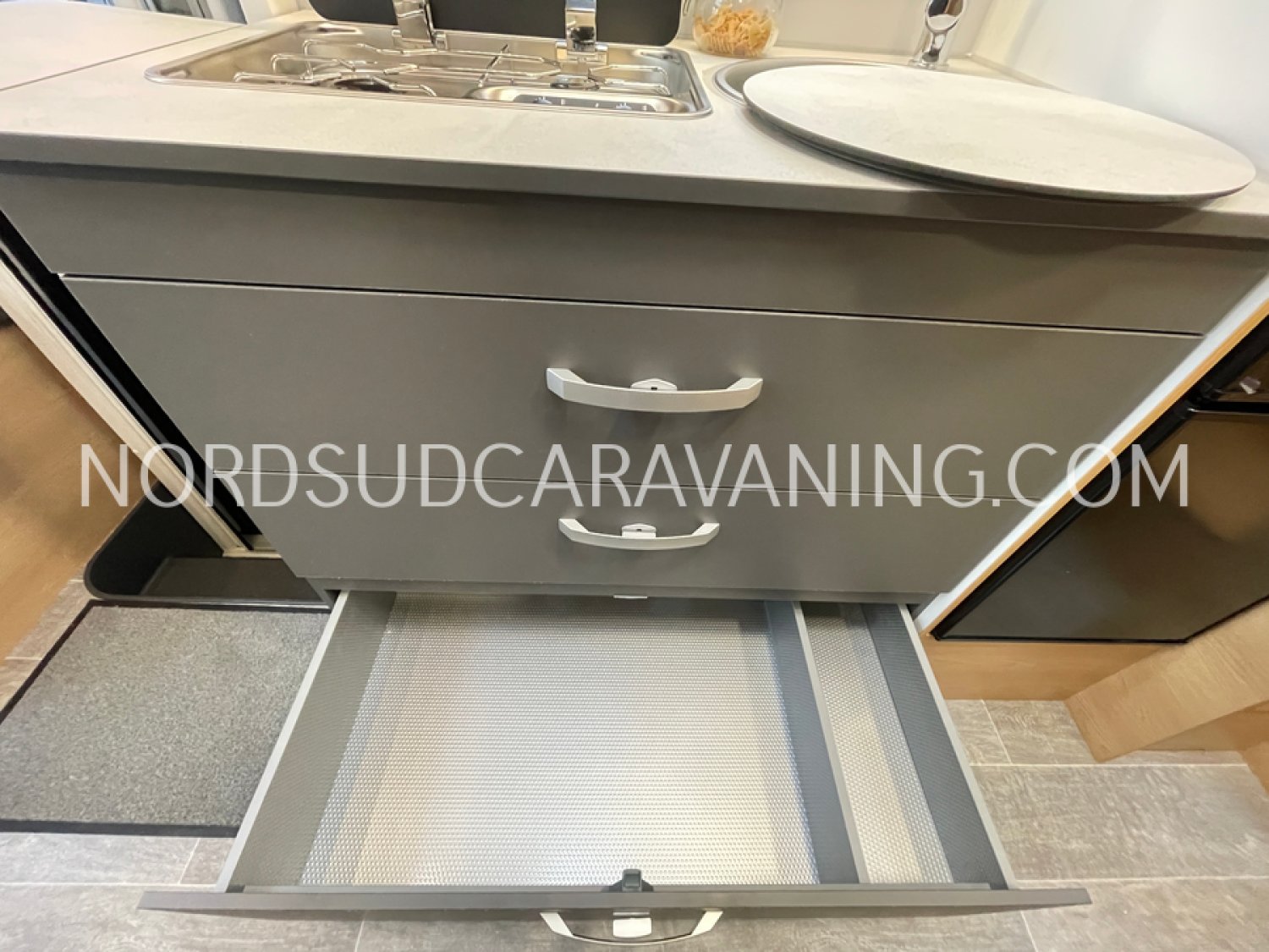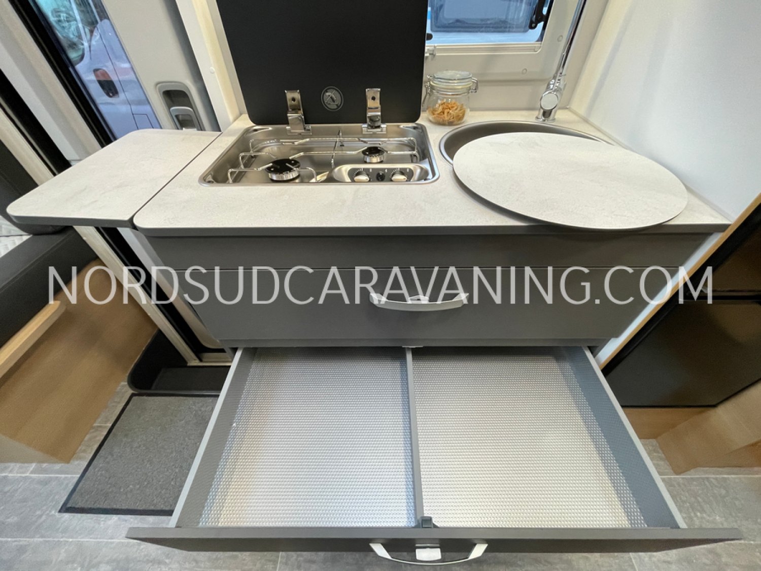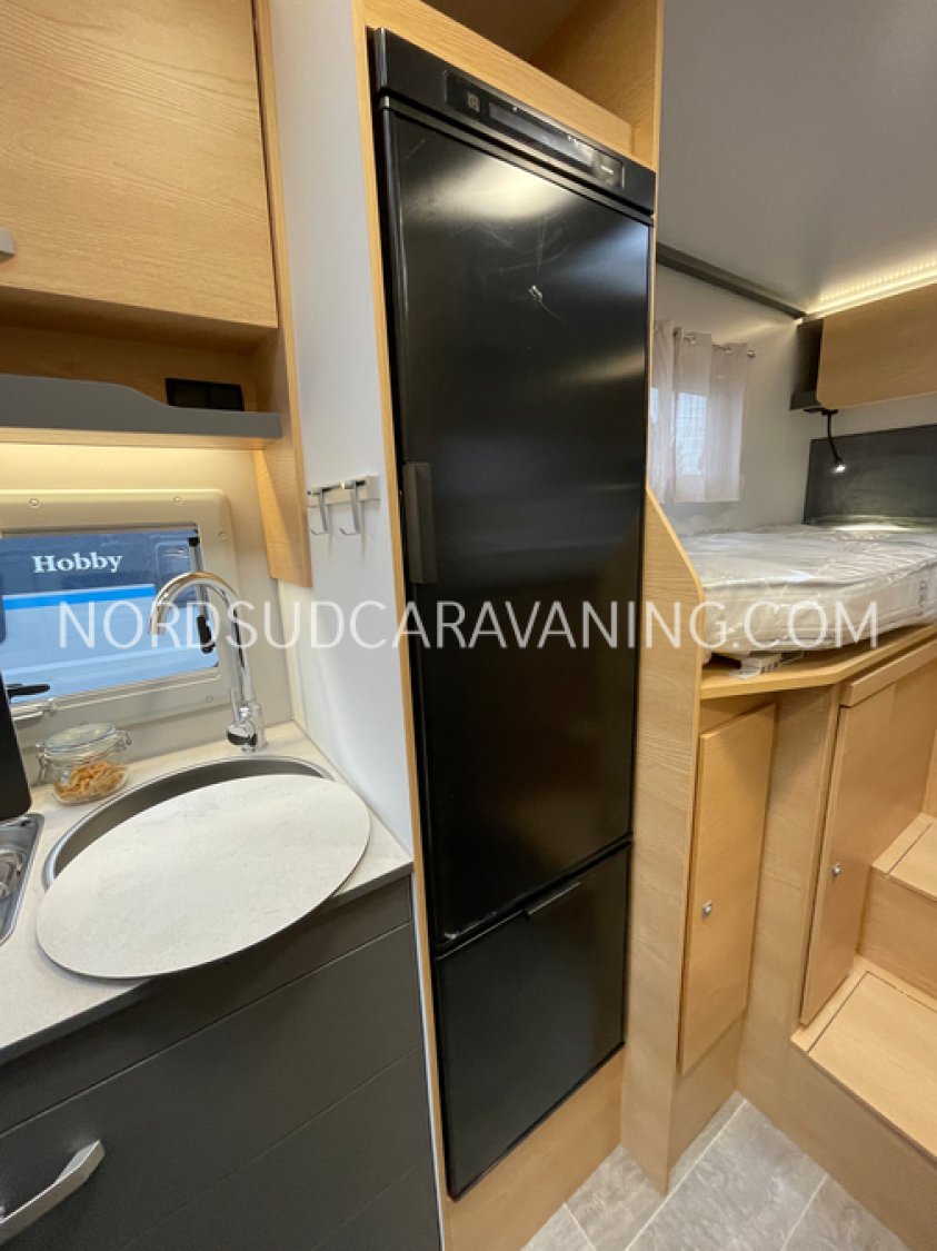 Il est doté également d’une cuisine pratique et fonctionnelle équipée de plaque cuisson 2 feux, d’un évier inox et d’un grand réfrigérateur (142L), d’un joli salon transformable en couchage et de nombreux rangements astucieux. Sans oublier son coin toilette agréable et spacieux avec WC, Lavabo et douche.