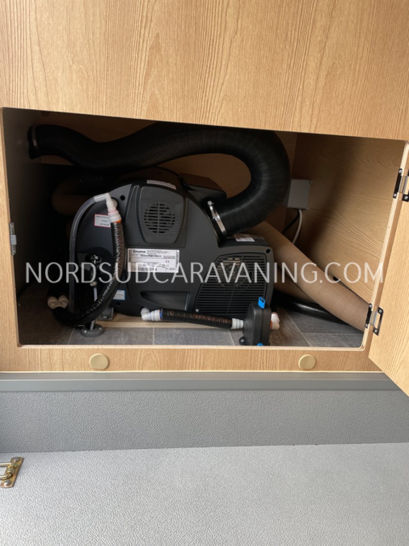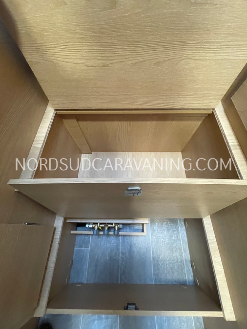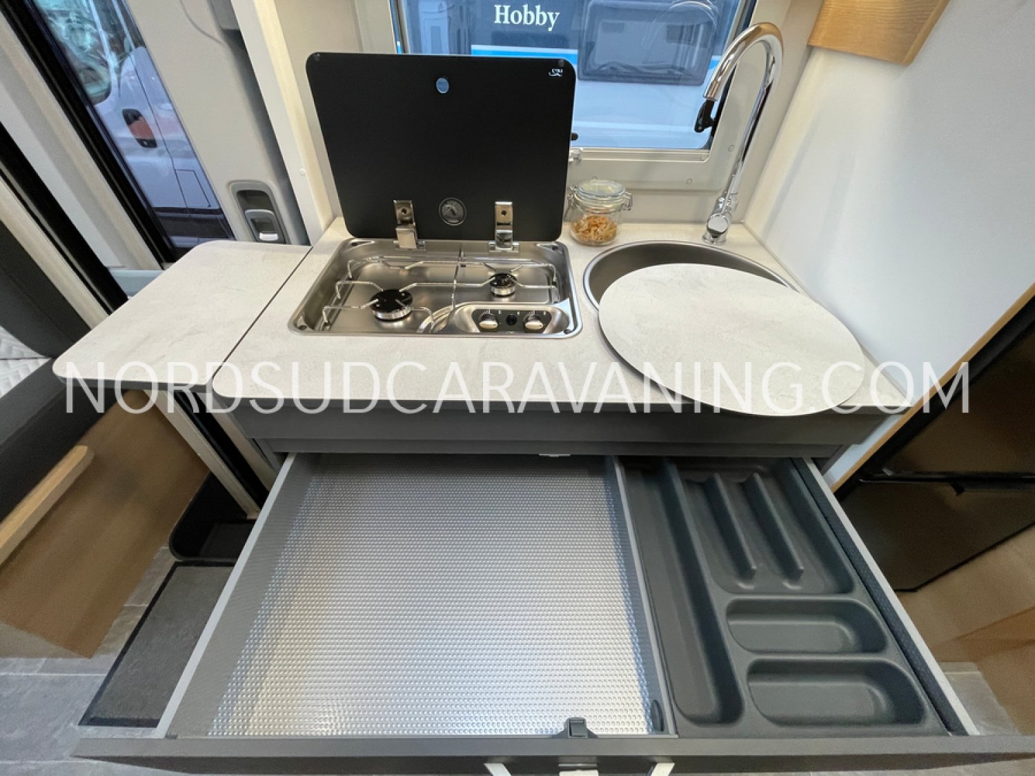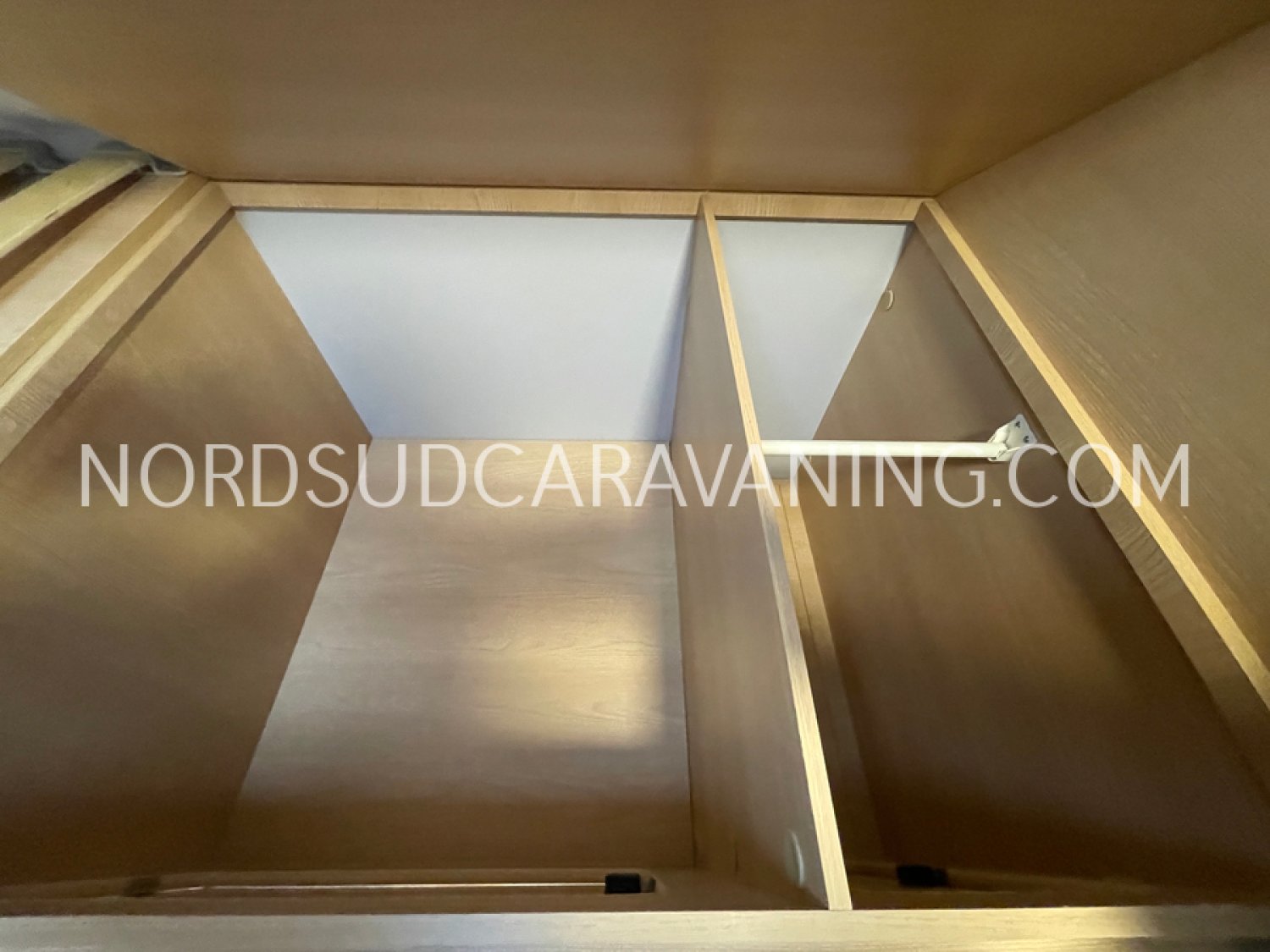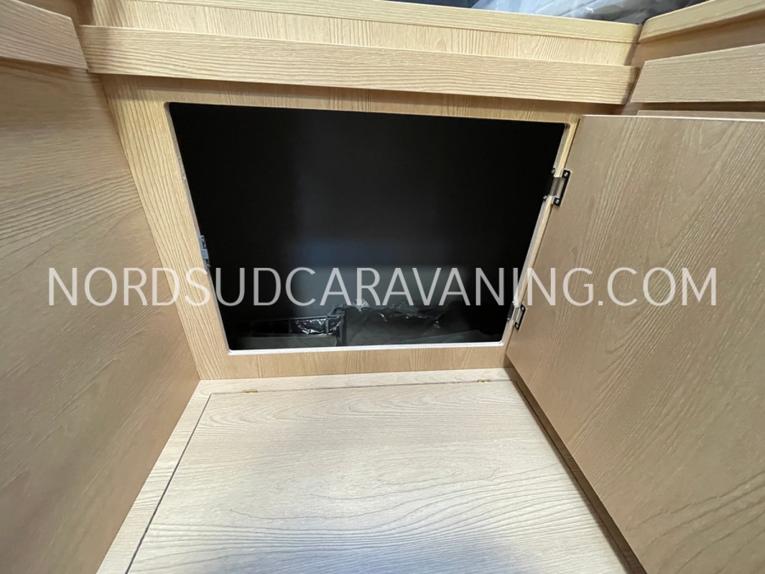 Il est doté également d’une cuisine pratique et fonctionnelle équipée de plaque cuisson 2 feux, d’un évier inox et d’un grand réfrigérateur (142L), d’un joli salon transformable en couchage et de nombreux rangements astucieux. Sans oublier son coin toilette agréable et spacieux avec WC, Lavabo et douche.