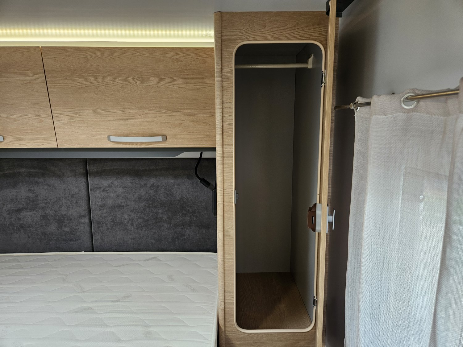 D'une longueur de 7,45 mètres, il offre un lit central à l'arrière, un lit pavillon électrique 2 places à l'avant et un couchage simple sur la dinette, une salle de bain avec douche séparée et un grand espace de vie.