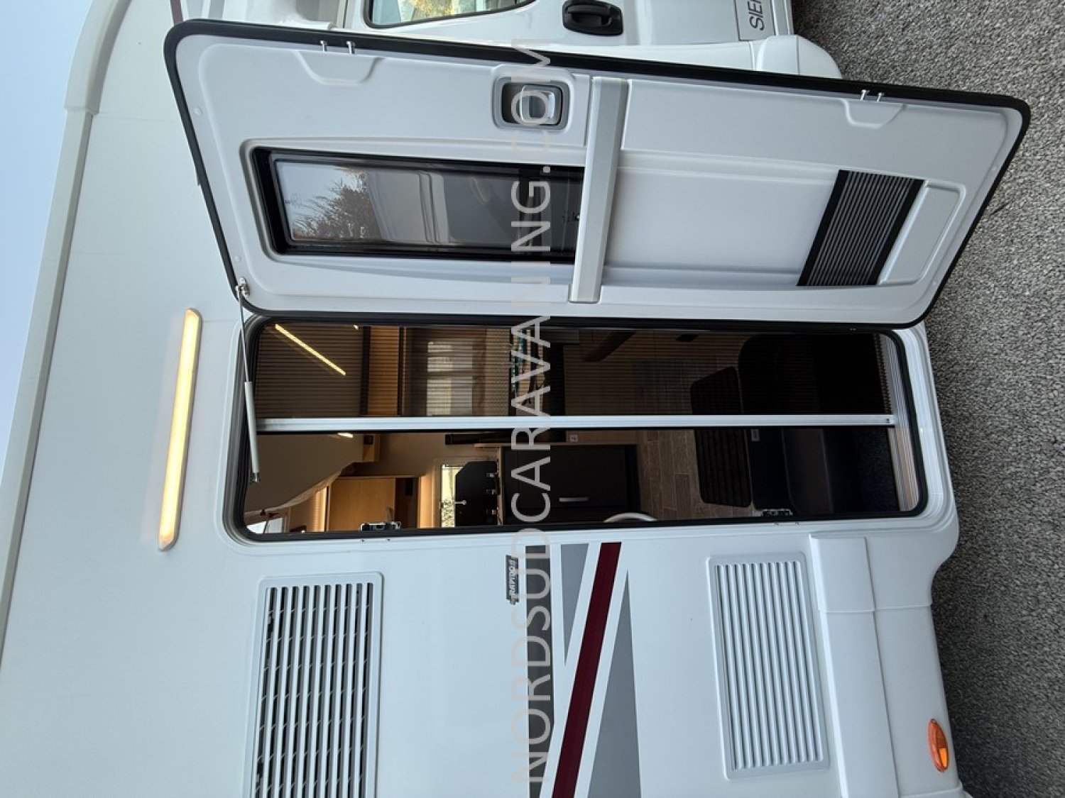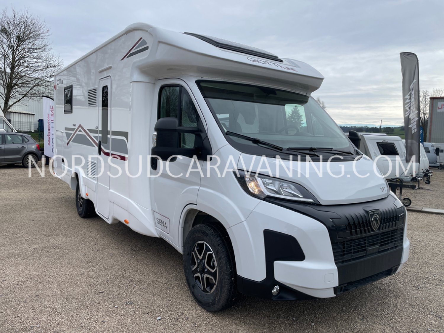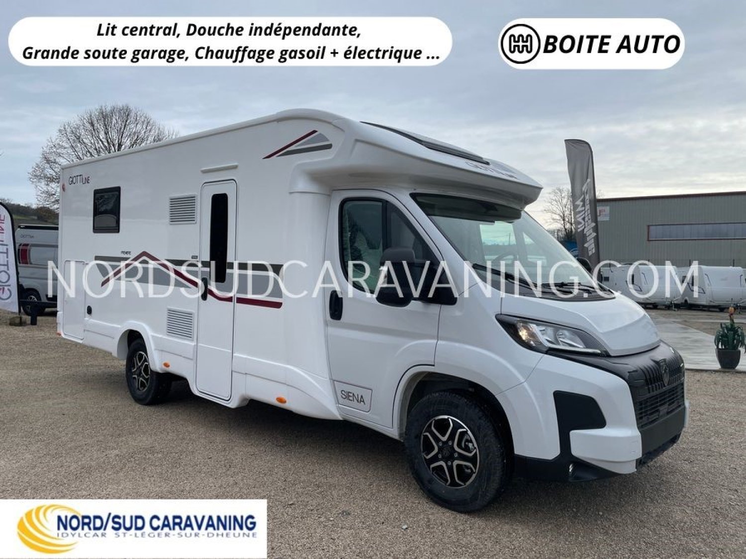 Ce camping-car profilé GIOTTILINE SIENA 397 Première Edition sur porteur Peugeot avec boîte de vitesse automatique est très spacieux et pratique grâce à son lit central, son lit pavillon et sa douche indépendante du cabinet de toilette.