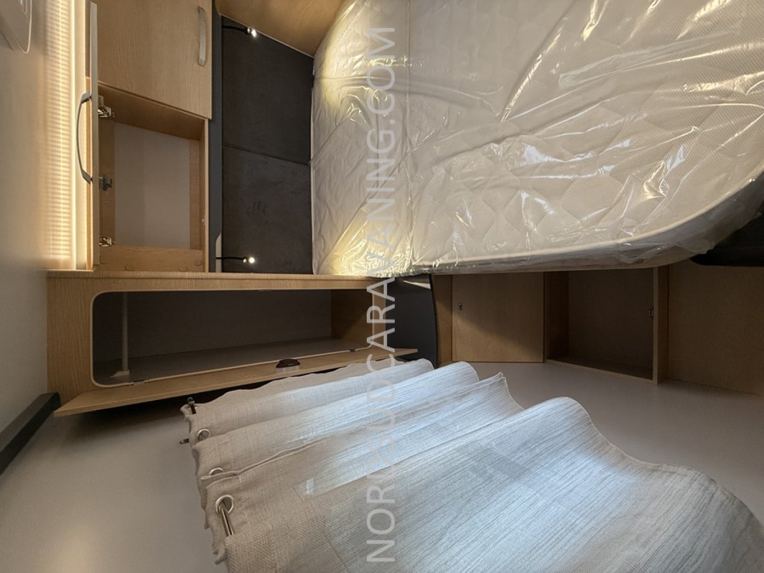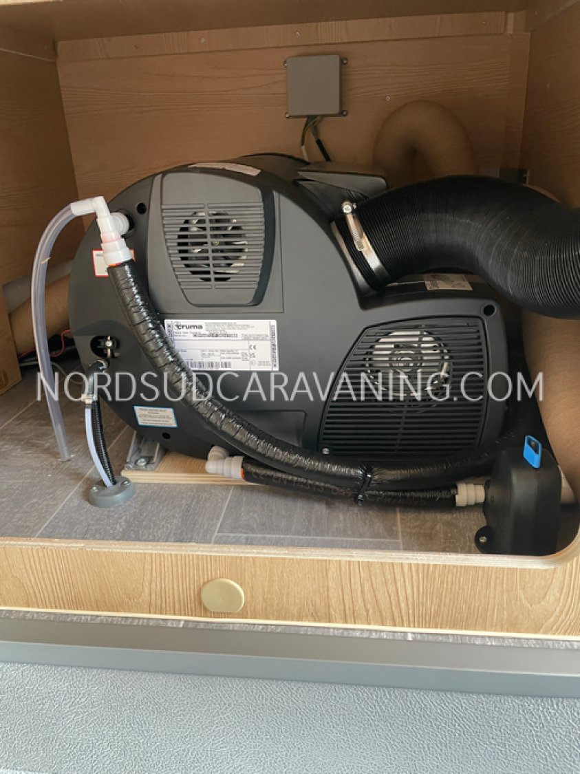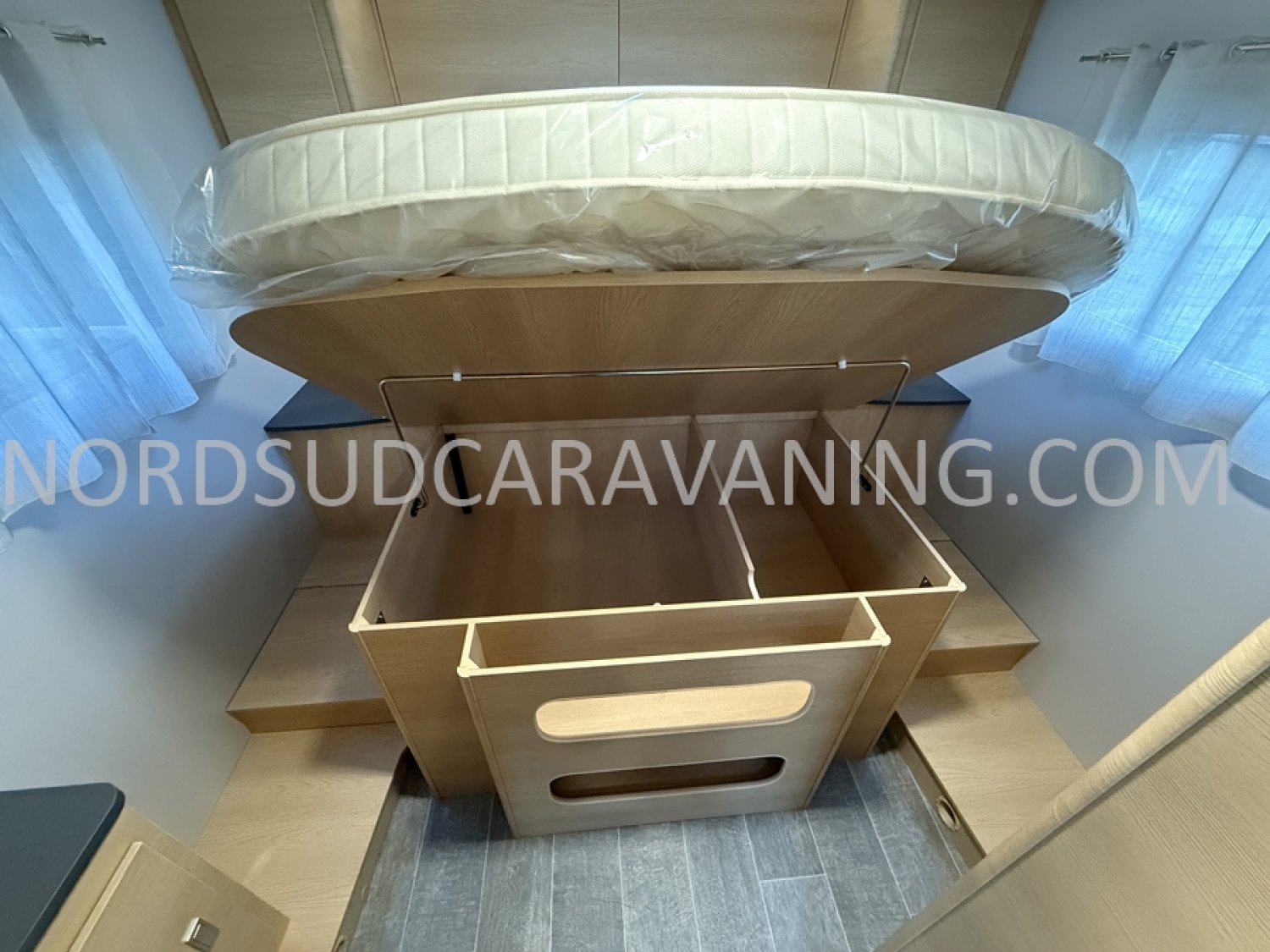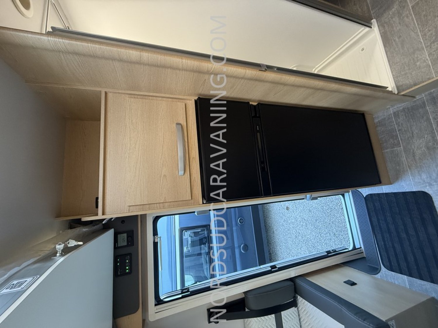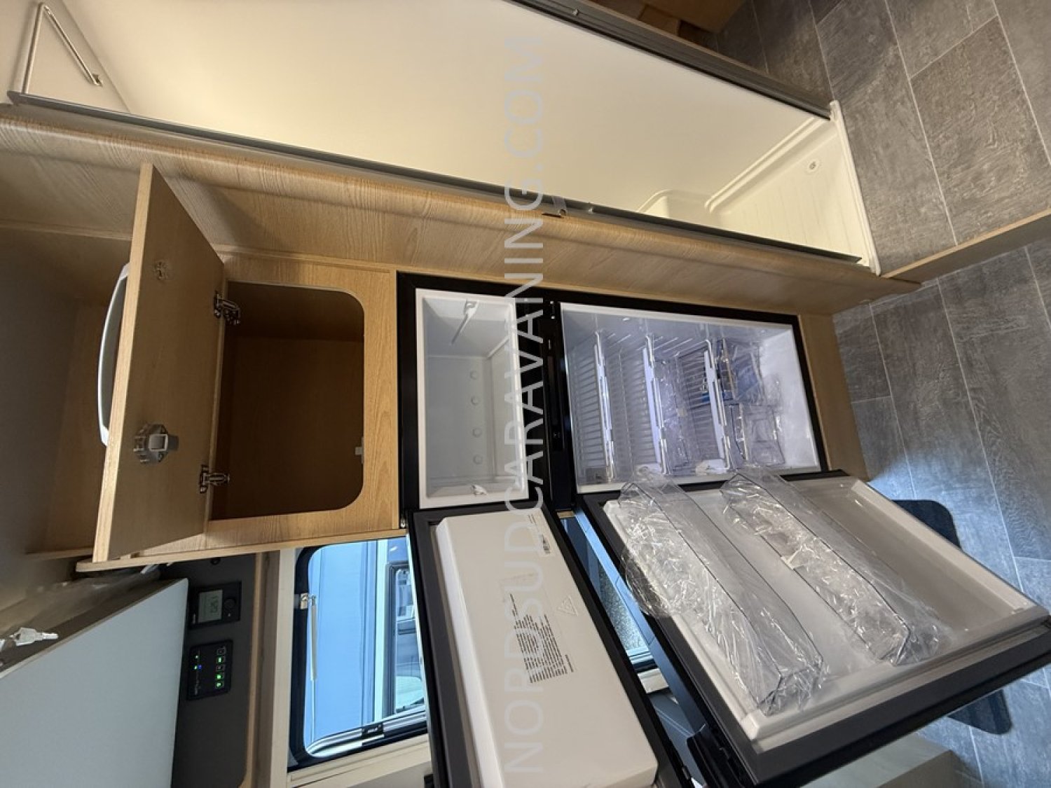 Il est doté également d’une cuisine équipée de plaque cuisson 2 feux, d’un évier inox et d’un grand réfrigérateur (160L), sans oublier son joli salon face à face avec table pliante et ses nombreux rangements astucieux. Sa spacieuse soute avec une capacité de rangements de 300kg est accessible de l'extérieur grâce à deux portillons.