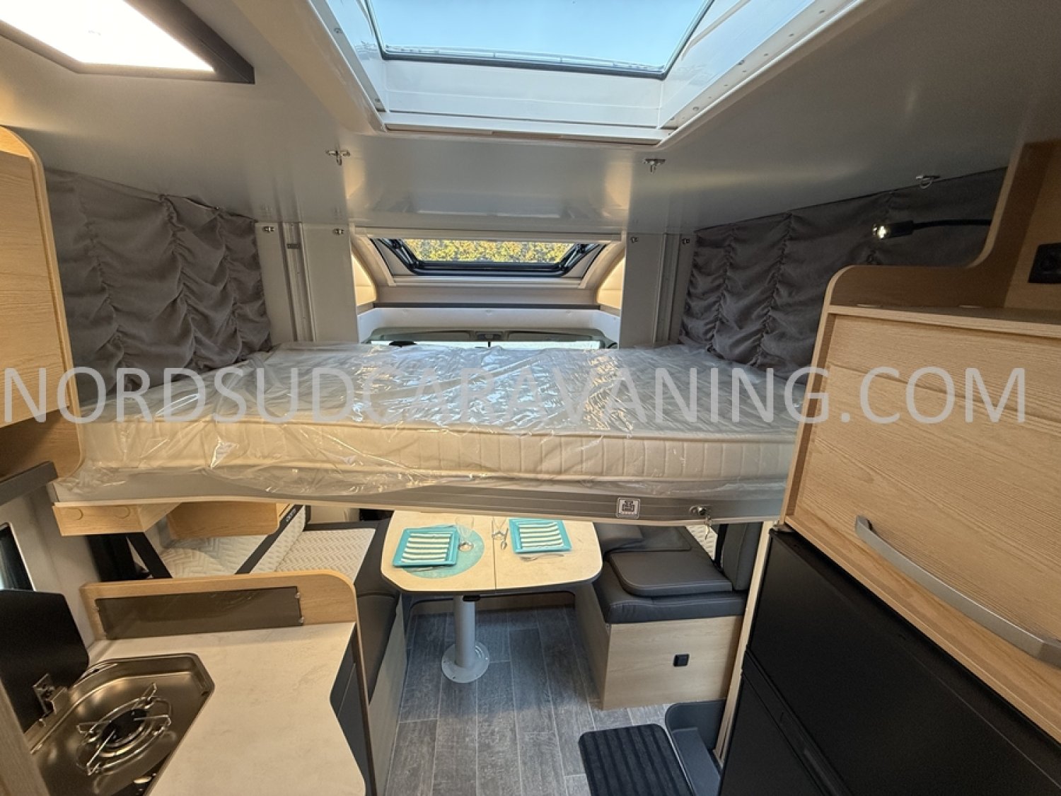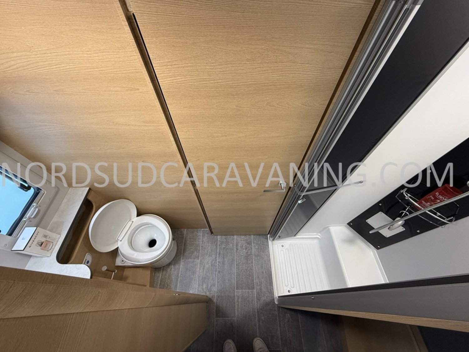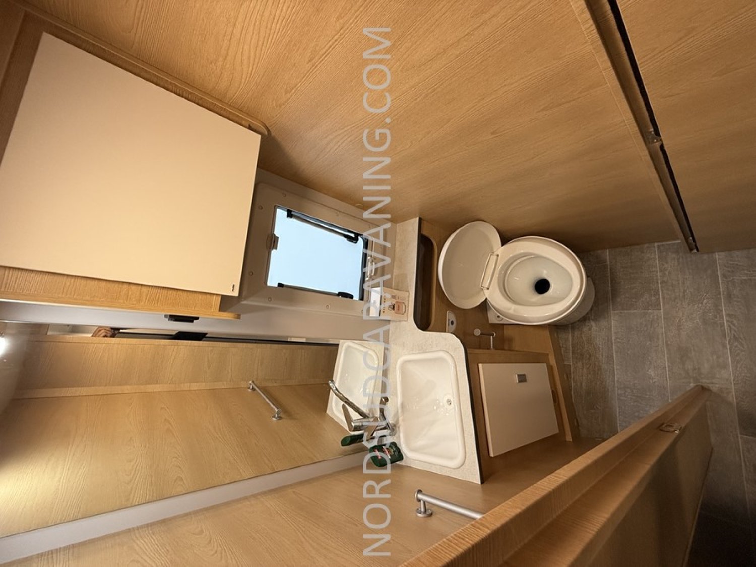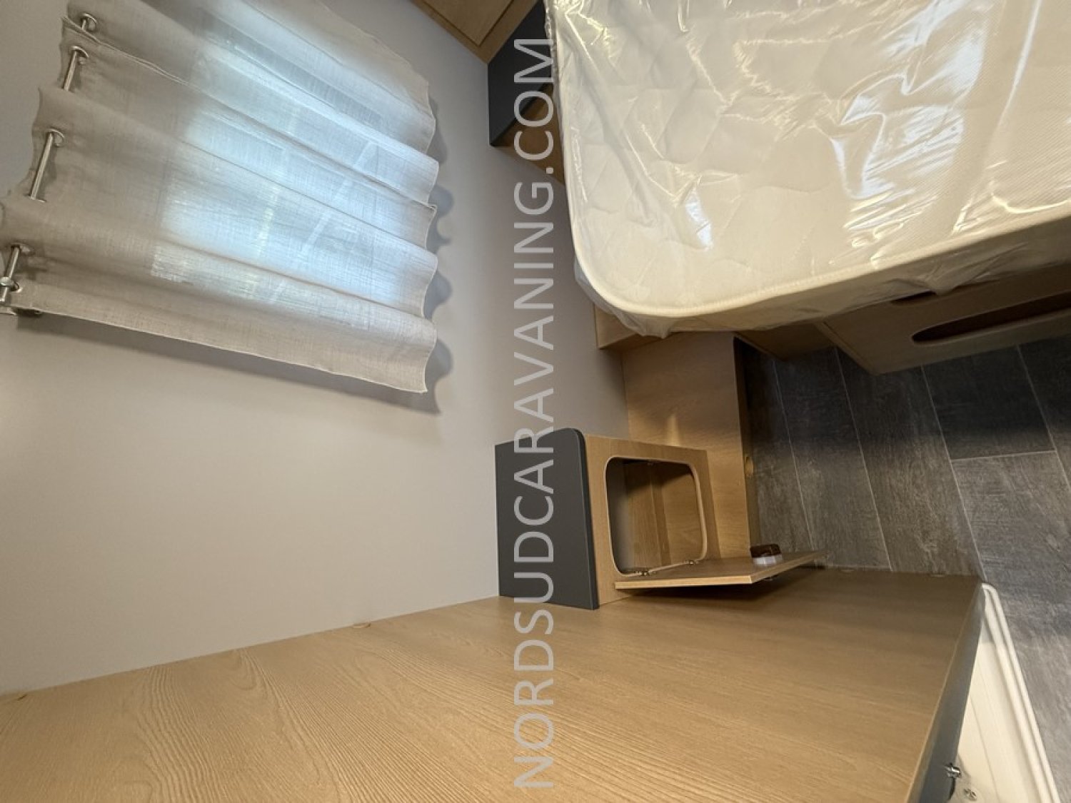 Il est doté également d’une cuisine équipée de plaque cuisson 2 feux, d’un évier inox et d’un grand réfrigérateur (160L), sans oublier son joli salon face à face avec table pliante et ses nombreux rangements astucieux. Sa spacieuse soute avec une capacité de rangements de 300kg est accessible de l'extérieur grâce à deux portillons.