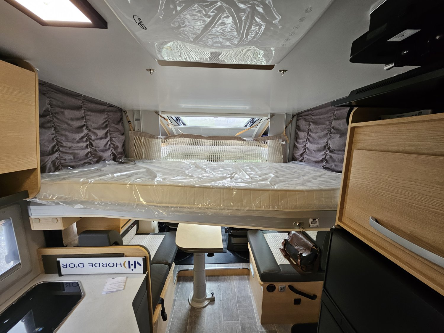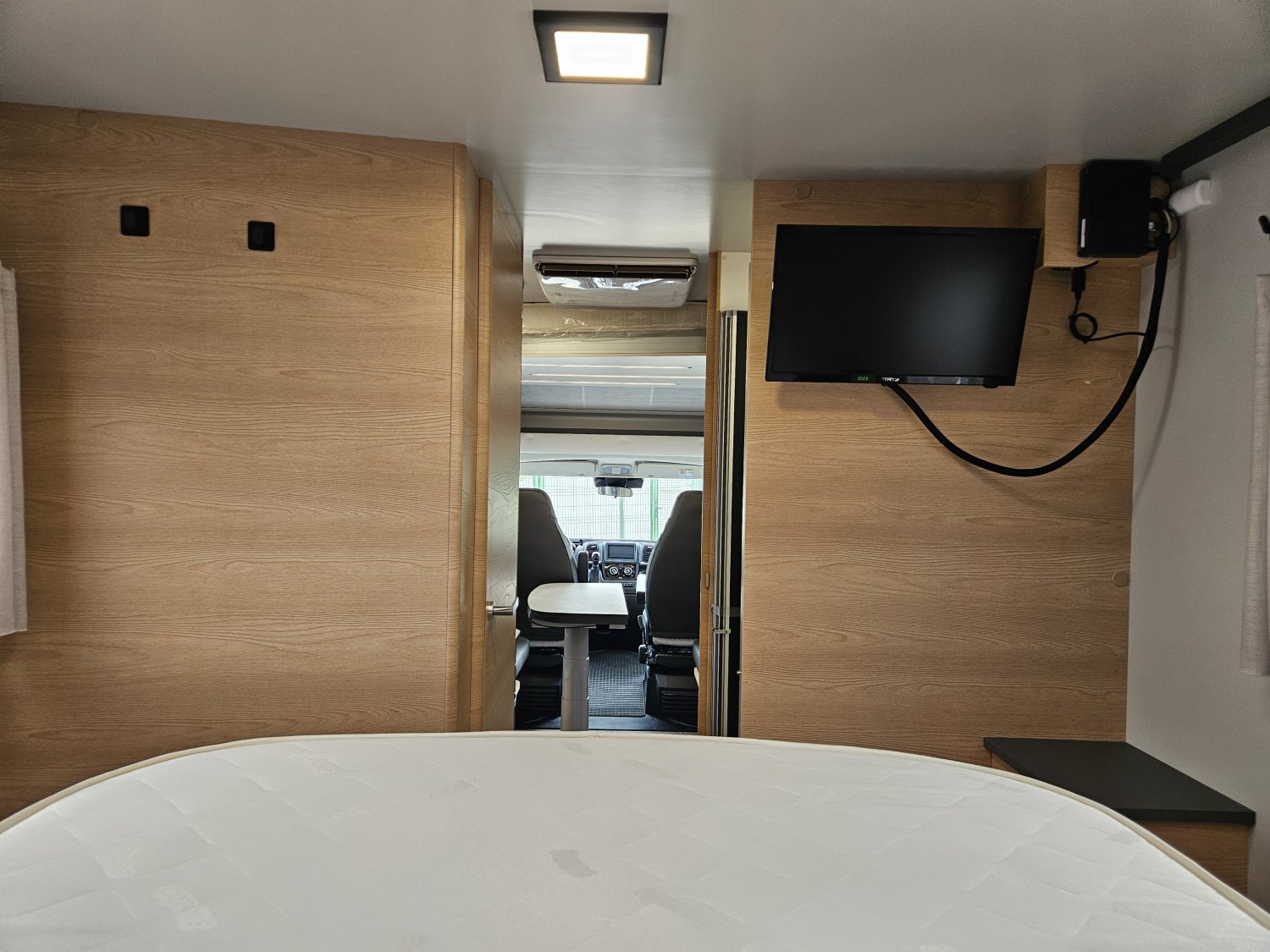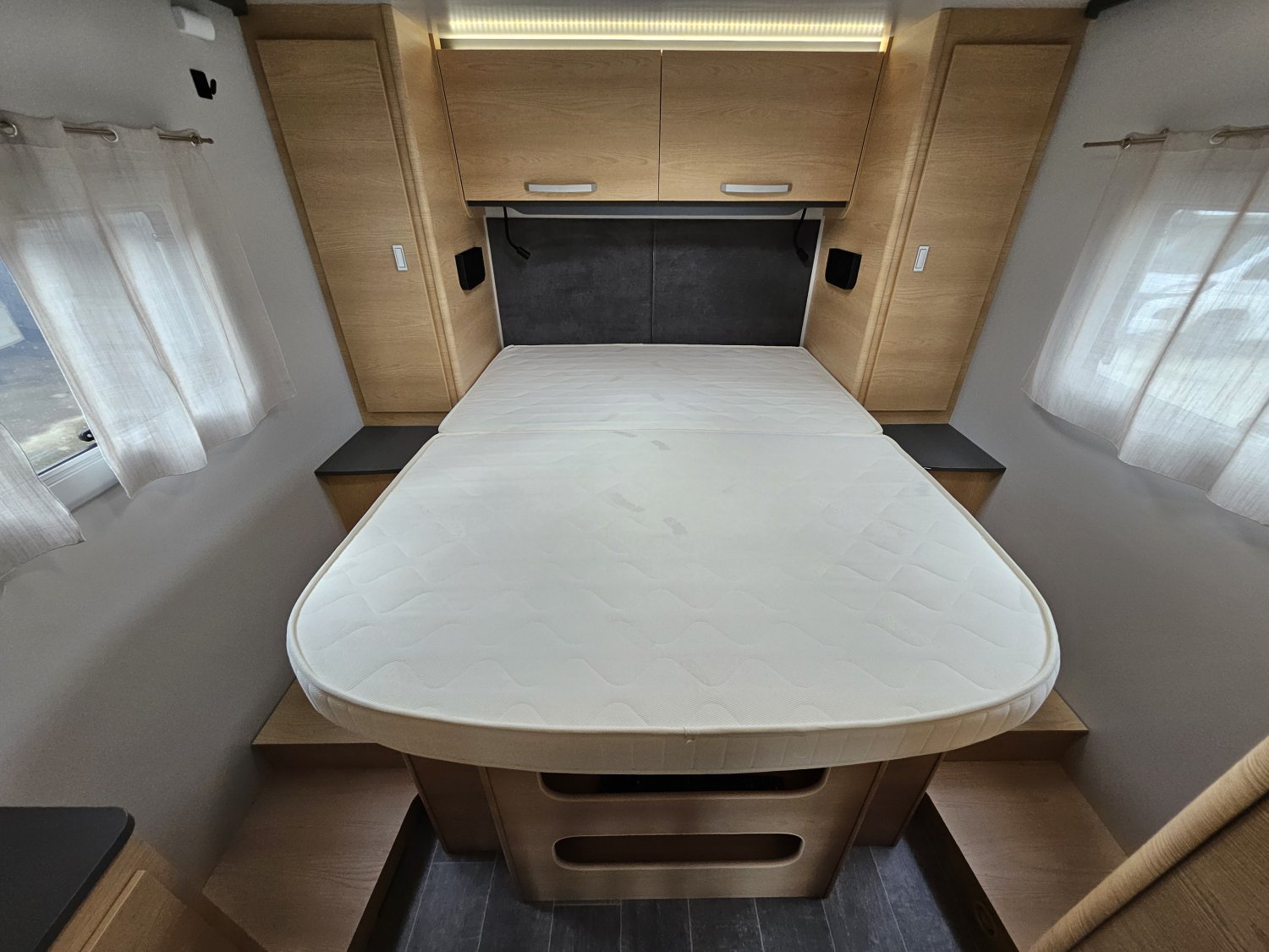 D'une longueur de 7,45 mètres, il offre un lit central à l'arrière, un lit pavillon électrique 2 places à l'avant et un couchage simple sur la dinette, une salle de bain avec douche séparée et un grand espace de vie.