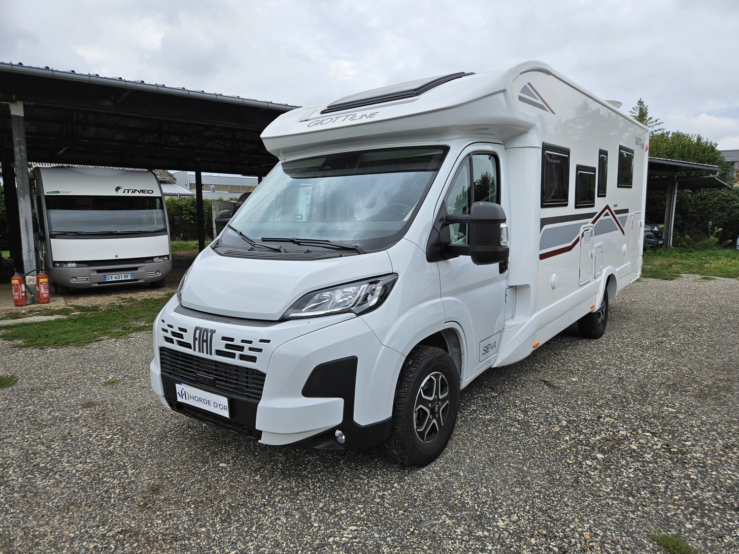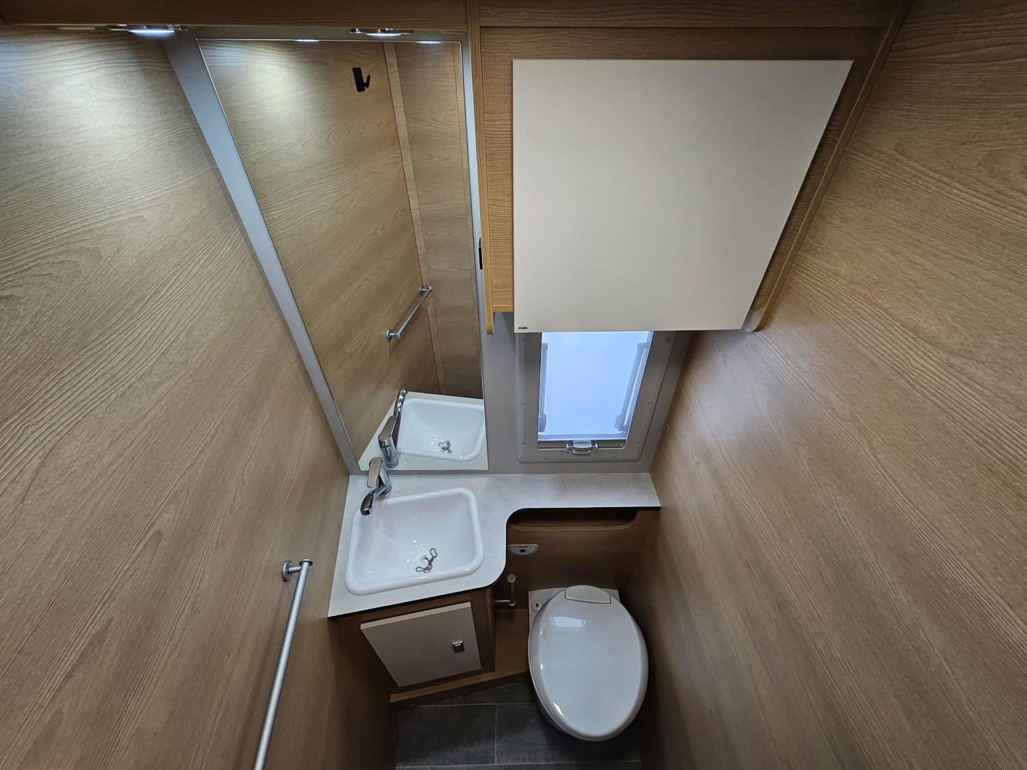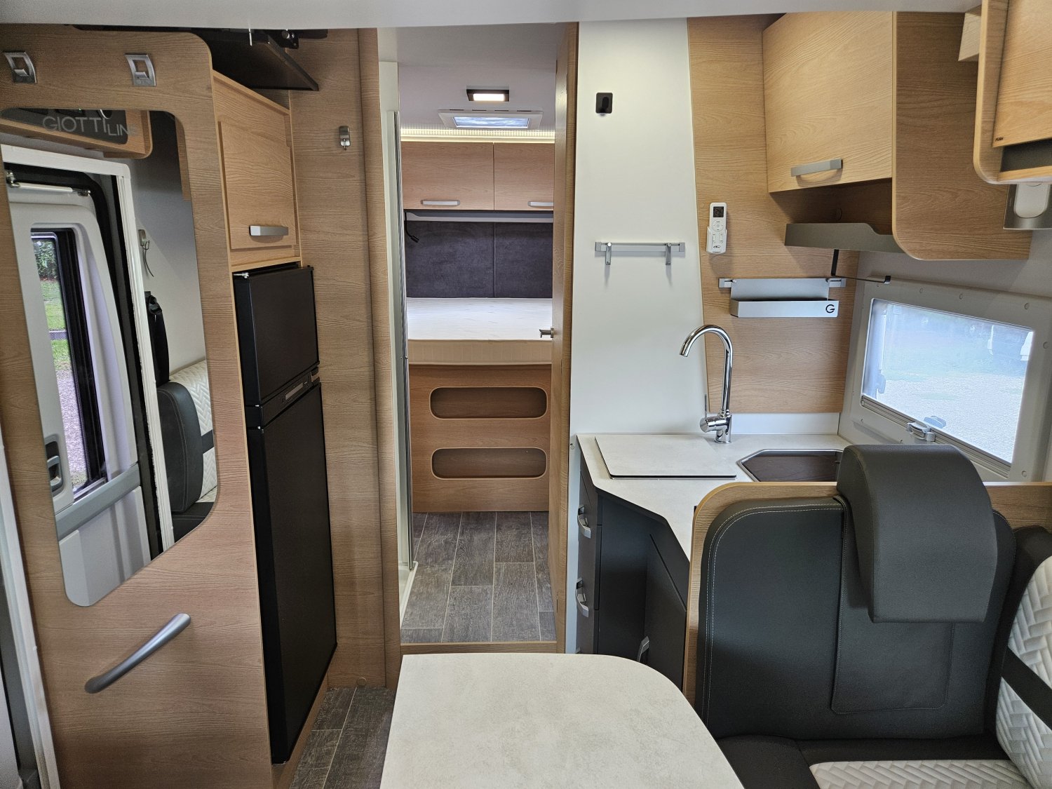 D'une longueur de 7,45 mètres, il offre un lit central à l'arrière, un lit pavillon électrique 2 places à l'avant et un couchage simple sur la dinette, une salle de bain avec douche séparée et un grand espace de vie.