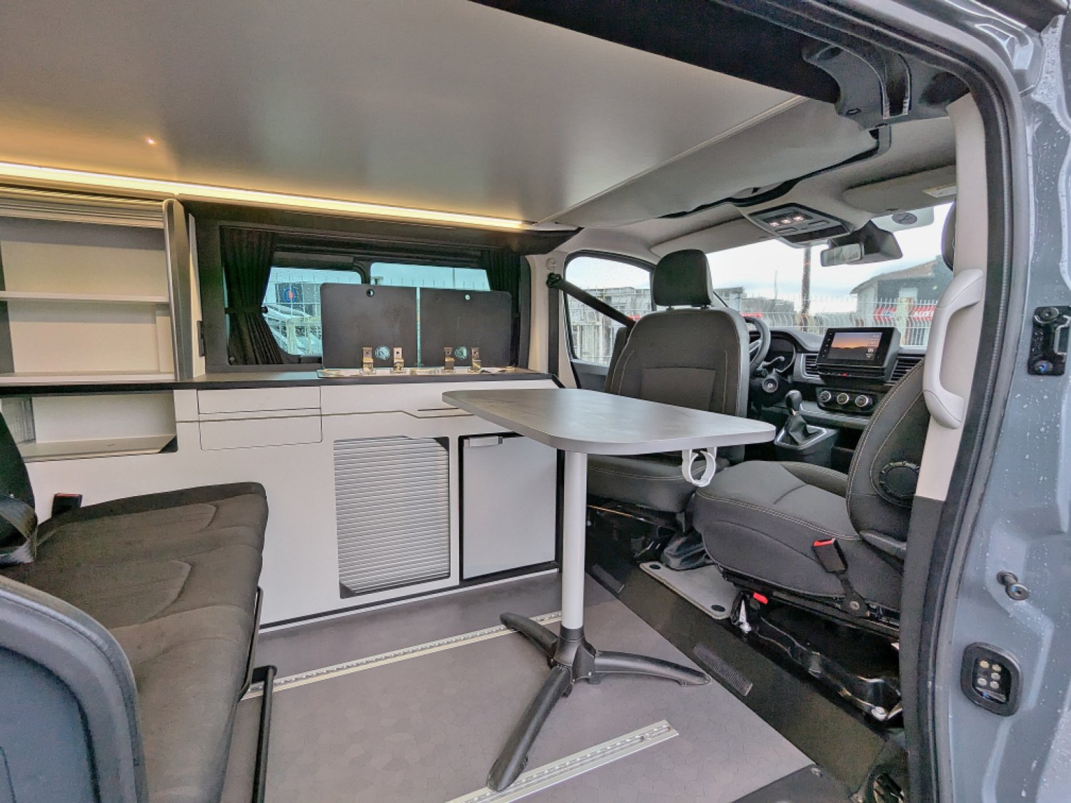 Van à toit relevable en parfait état sur Renault Trafic 2,0 dCi 150 cv en boîte automatique 6 vitesses. Ce van dispose d'une banquette rabbattable convertible en couchage de deux personnes, une cuisine droite avec plaque de cuisson au gaz et frigo à compression et d'un salon avant avec sièges pivotants. Le toit relevable manuellement peut accueillir deux adultes.