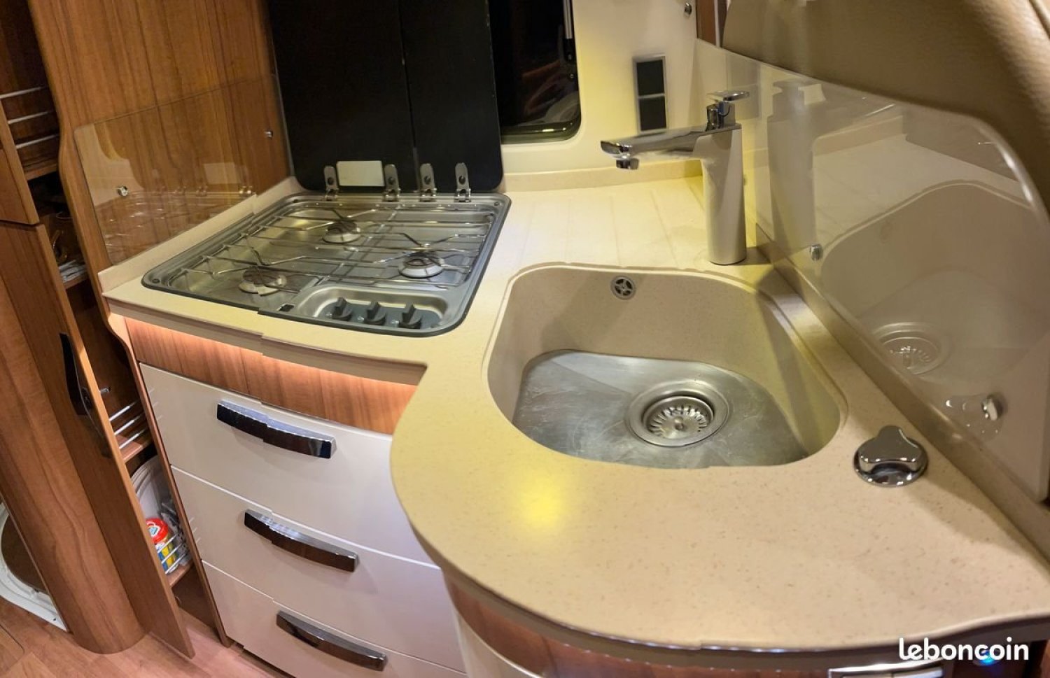 cuisine réchaud 3 feux – grand réfrigérateur (12v+230v+gaz) avec compartiment congélateur