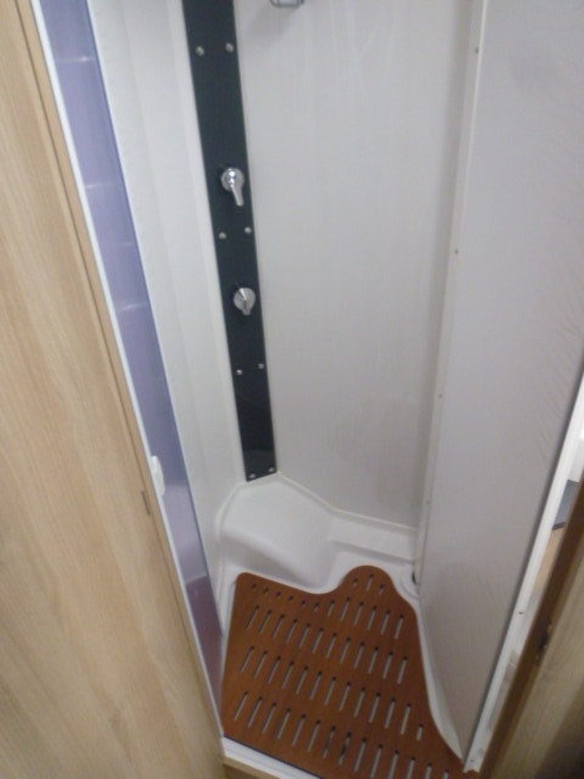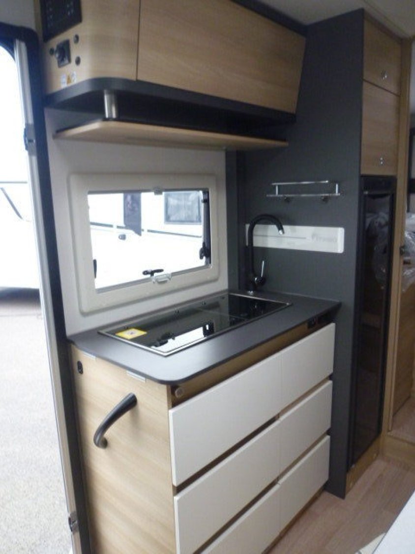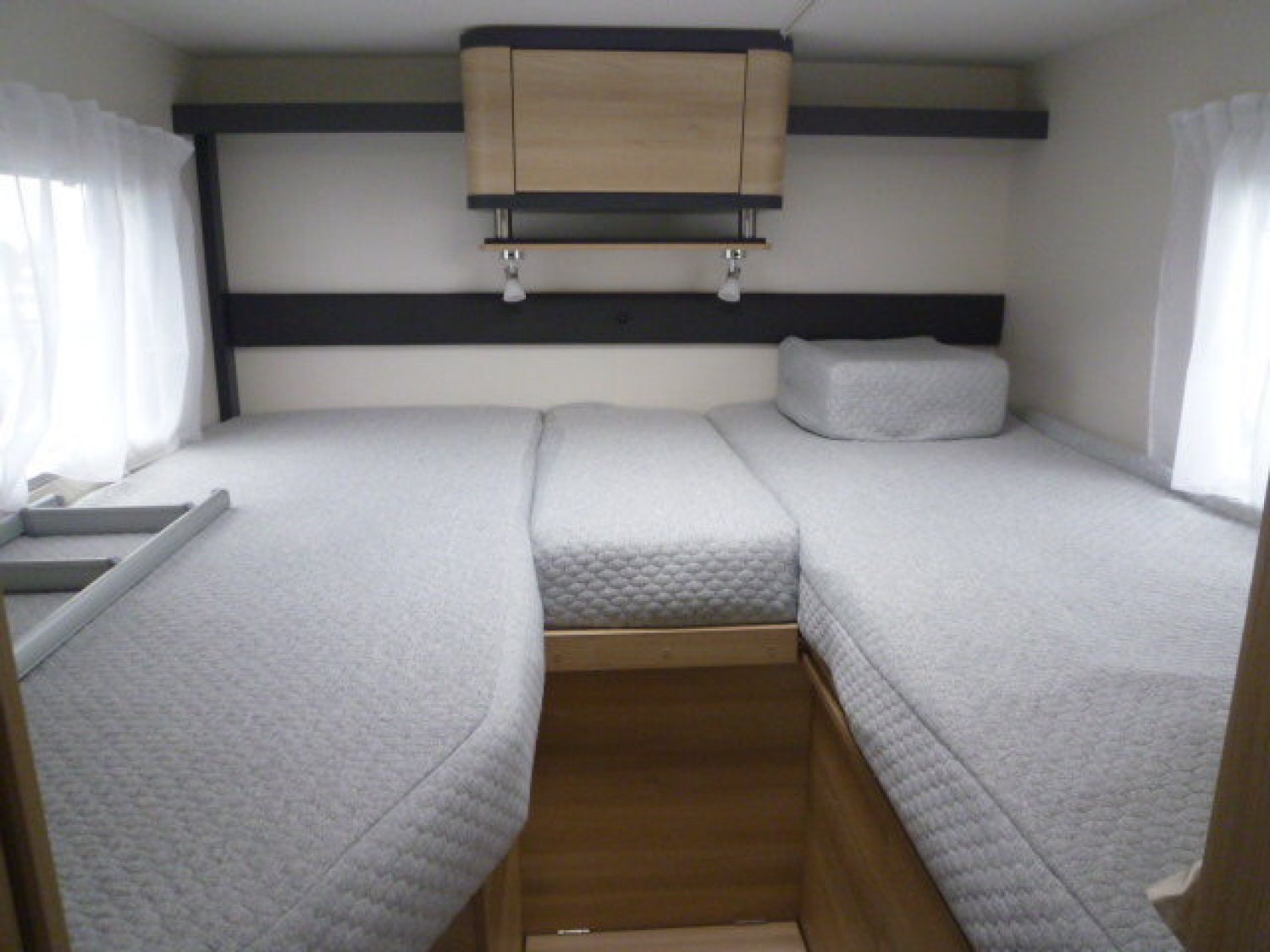 Cuisine en long, Douche à vario, Grande soute, lit jumeaux, lit pavillon cabine, Salon avant sièges pivotants, Salon en L, WC Cassette.