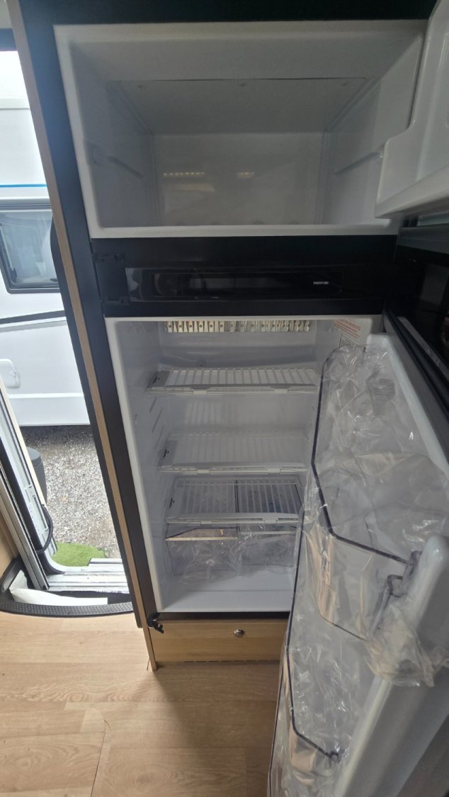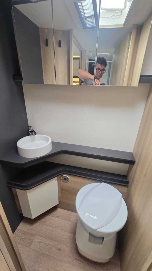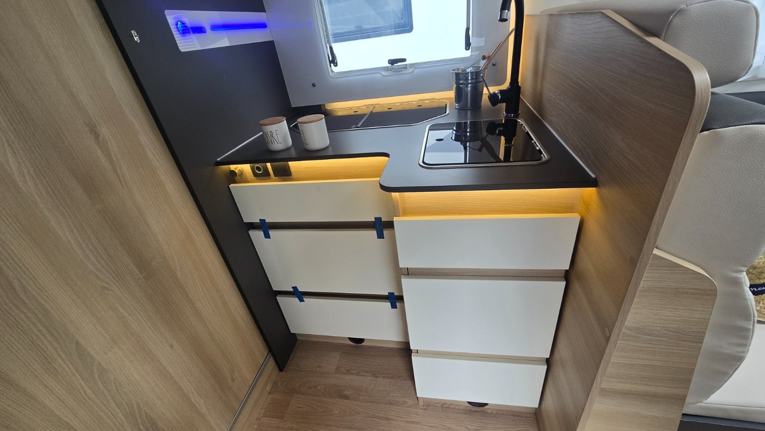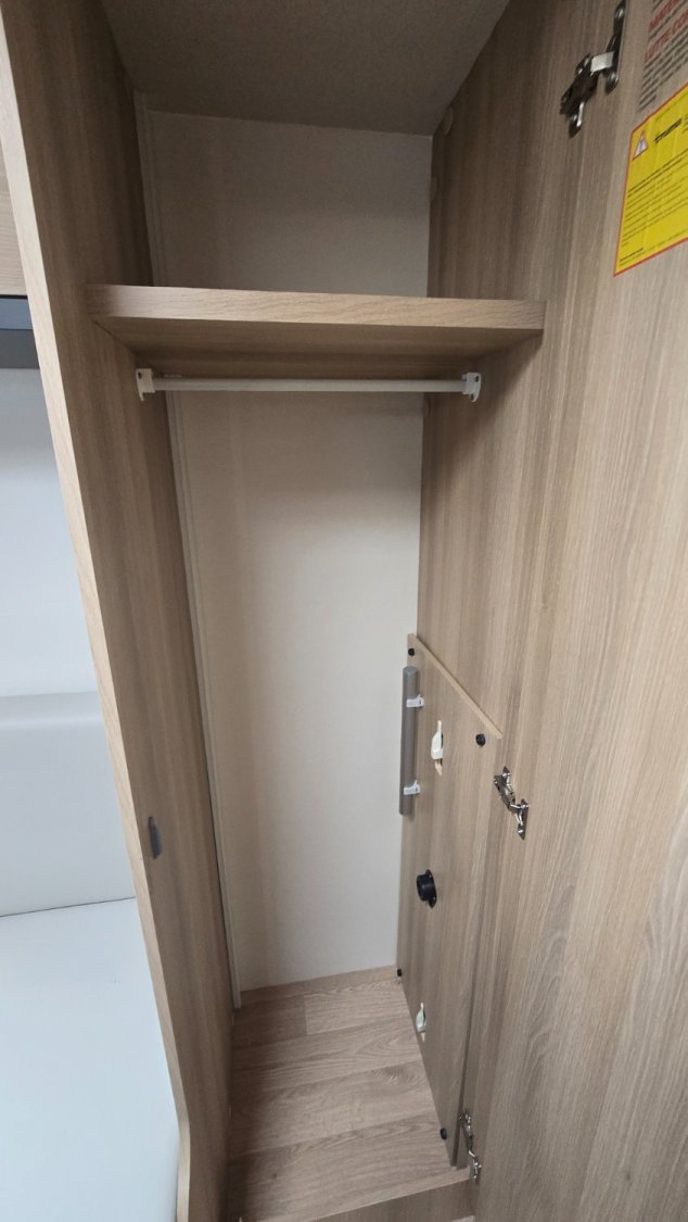 Chambre enfants avec 3 couchages, double penderie, douche séparée, évier inox avec grand plan de travail et réfrigérateur 145L et un grand salon.