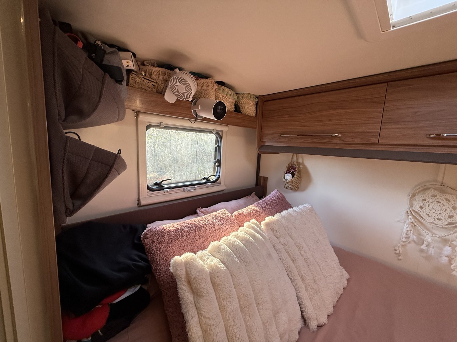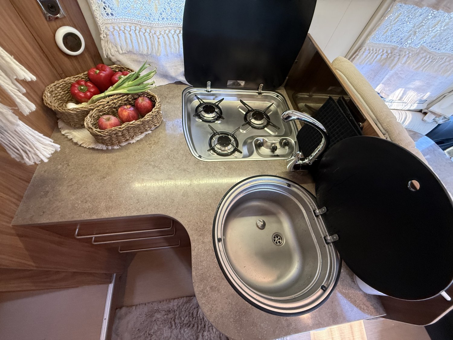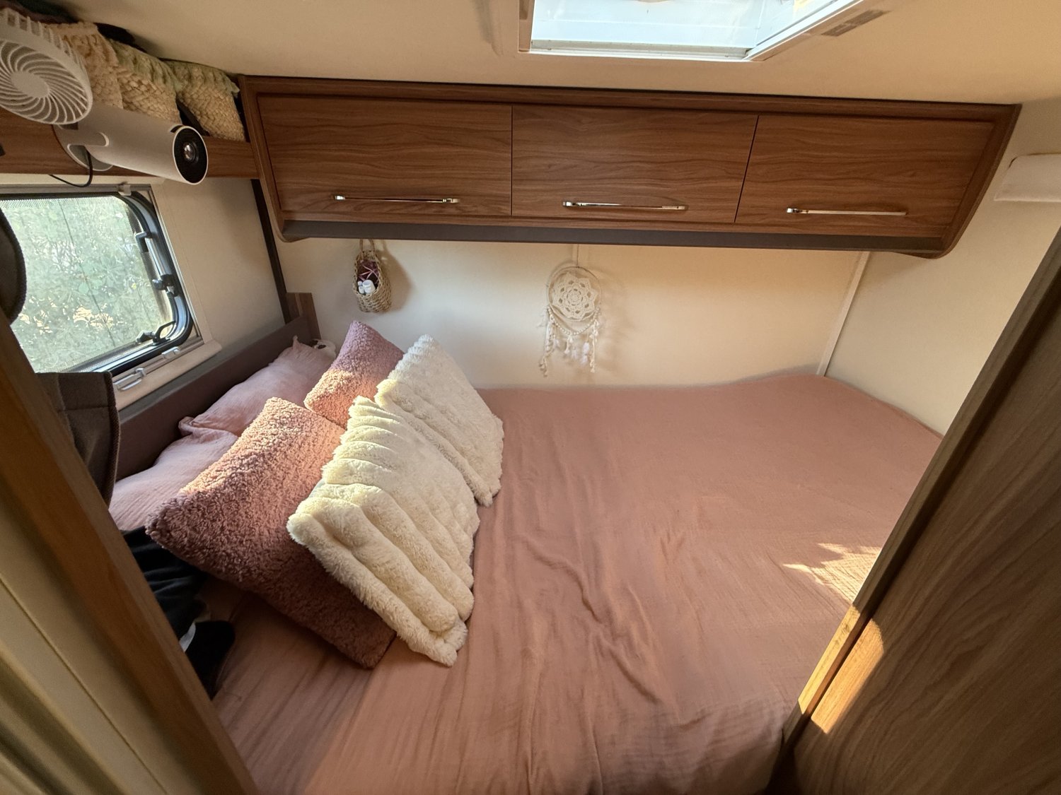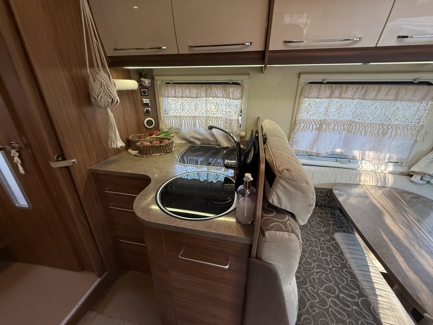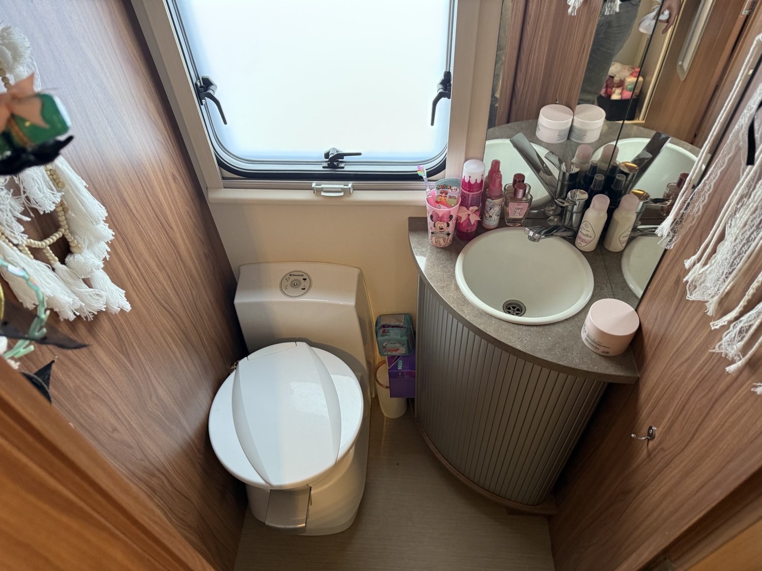 La cuisine équipée, le salon convivial avec sièges cabine pivotants et la salle d’eau avec douche indépendante créent une vraie sensation de confort au quotidien. La présence d’une douche rigide séparée du WC est un atout rarement rencontré sur un camping-car de moins de 7 mètres, rendant les séjours plus agréables en toutes saisons.