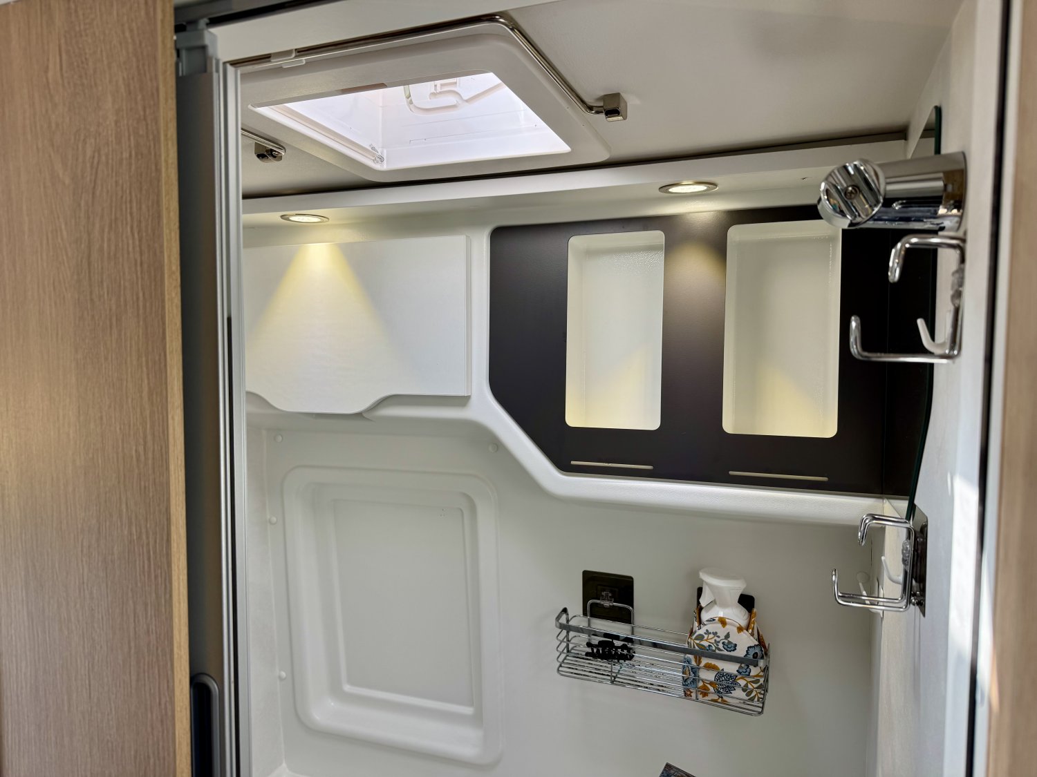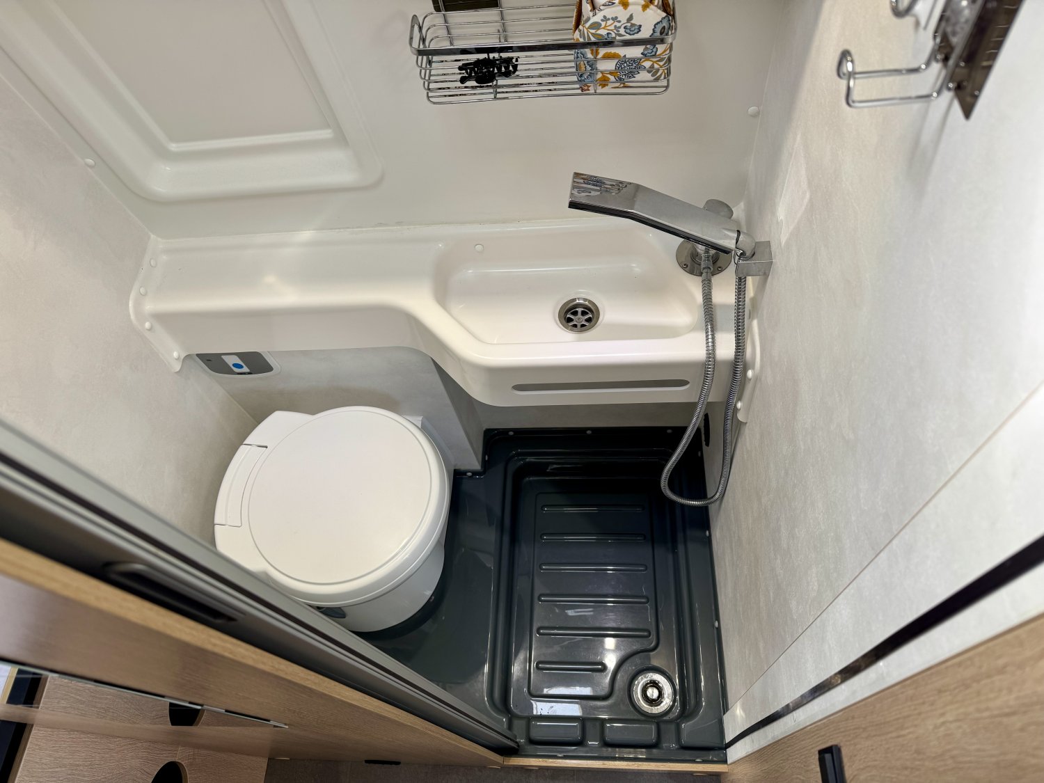 Cabine de douche indépendante, WC à cassette et lavabo escamotable pour un maximum d’ergonomie.