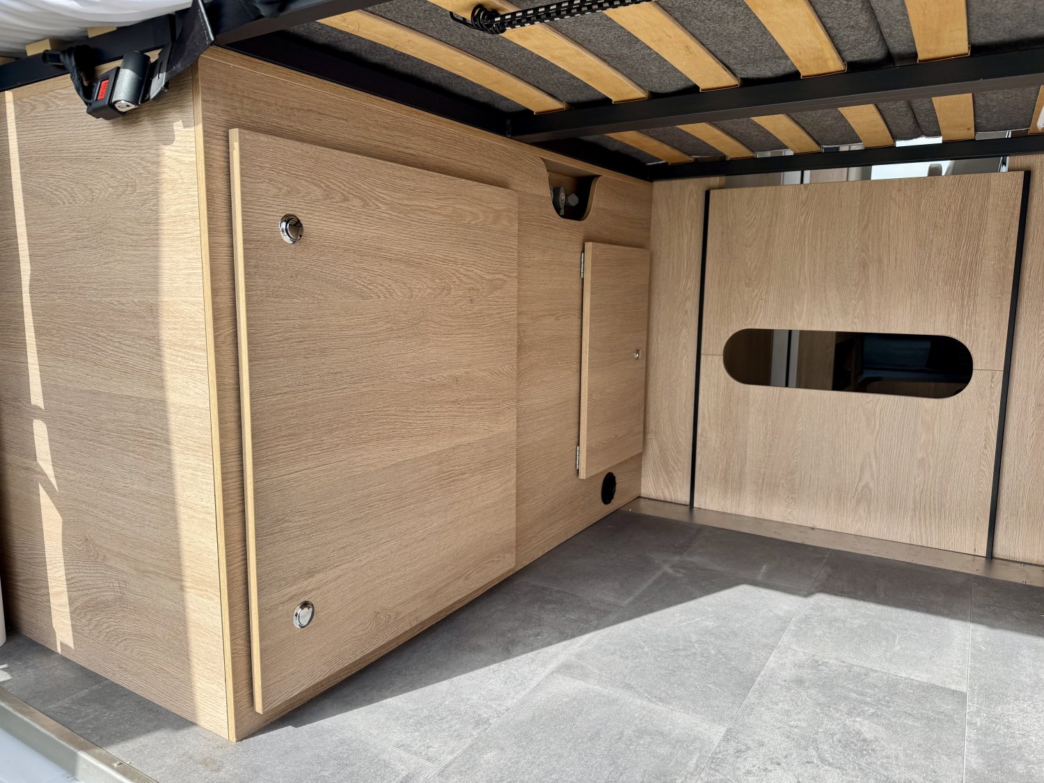 Grand lit double confortable à l’arrière avec sommier et matelas de qualité, rangements en soute sous le couchage.