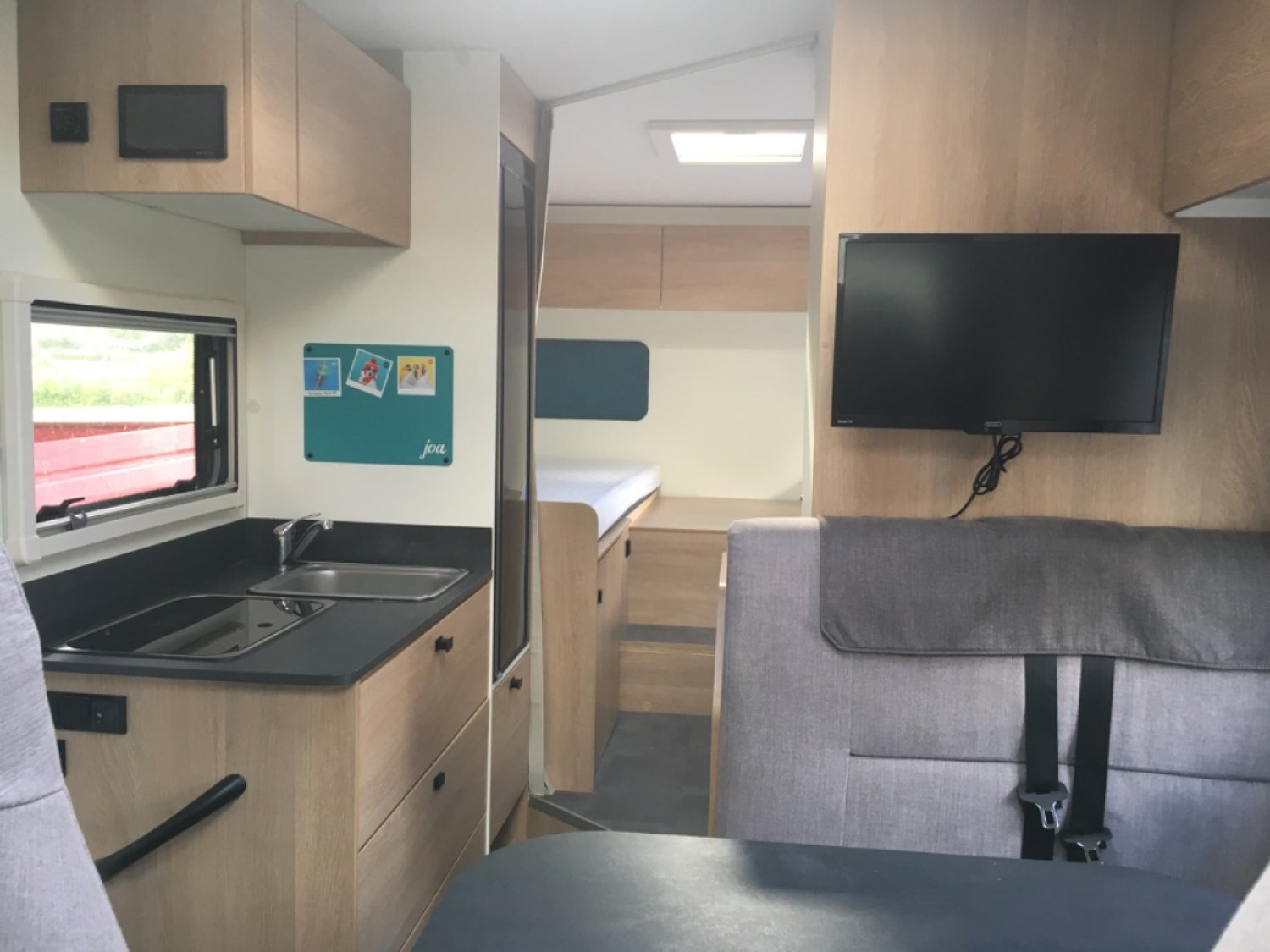 Moins de 7 mètres, modèle 2024 état proche du neuf, grand salon convivial, lits jumeaux,