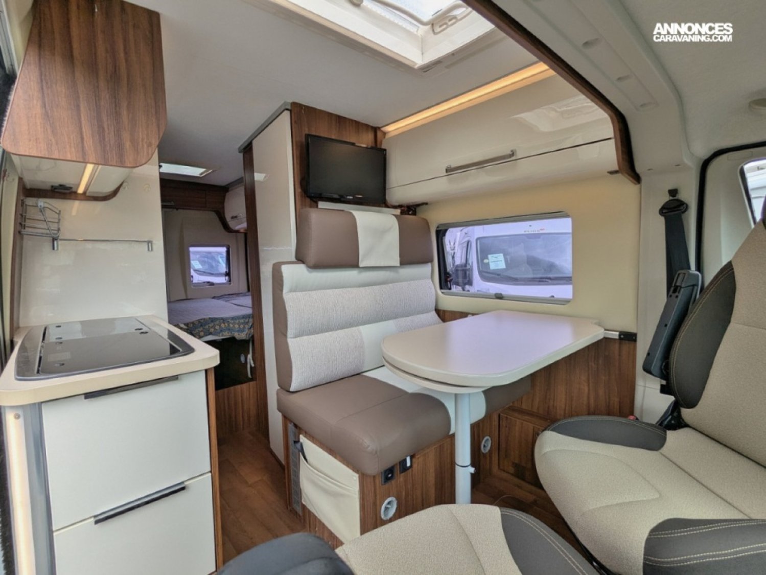 Fourgon aménagé de 5,99 m sur Fiat 2,3 JTD 130 cv avec lit transversal, salle d'eau avec WC et douche, cuisine équipée de frigo, plaque gaz 2 feux et de nombreux tiroirs fonctionnels, et salon avant avec sièges pivotants.