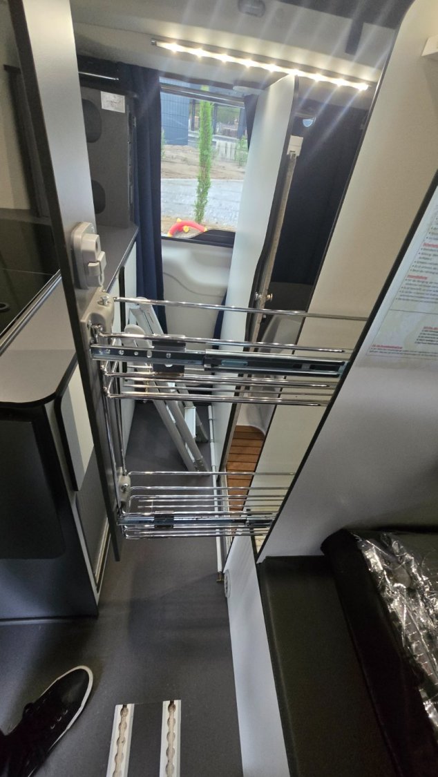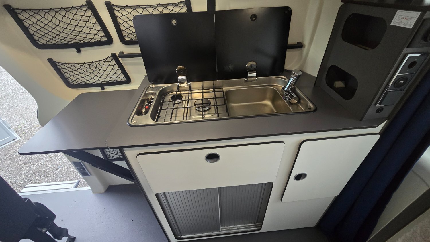Comprenant un salon banquette transformable en couchage pour 2 personnes + le toit relevable pour 2 personnes . Un côté cuisine très bien aménagé avec 2 feux de cuisson, un évier et de nombreux rangements.