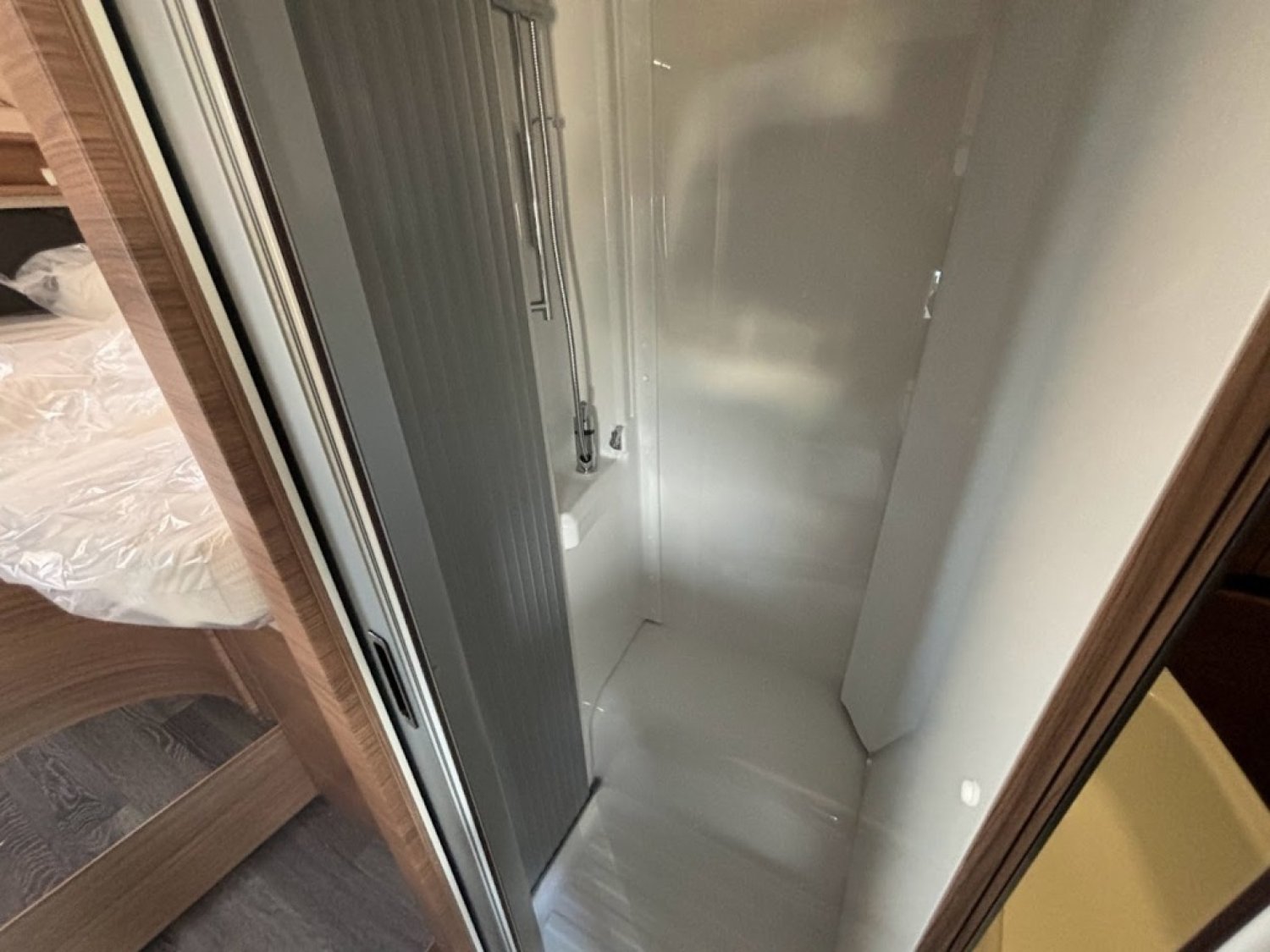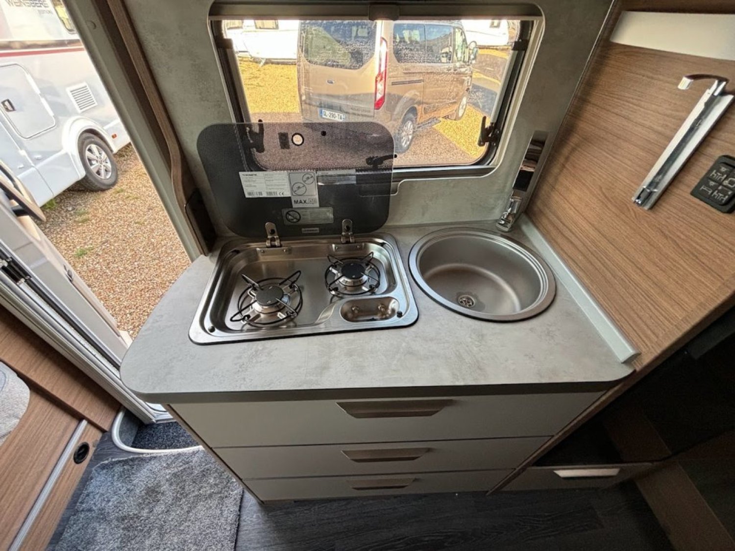 Cuisine en long, Douche à vario, Grande soute, lit pavillon, Lits jumeaux sur soute, Salon avant sièges pivotants, Salon en L, WC Cassette.