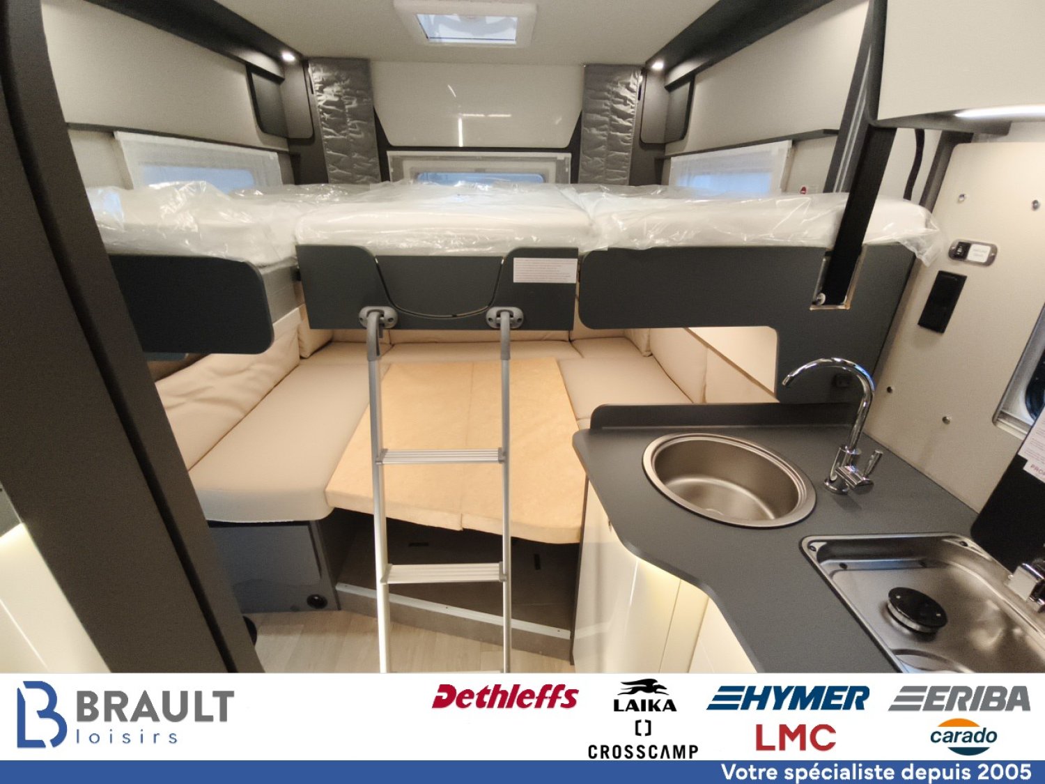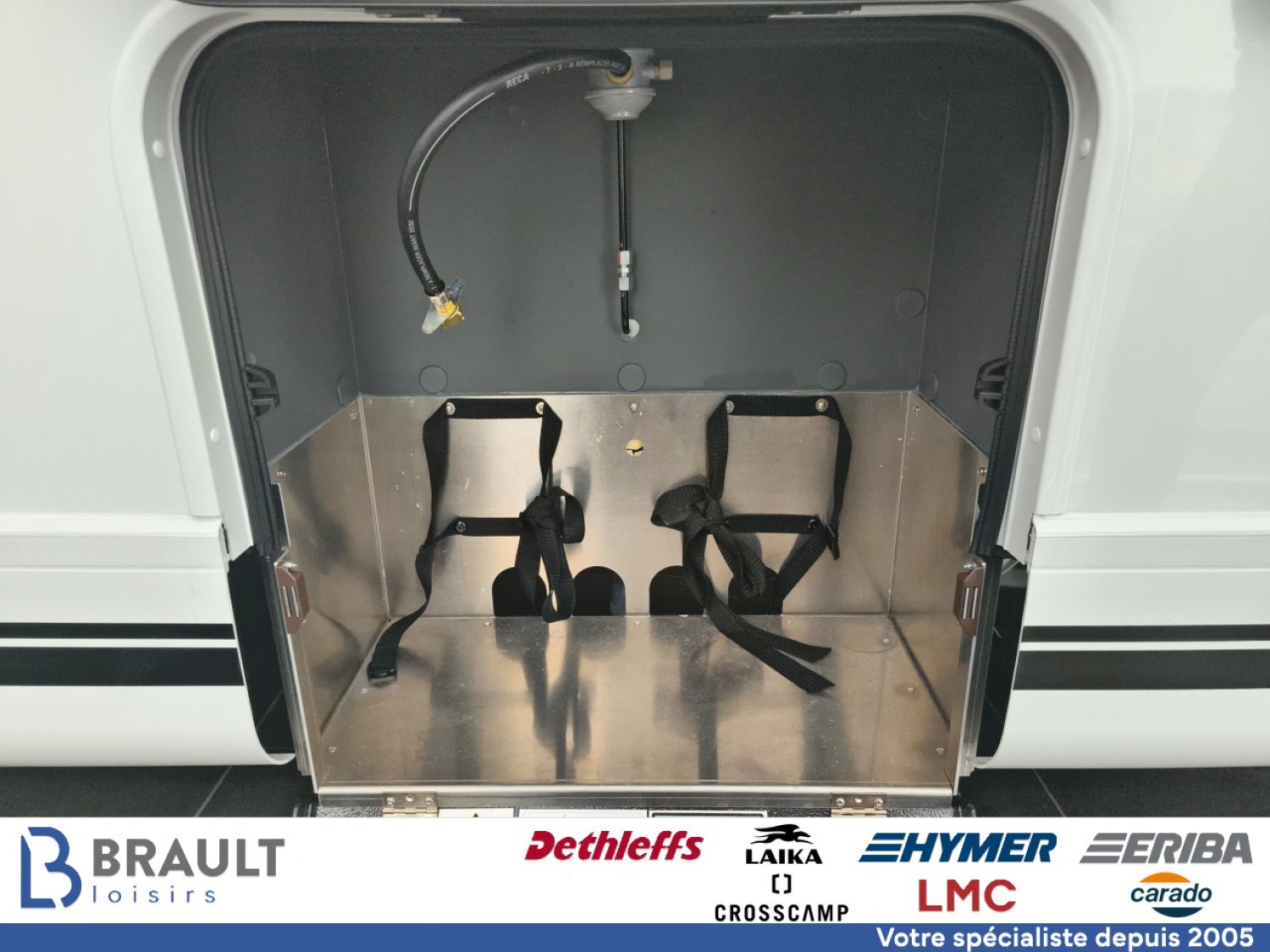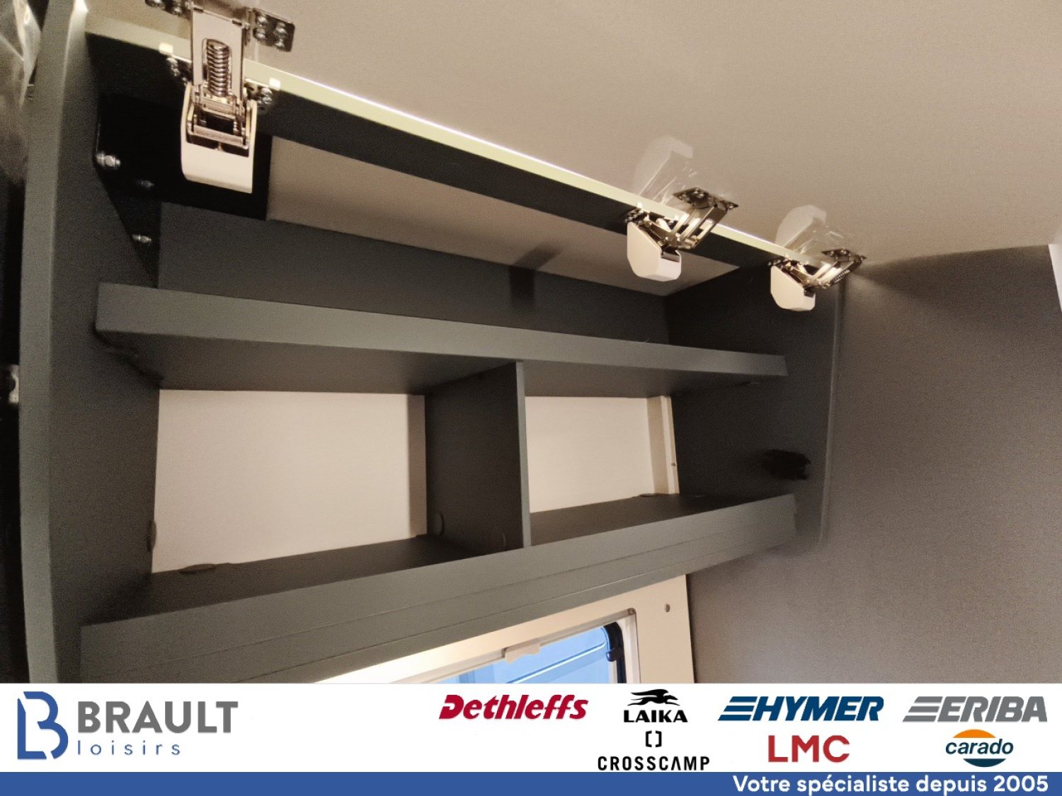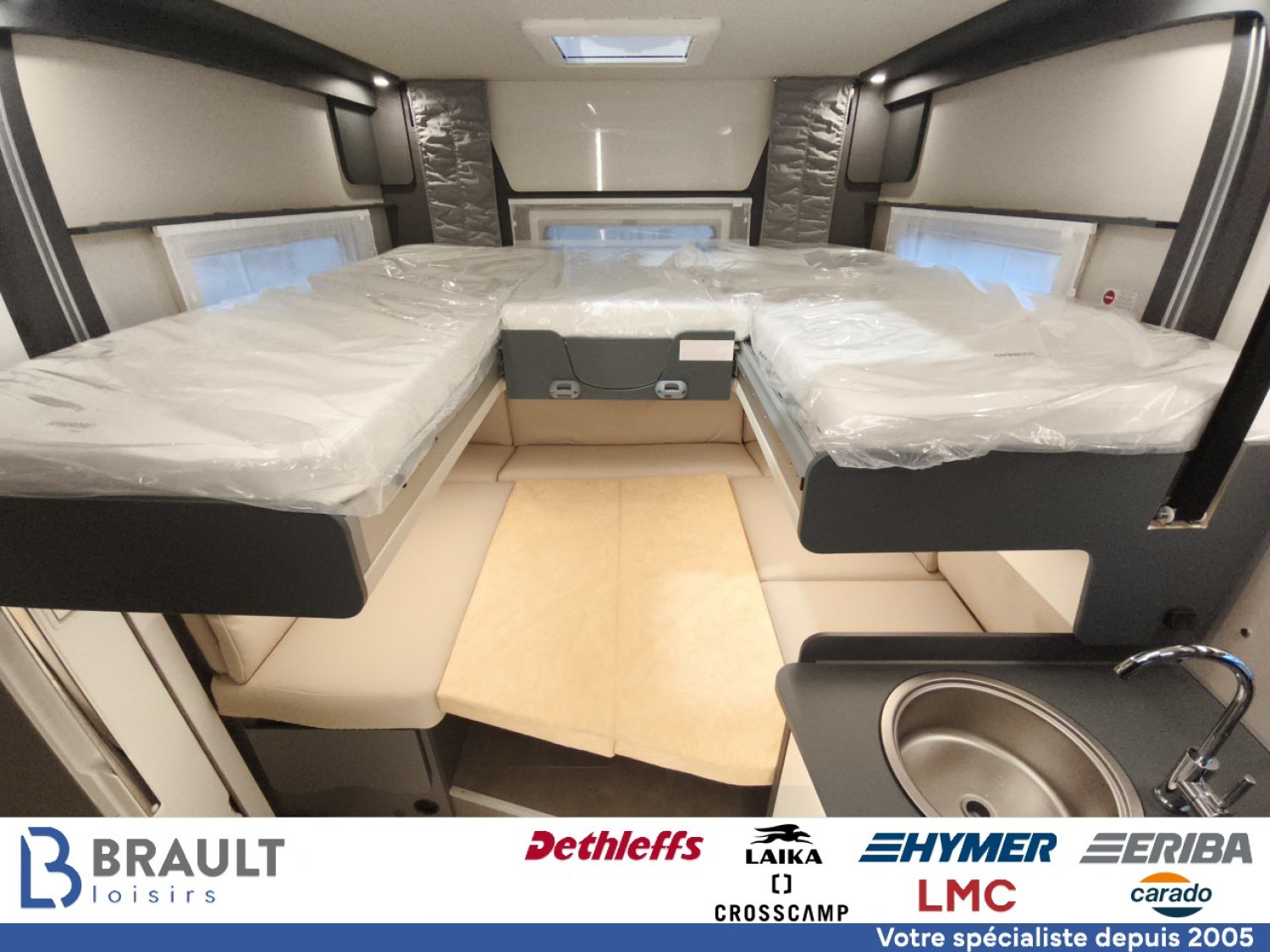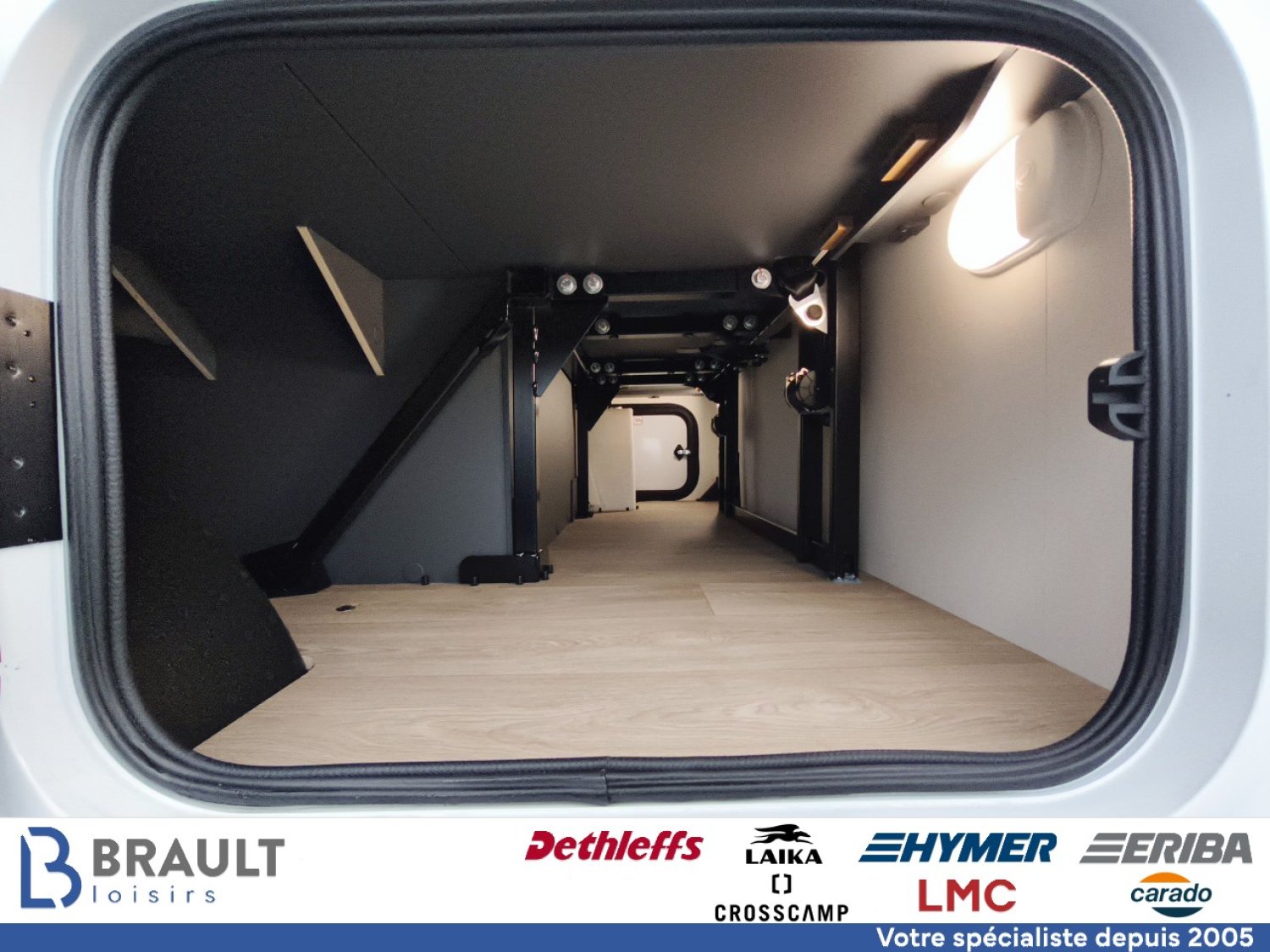 (réservoir d'eaux usées isolé et chauffé, lanterneau Skyview, hotte aspirante, prédisposition caméra de recul, stores plissés occultants de cabine, prédisposition panneau solaire, caillebotis de douche, tapis de cabine, porte cellule premium XL, habillage des parois de la chambre à coucher arrière en simili-cuir, grand tiroir et porte-bouteille coulissant dans la cuisine)
