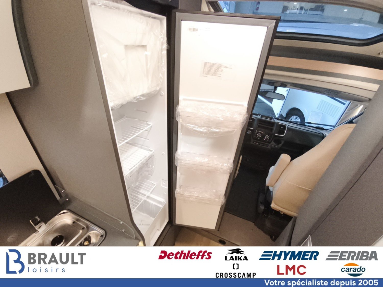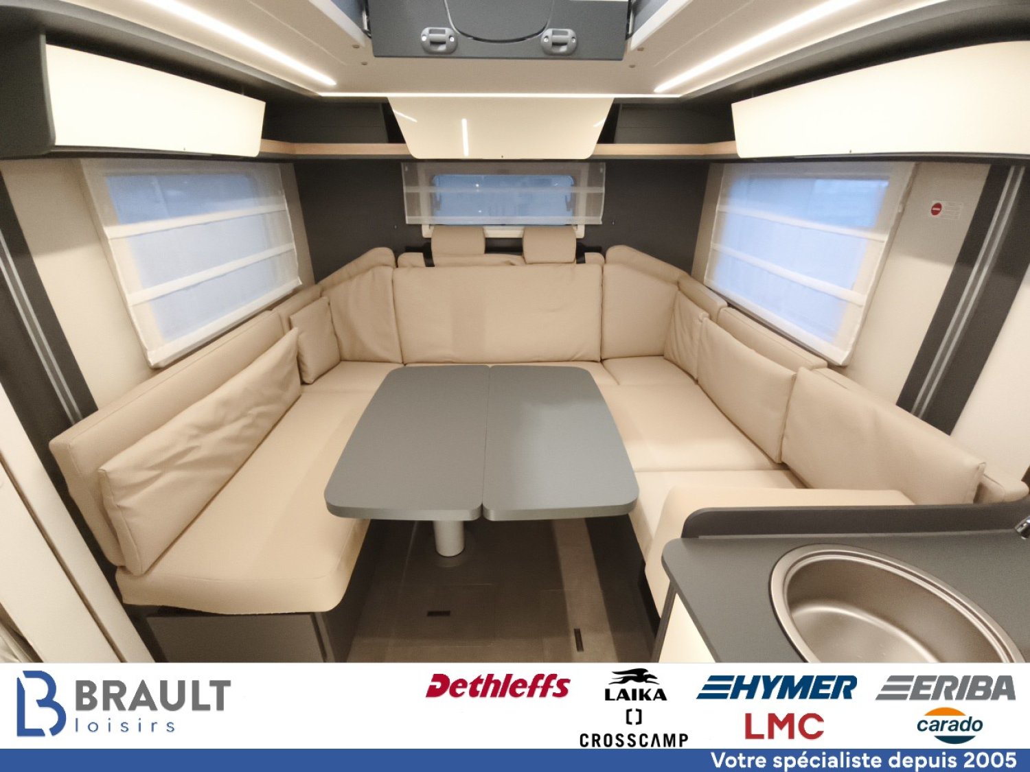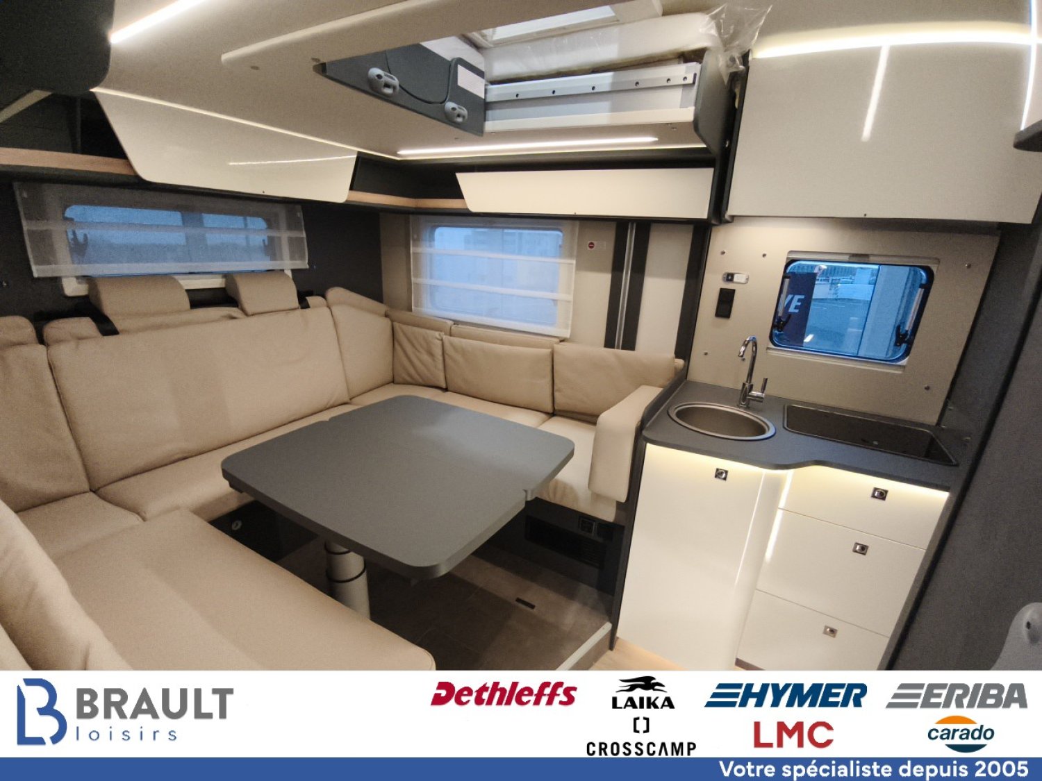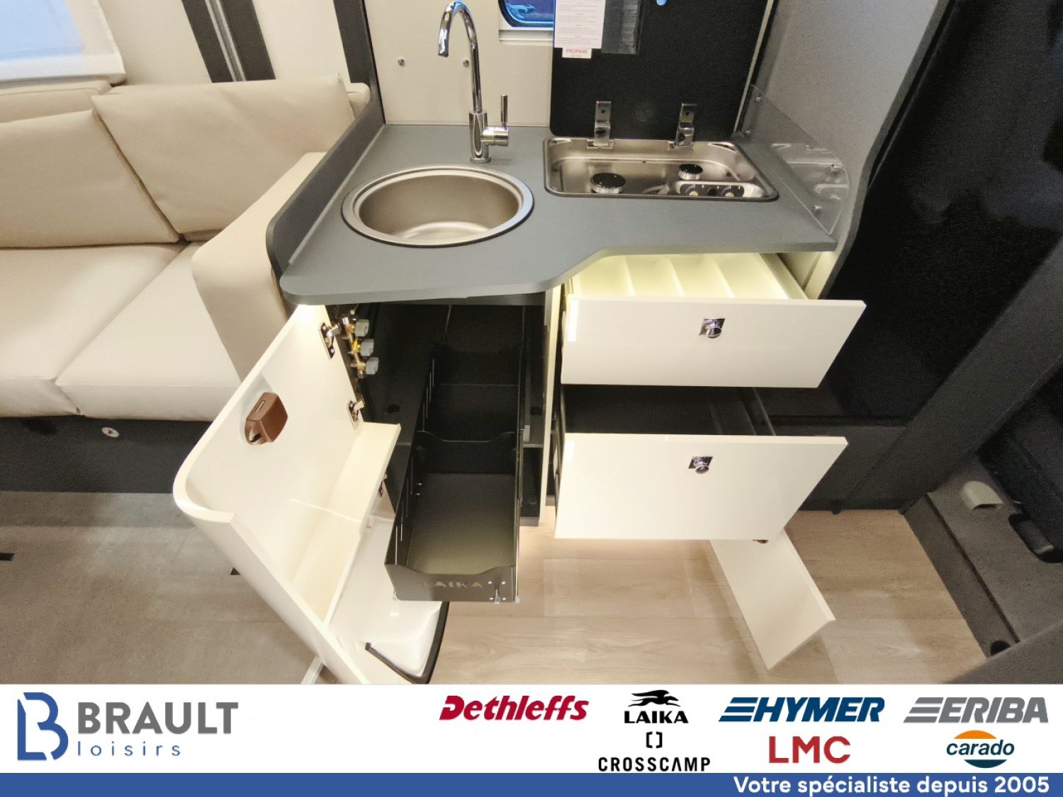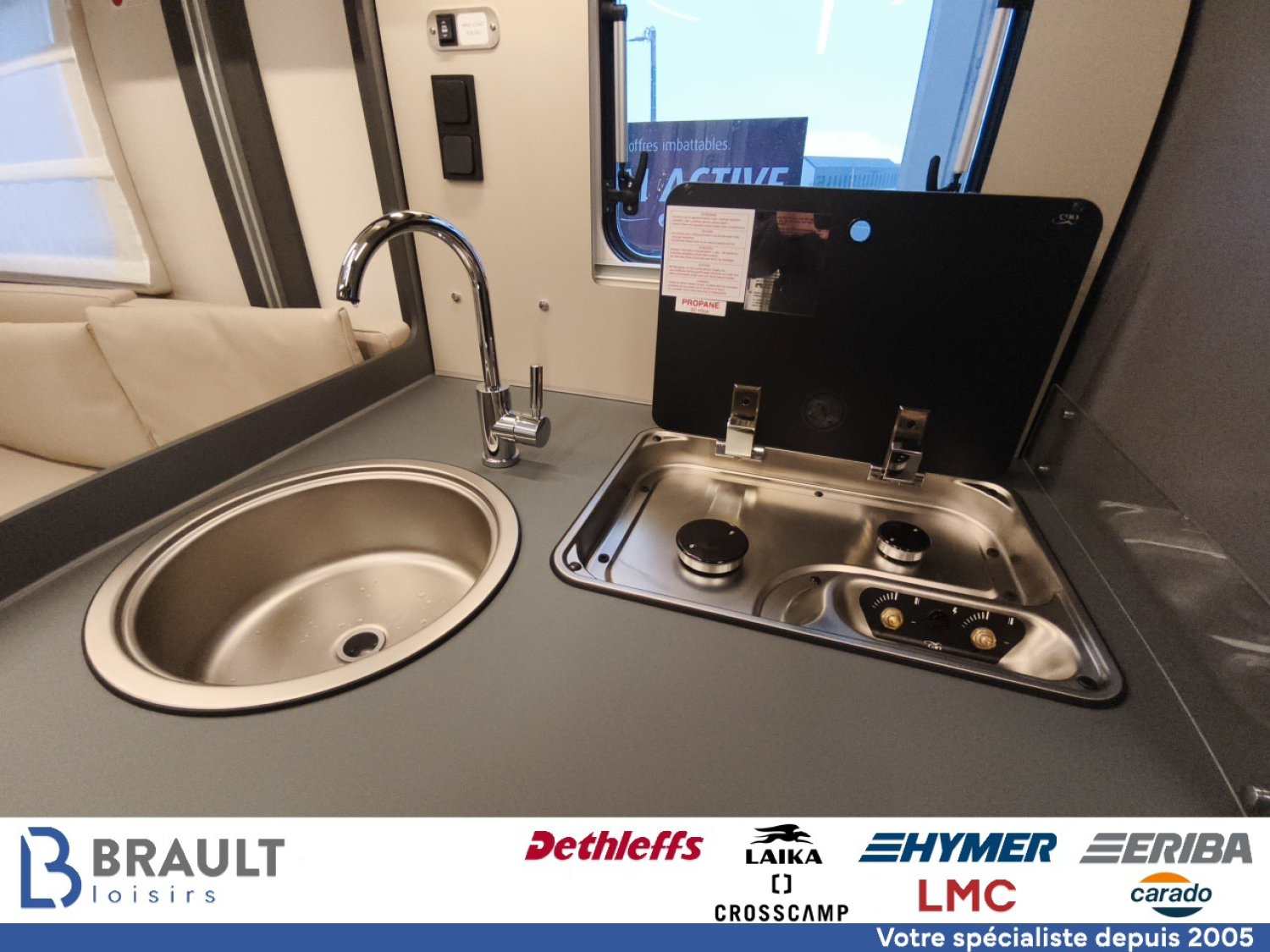 (réservoir d'eaux usées isolé et chauffé, lanterneau Skyview, hotte aspirante, prédisposition caméra de recul, stores plissés occultants de cabine, prédisposition panneau solaire, caillebotis de douche, tapis de cabine, porte cellule premium XL, habillage des parois de la chambre à coucher arrière en simili-cuir, grand tiroir et porte-bouteille coulissant dans la cuisine)