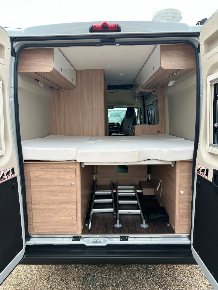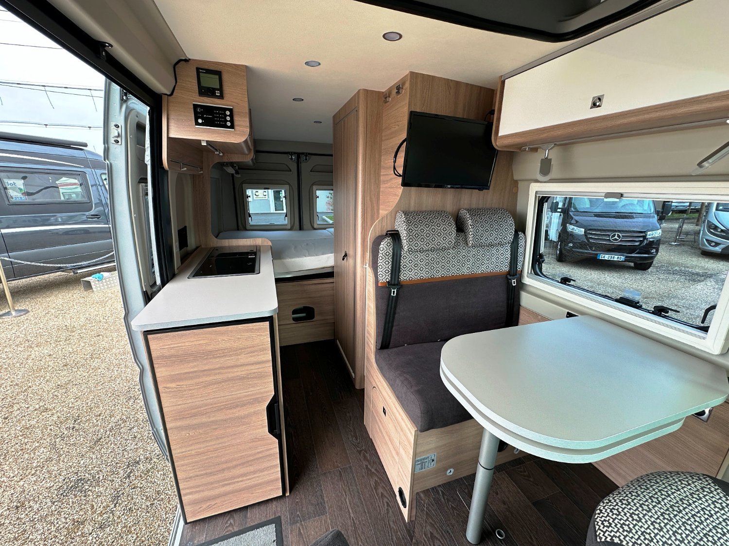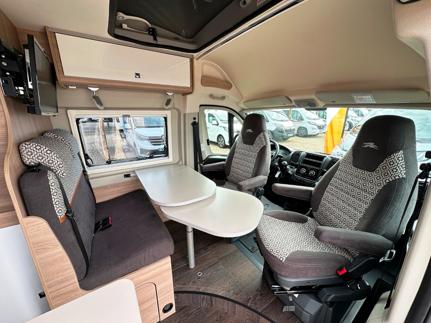 Fourgon Laïka (5.99 M), 4 couchages, lit transversal (possibilité de dégager le couloir), vaste salle de bain avec douche intégrée, salon avant avec sièges pivotant, table centrale, cuisine droite équipée de nombreux rangements et d’un frigo par compression, toit relevable et lit pavillon supplémentaire pour deux adultes.