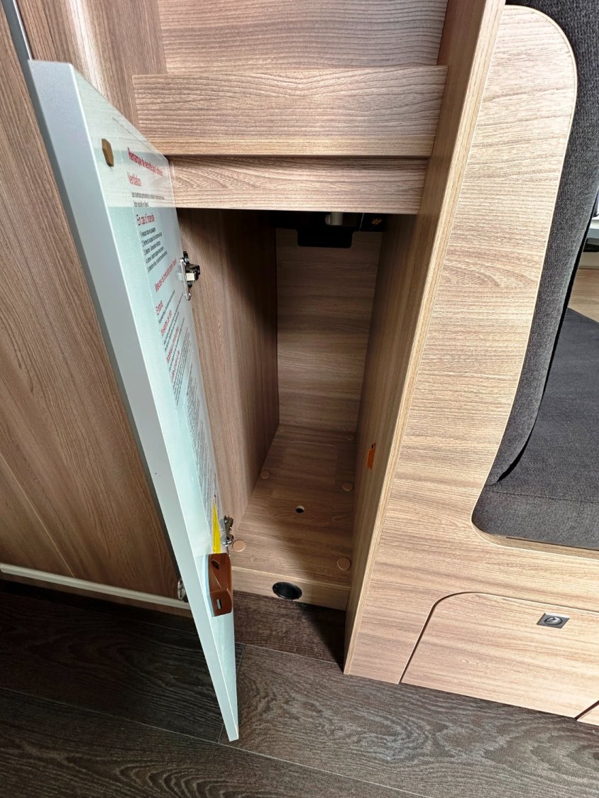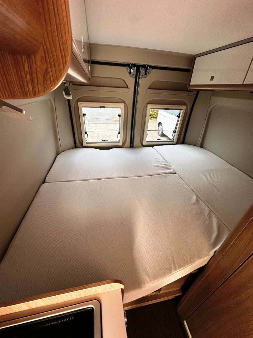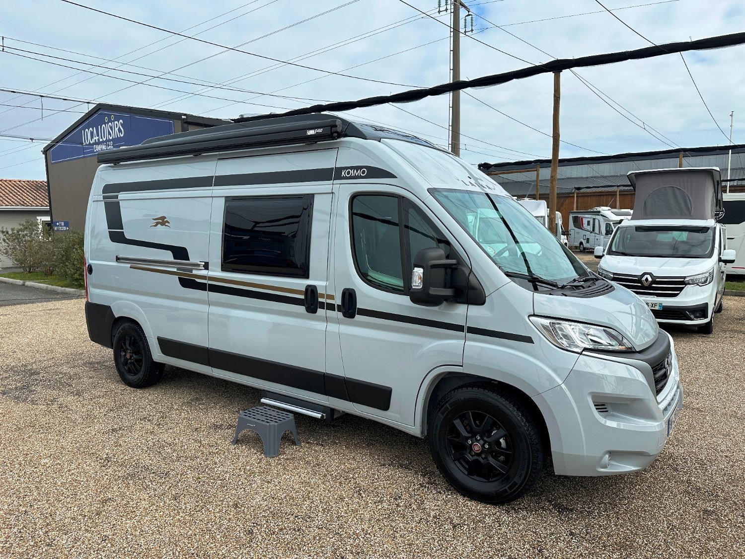 Fourgon Laïka (5.99 M), 4 couchages, lit transversal (possibilité de dégager le couloir), vaste salle de bain avec douche intégrée, salon avant avec sièges pivotant, table centrale, cuisine droite équipée de nombreux rangements et d’un frigo par compression, toit relevable et lit pavillon supplémentaire pour deux adultes.