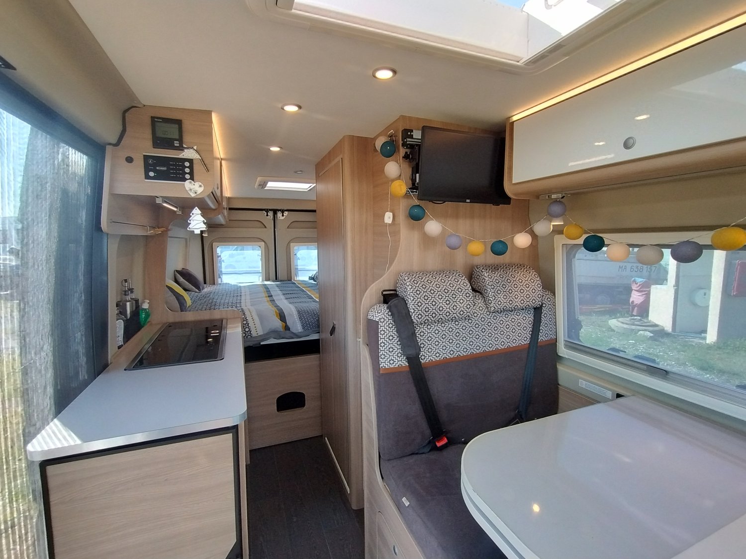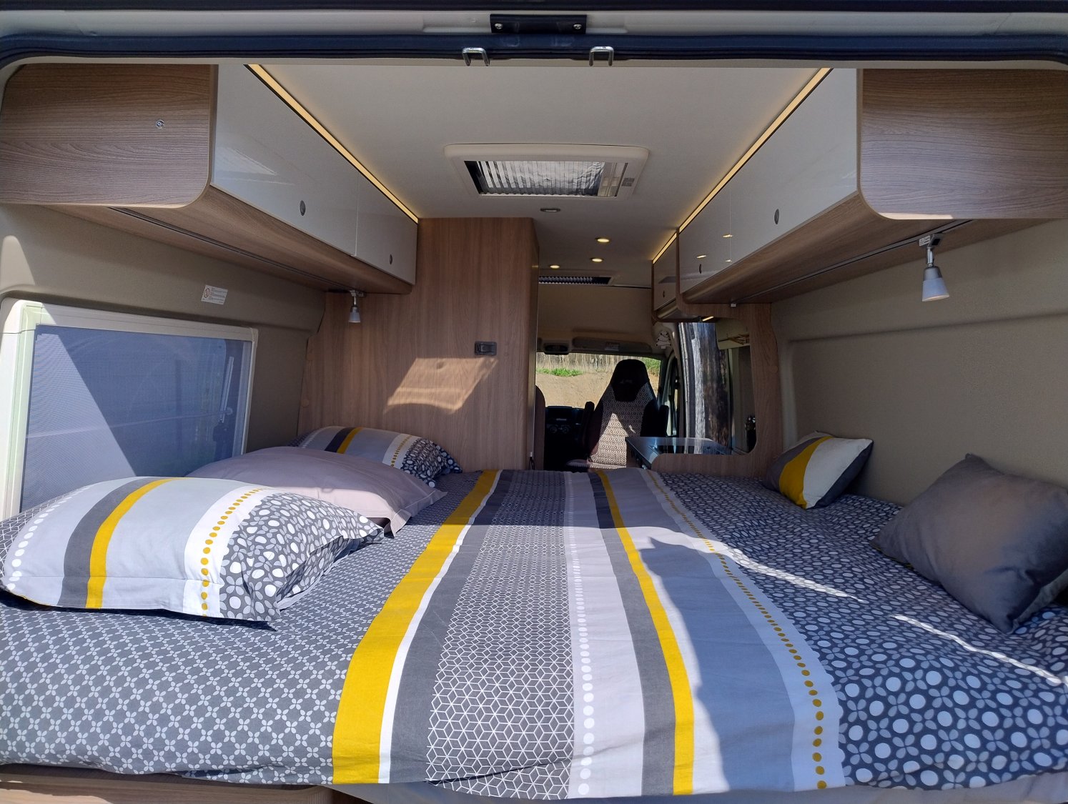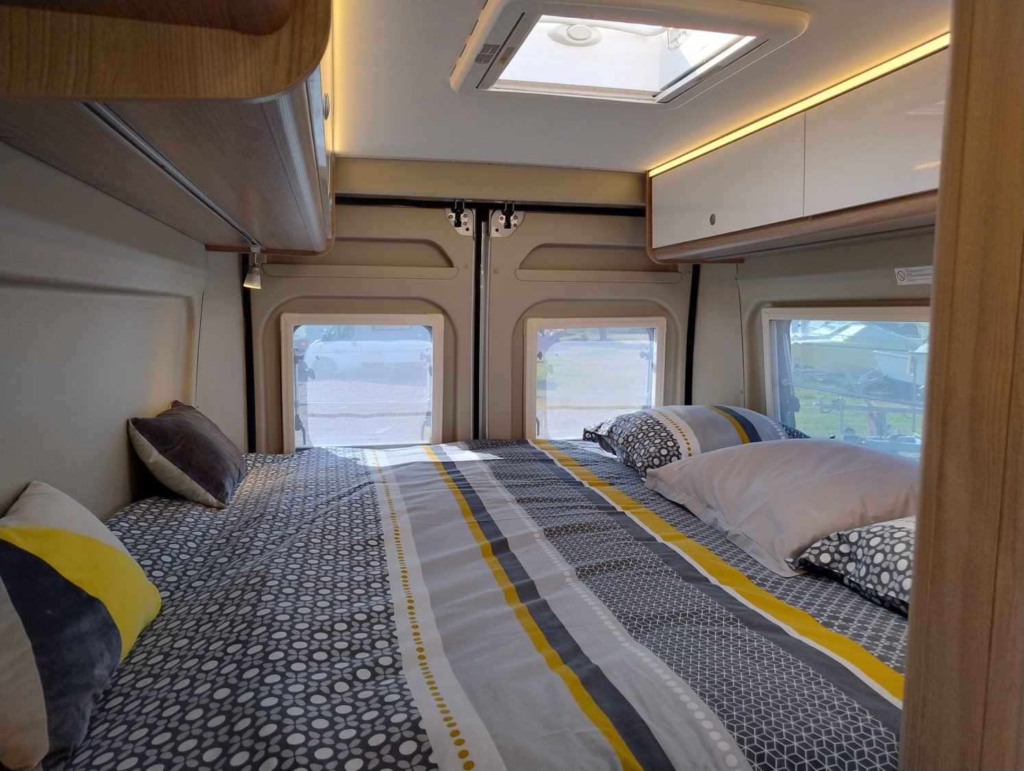 À l’intérieur, l’ambiance est chaleureuse et contemporaine, avec des matériaux de qualité et des finitions particulièrement soignées. À l’arrière, vous profitez d’un très grand lit permanent de 195cm x185cm ; le véritable atout de ce modèle ! Un 3° couchage est possible en partie avant grâce au kit dinette.