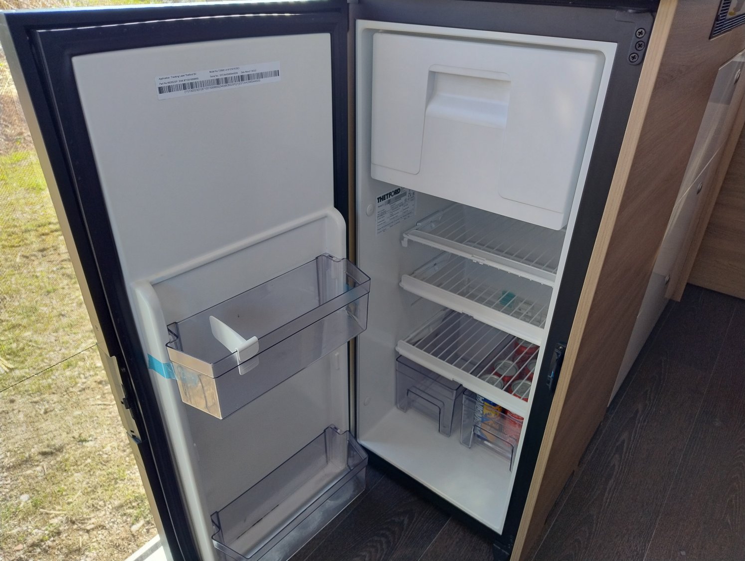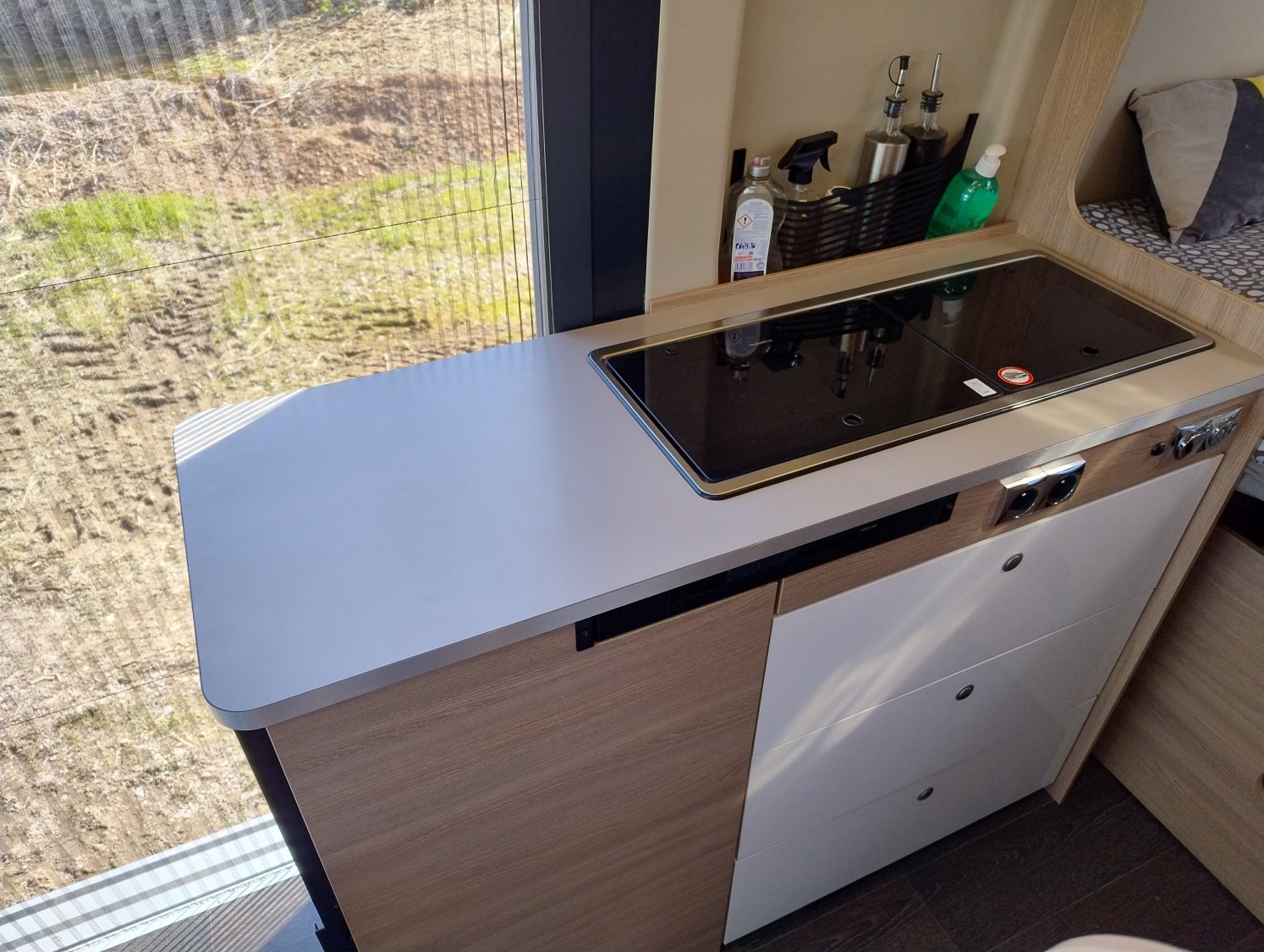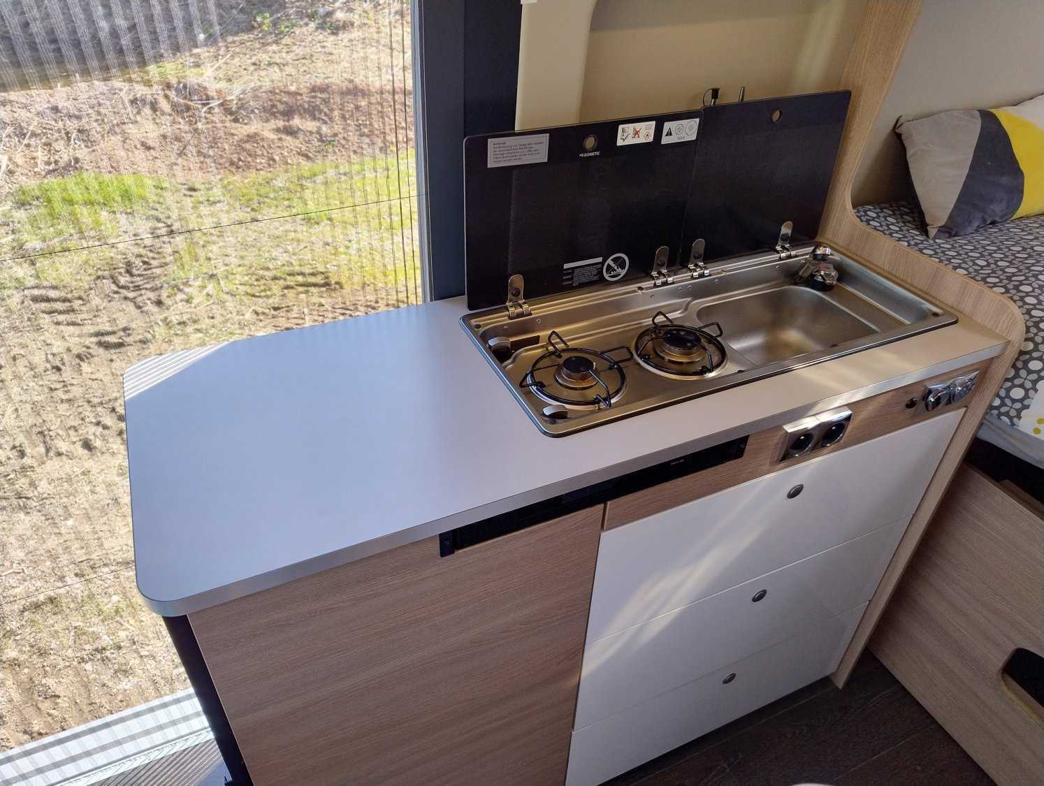 À l’intérieur, l’ambiance est chaleureuse et contemporaine, avec des matériaux de qualité et des finitions particulièrement soignées. À l’arrière, vous profitez d’un très grand lit permanent de 195cm x185cm ; le véritable atout de ce modèle ! Un 3° couchage est possible en partie avant grâce au kit dinette.