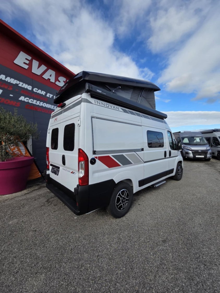 - Pack "Innovan" (baie de SDB, séchoir à linge, transformation de la dînette en couchage, réservoir d'eaux usées isolé, prédisposition TV, rallonge de table de dînette, moustiquaire de porte cellule, stores plissés de cabine, équipement de douche, grand lanterneau, caillebotis de douche, store coloris anthracite, marchepied extra-large),