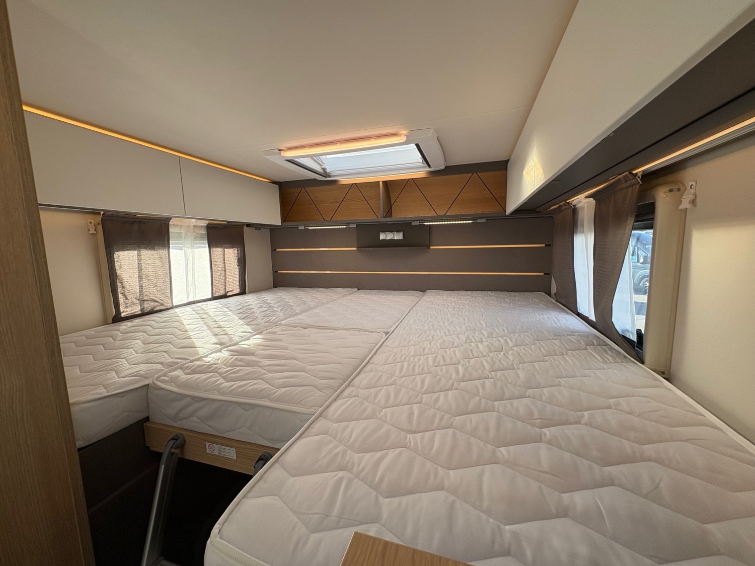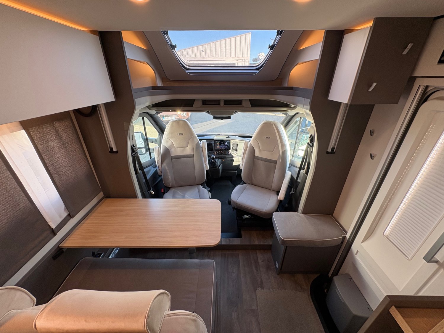 Camping-car de 7 mètres haut de gamme de la marque LMC, lits jumeaux et lit pavillon électrique.