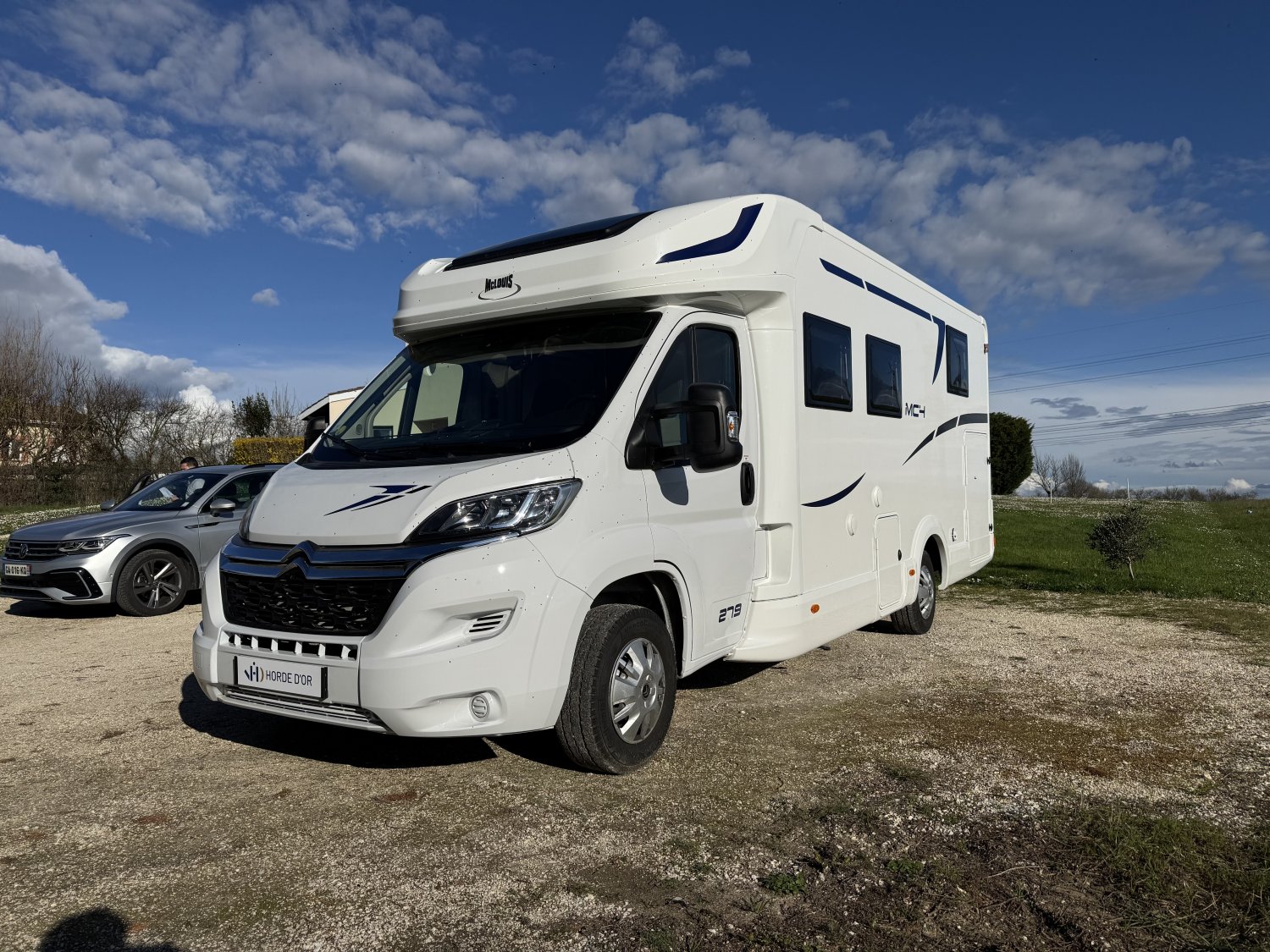 McLouis MC4 279 Camping-car profilé avec lit central, lit de pavillon et une soute garage à moto de 1,20m de haut.