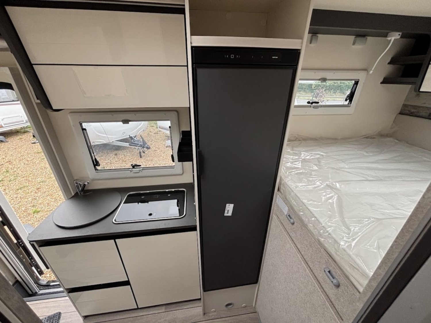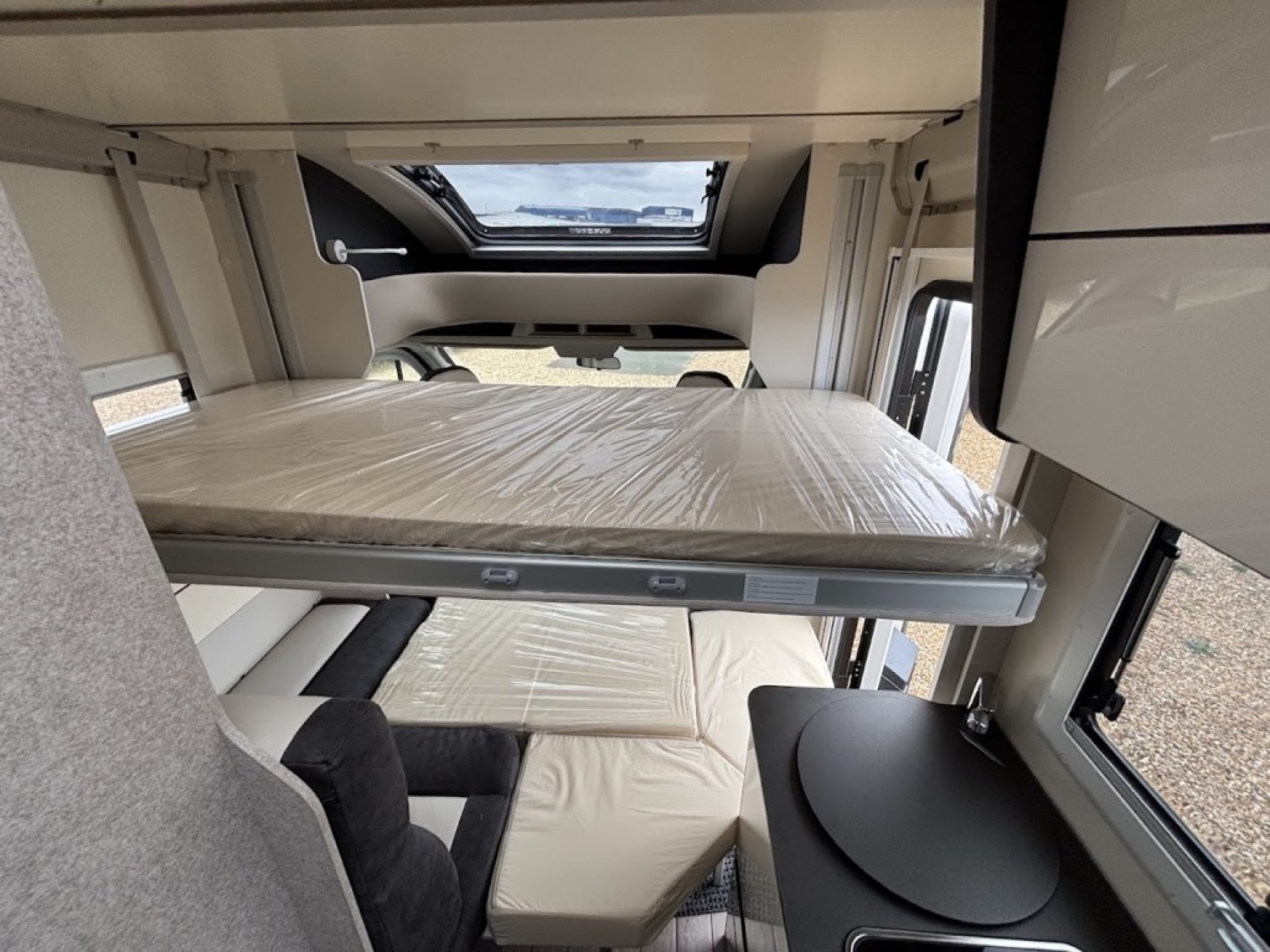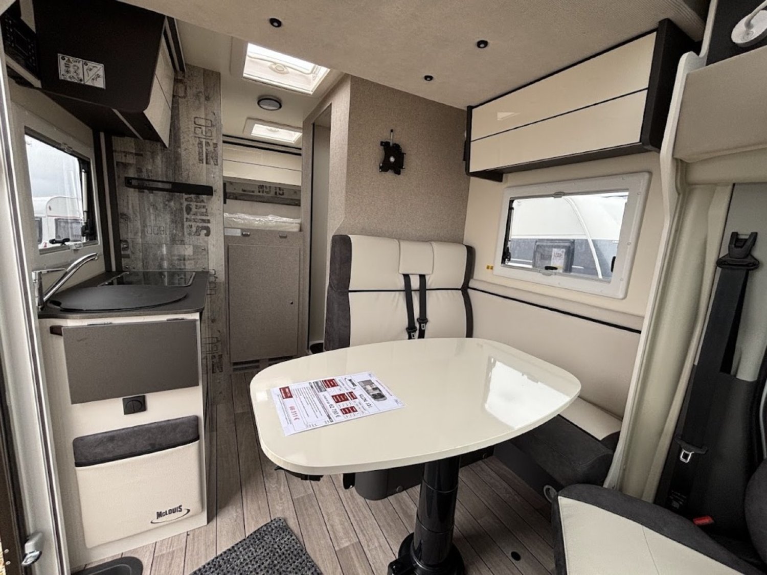 Cuisine en long, Douche à vario, Grande soute, Lit arrière transversal, lit pavillon, Salon avant sièges pivotants, WC Cassette.