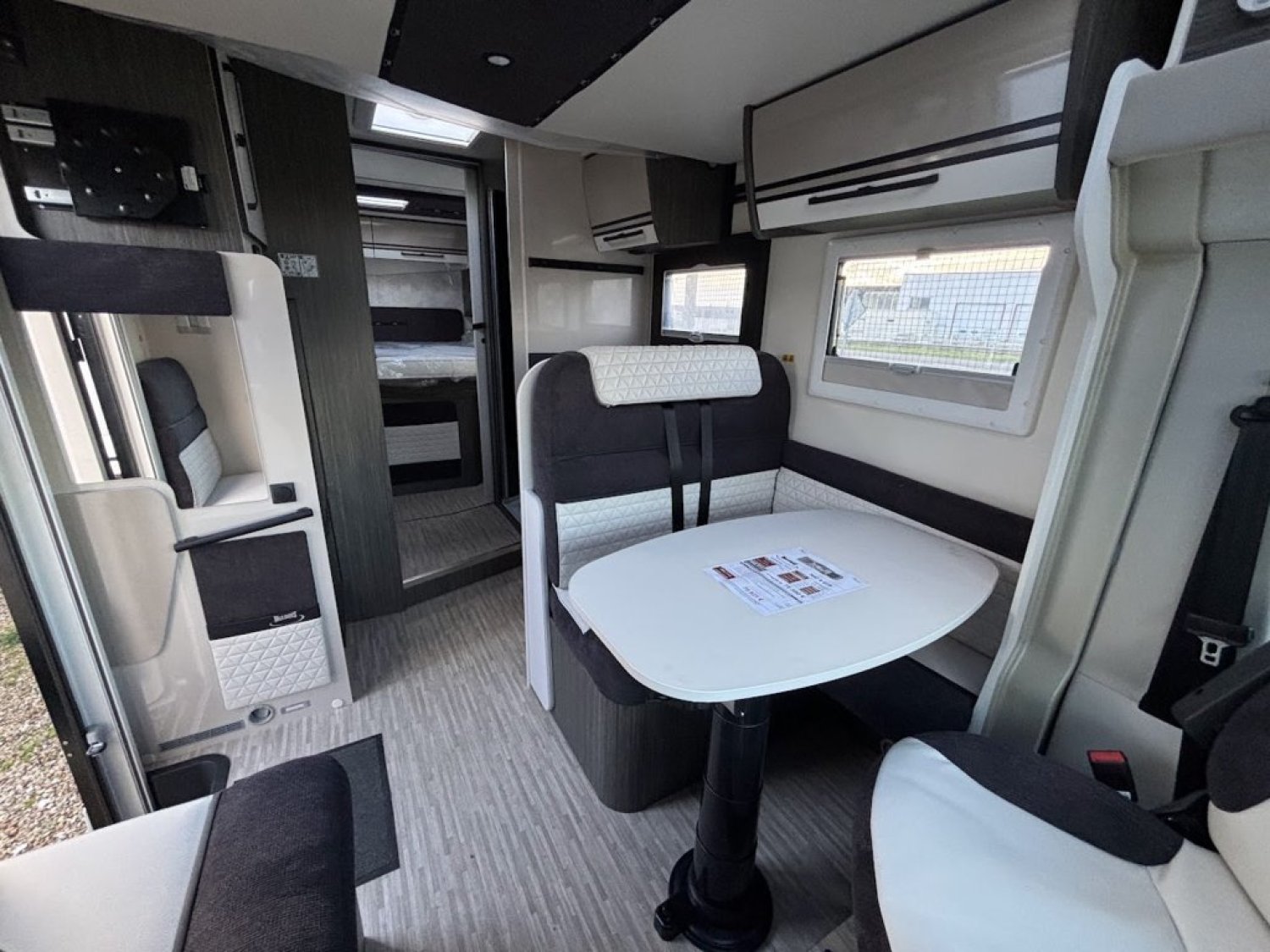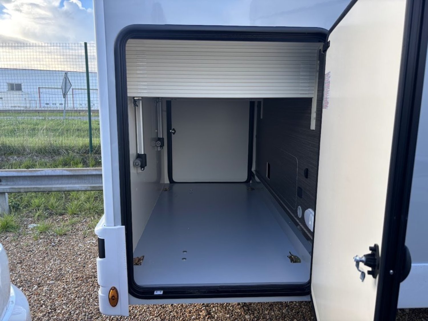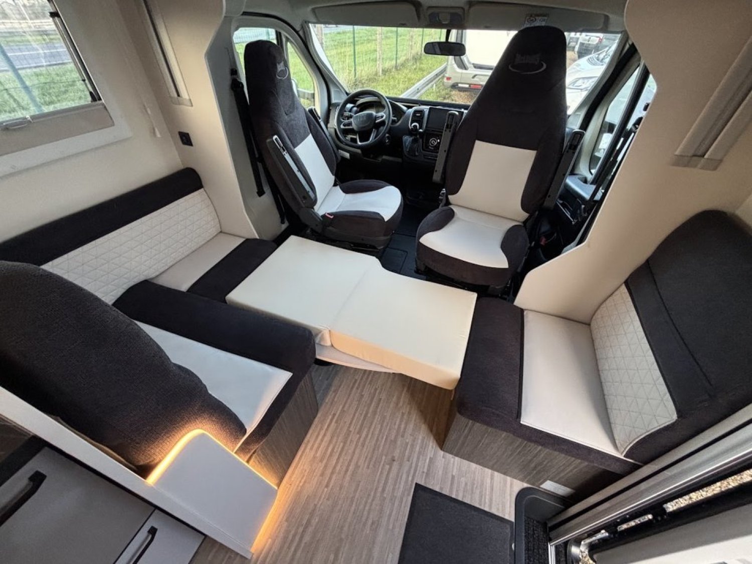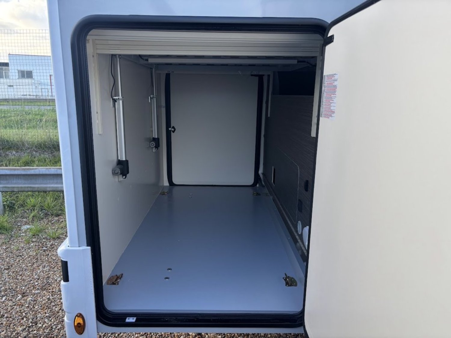 Cuisine en L, Douche indépendante, Grande soute, Lit central, Lit dînette avant, lit pavillon, Salon avant sièges pivotants, Salon en L, Soute réglable en hauteur, WC Cassette.