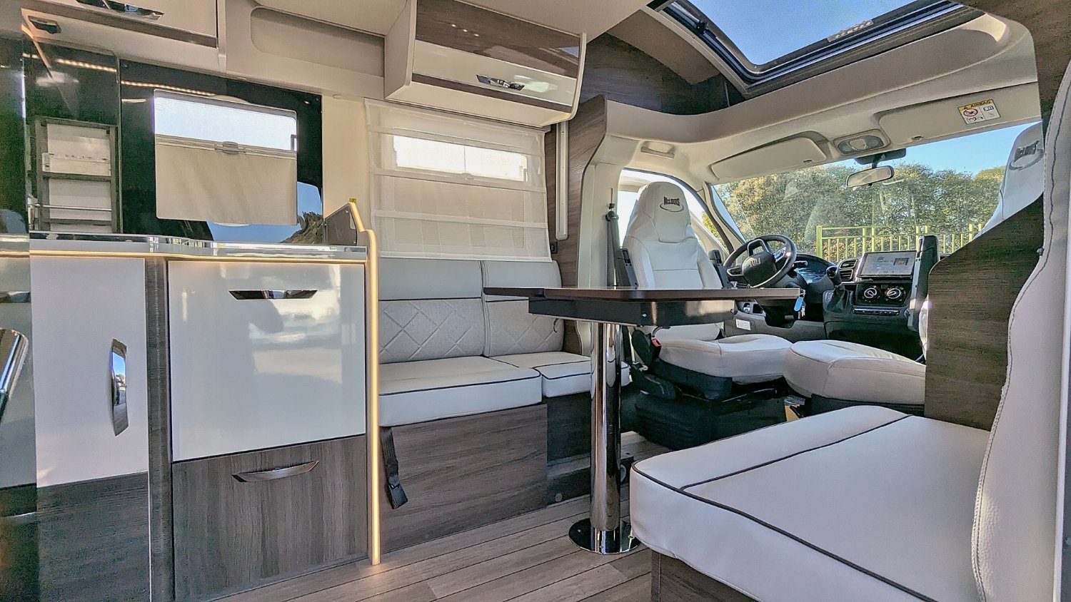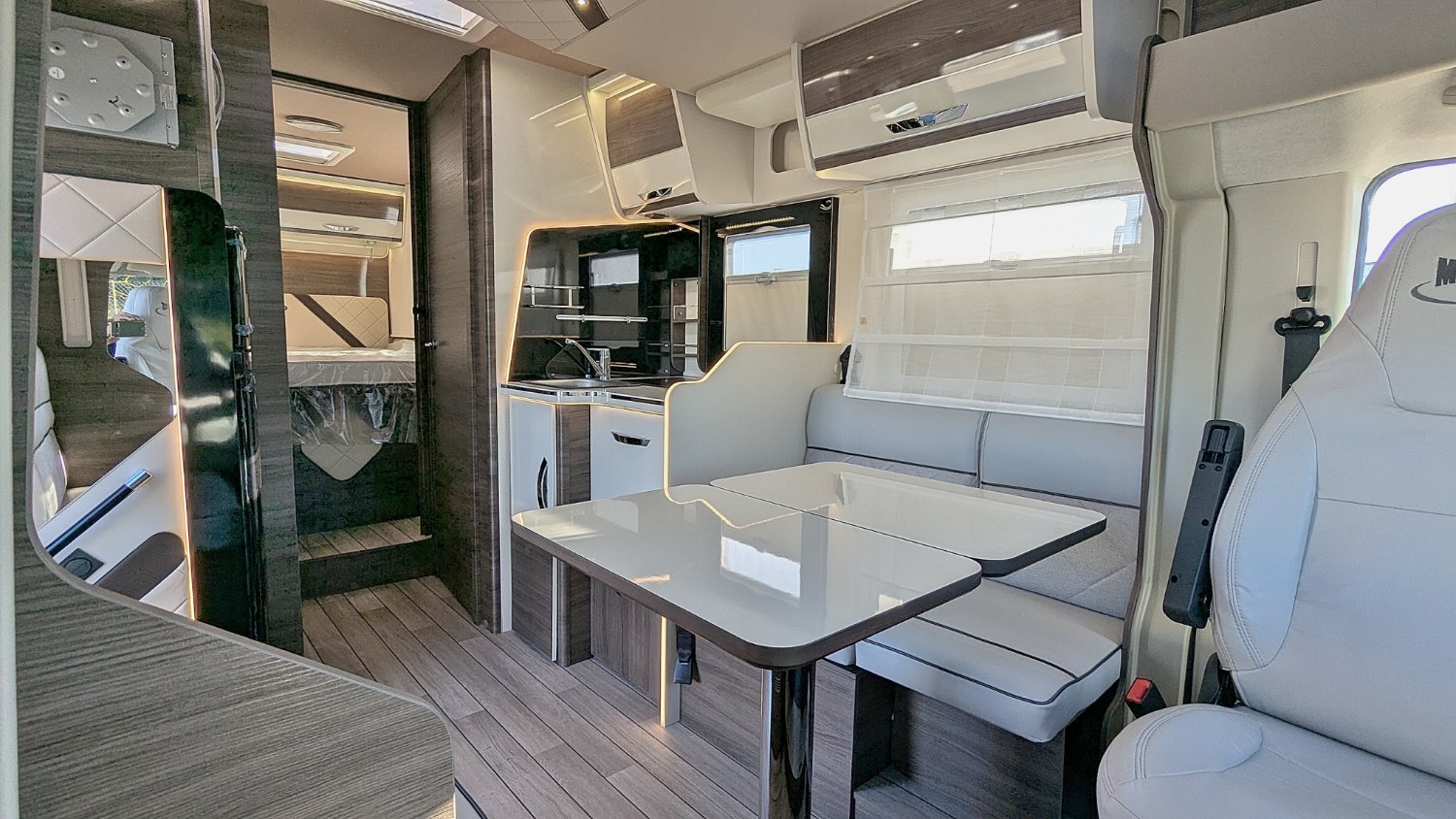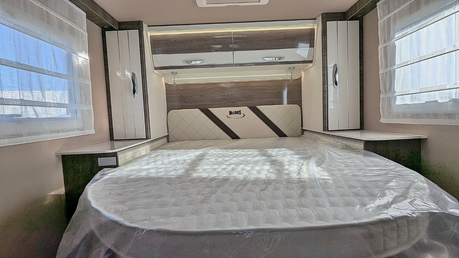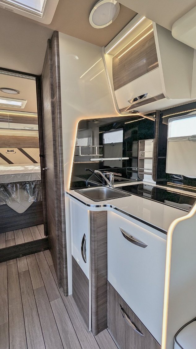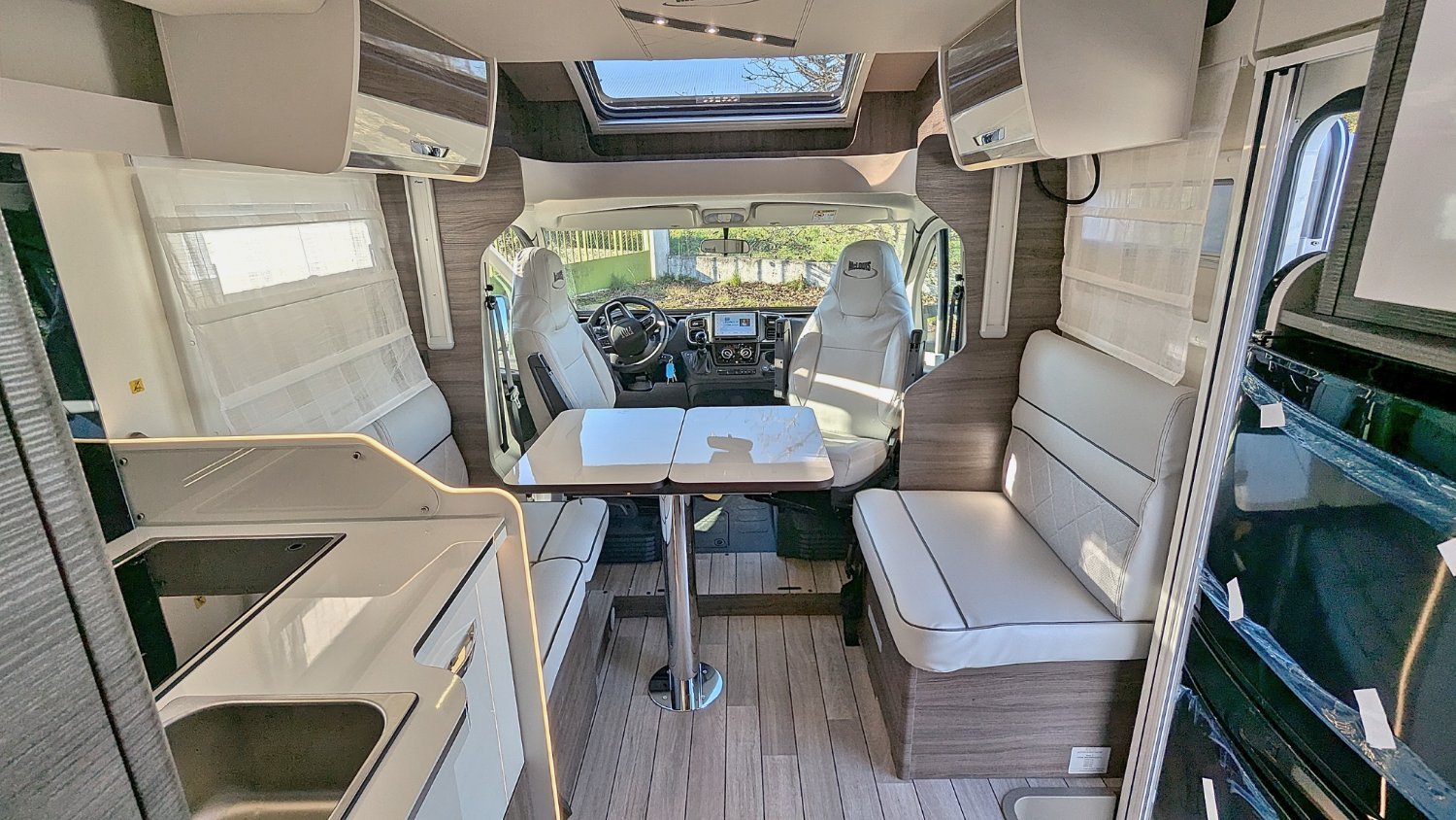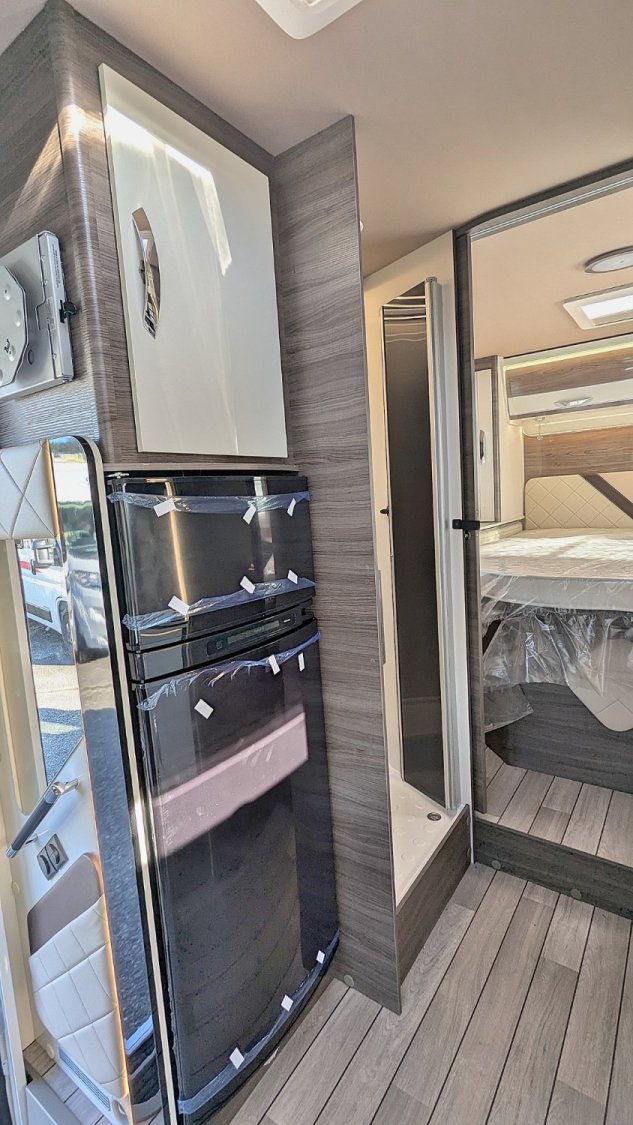 Le Mc Louis MC4-881 2025, un très beau profilé sur le nouveau Fiat 2.2 JTD 140 cv boîte automatique AT8, avec lit central sur soute réglable en hauteur électriquement, salle d'eau/WC, douche indépendante, cuisine avec frigo trimixte 145 L et maxi salon face/face avec sièges pivotants. Lit de pavillon électrique de 2 personnes au-dessus du salon.