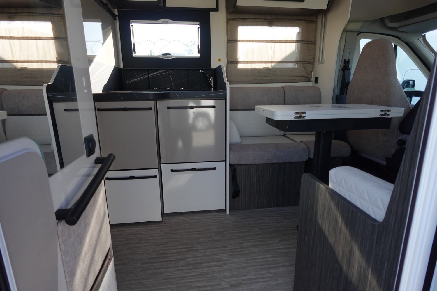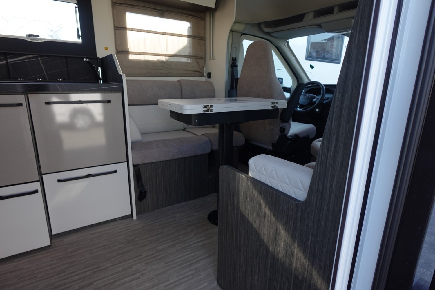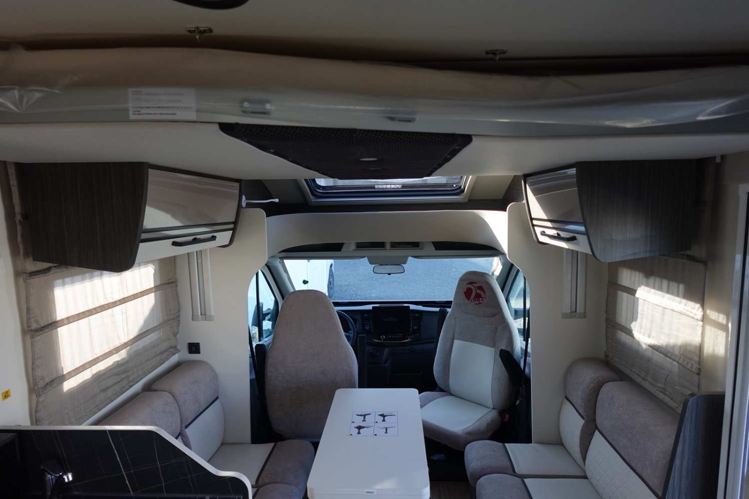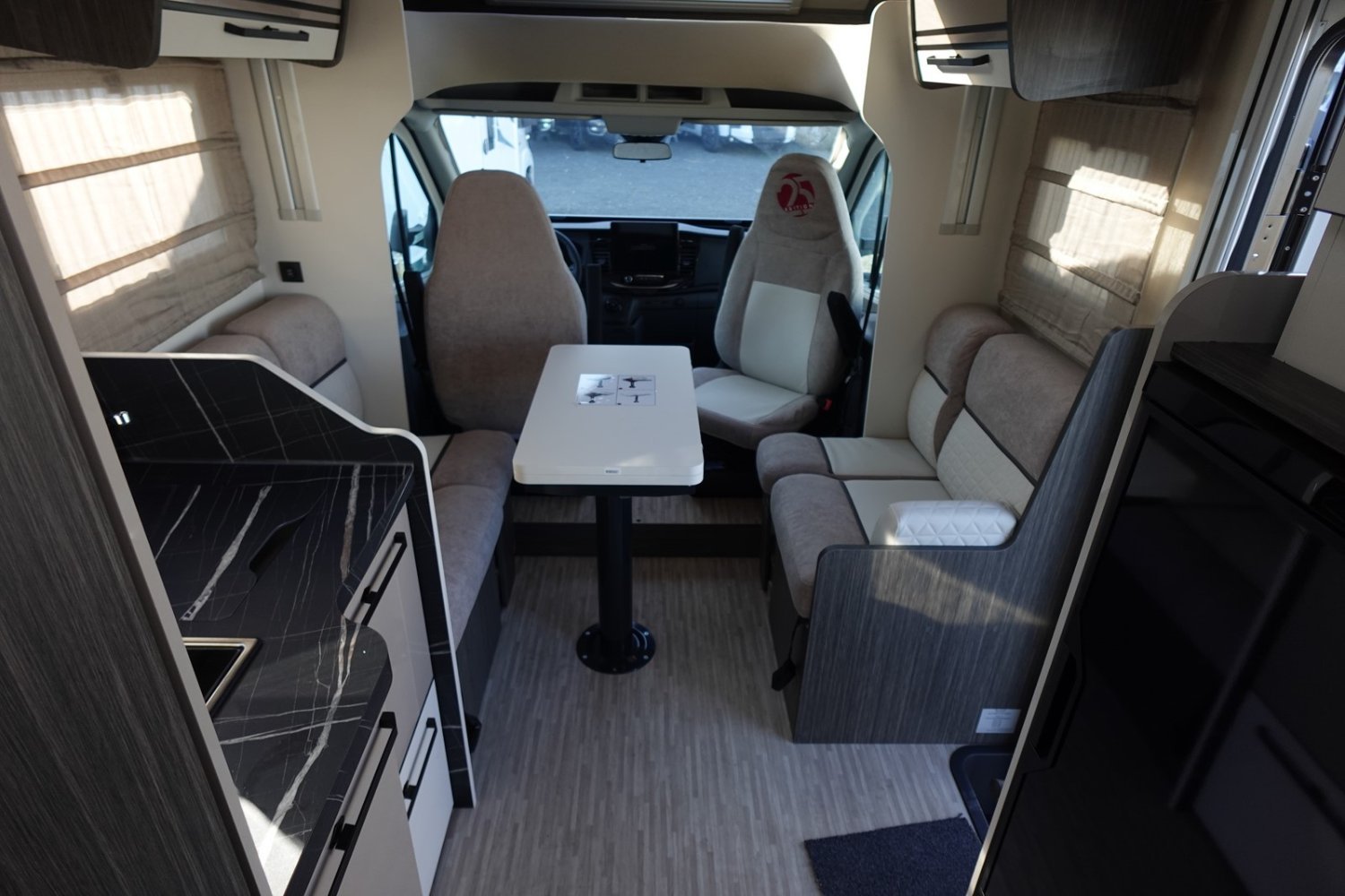 Le profilé avec lit de pavillon de 7,45 m avec lit arrière central, salle de bains avec douche indépendante et dînette face-à-face avec table pliante pivotante à 360°.
