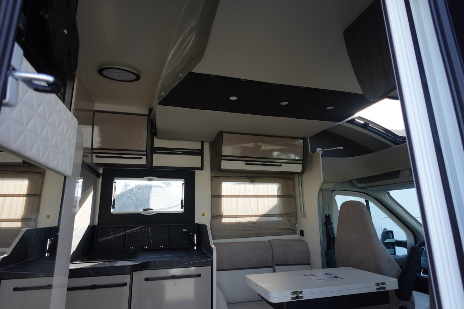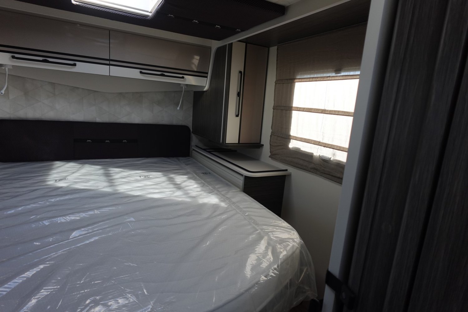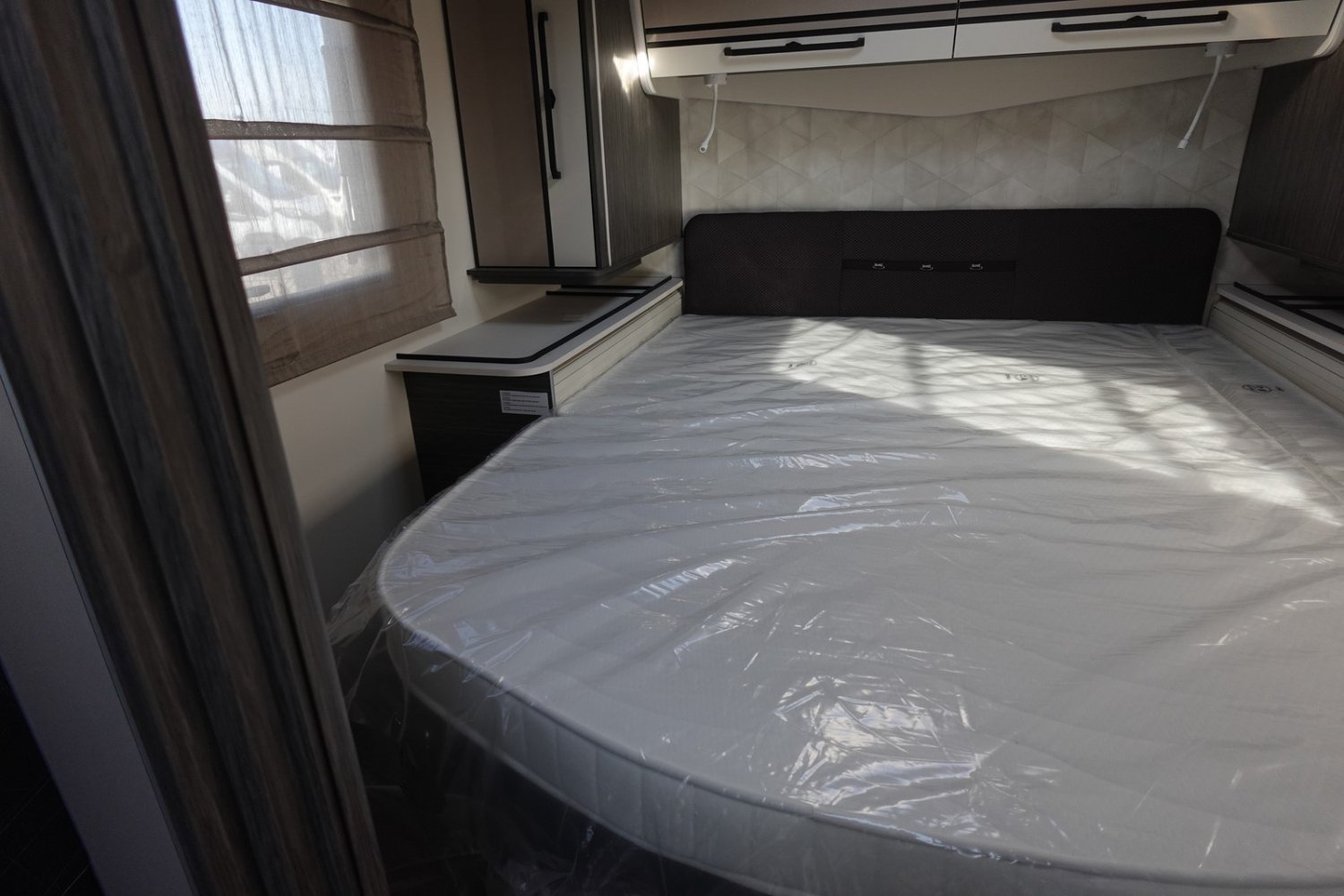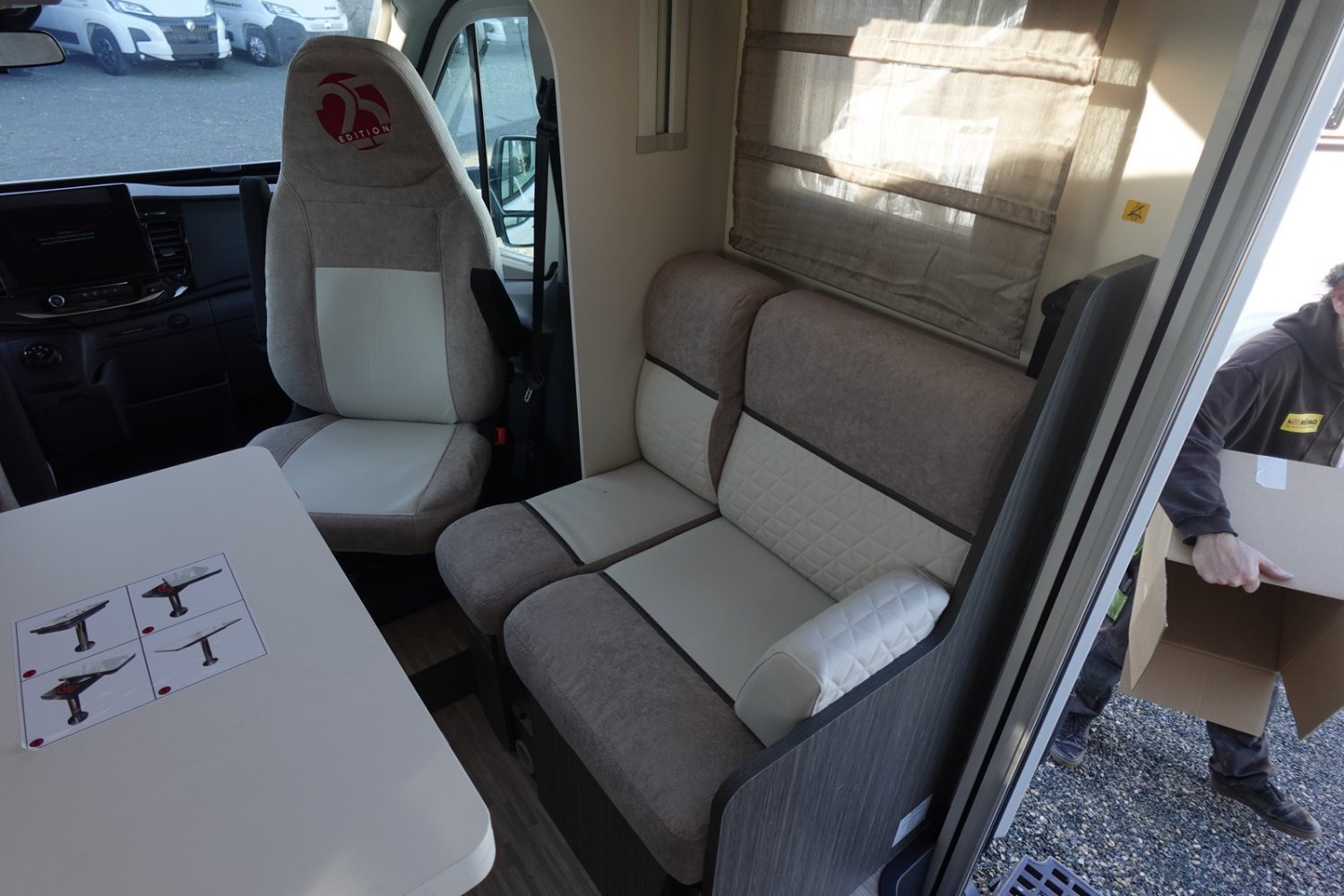Le profilé avec lit de pavillon de 7,45 m avec lit arrière central, salle de bains avec douche indépendante et dînette face-à-face avec table pliante pivotante à 360°.