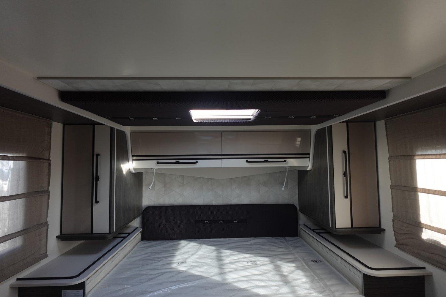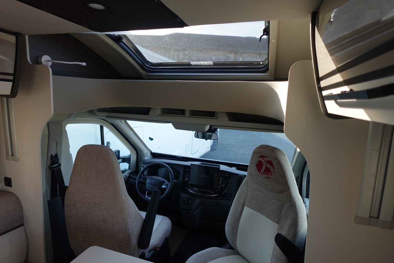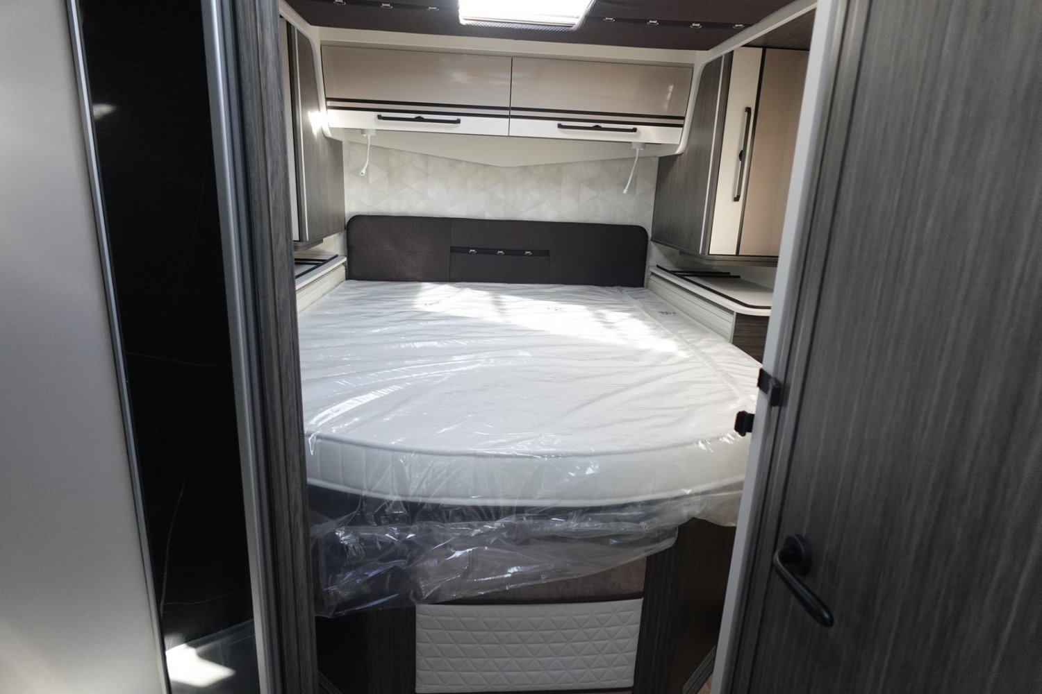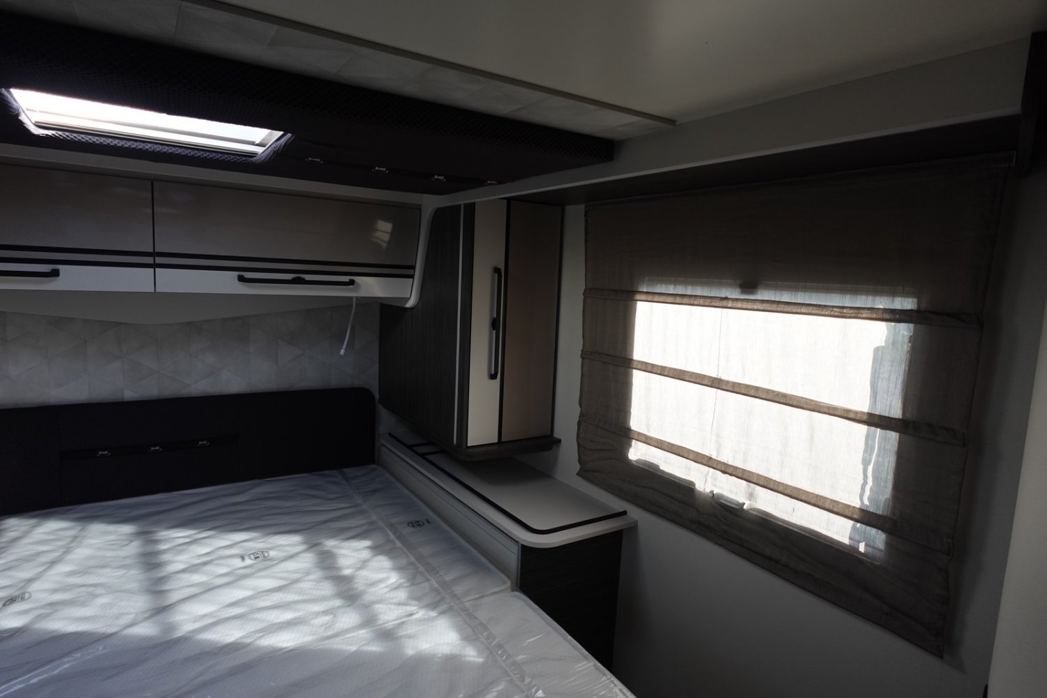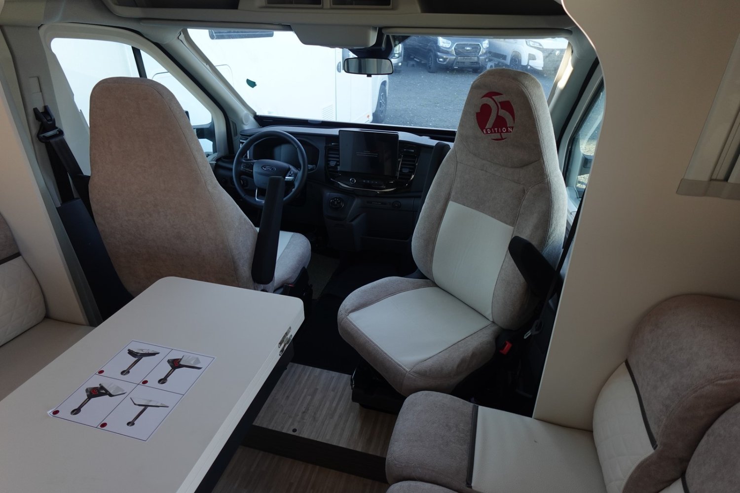 Le profilé avec lit de pavillon de 7,45 m avec lit arrière central, salle de bains avec douche indépendante et dînette face-à-face avec table pliante pivotante à 360°.