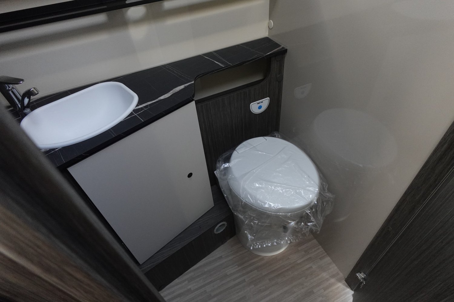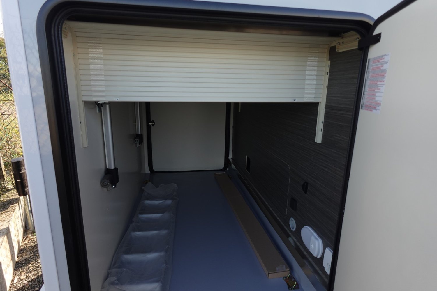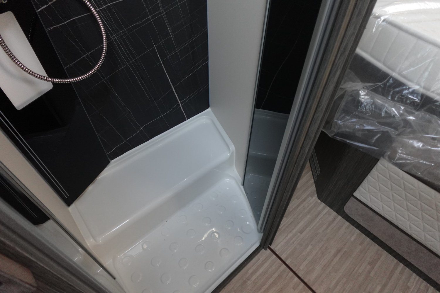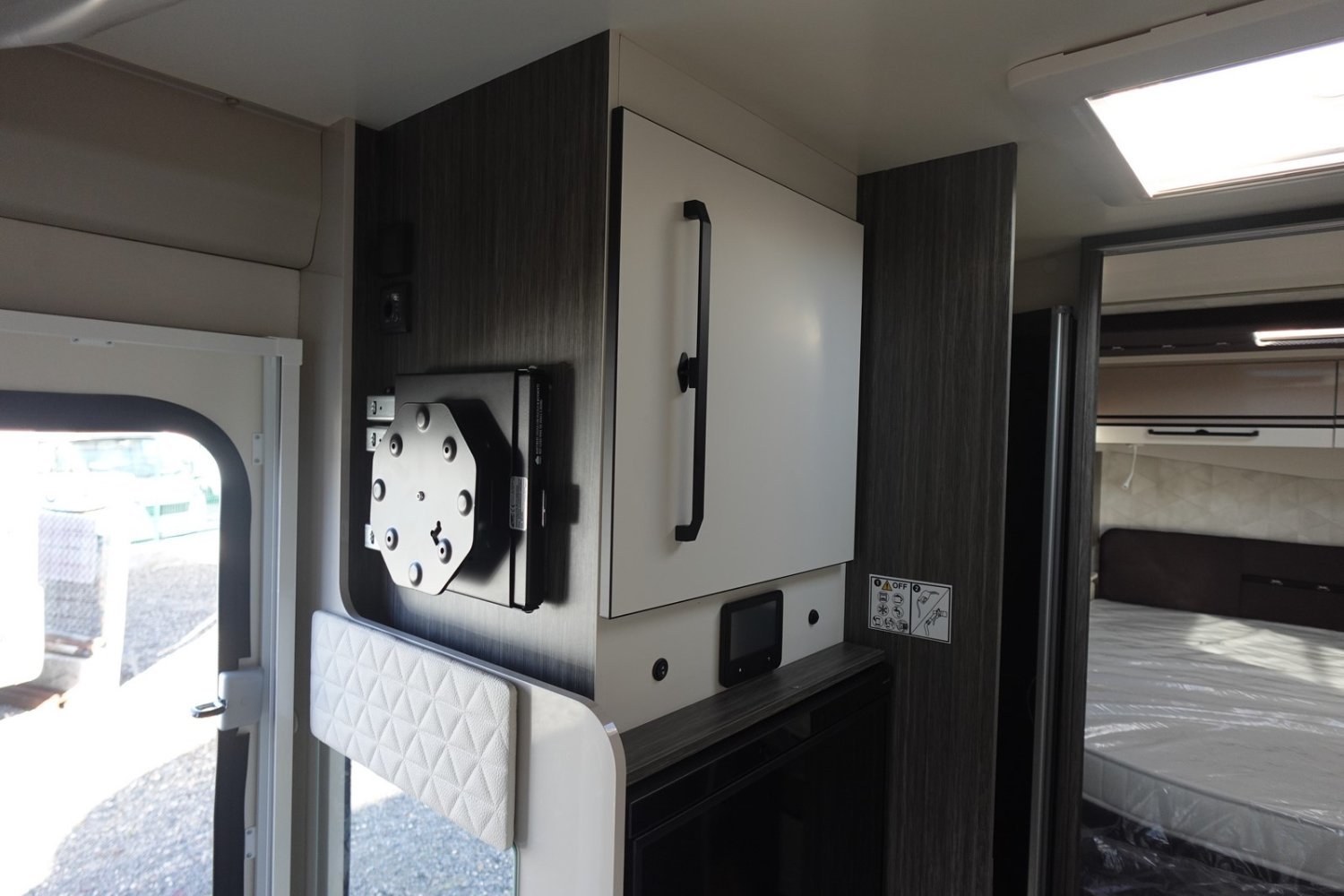 Le profilé avec lit de pavillon de 7,45 m avec lit arrière central, salle de bains avec douche indépendante et dînette face-à-face avec table pliante pivotante à 360°.