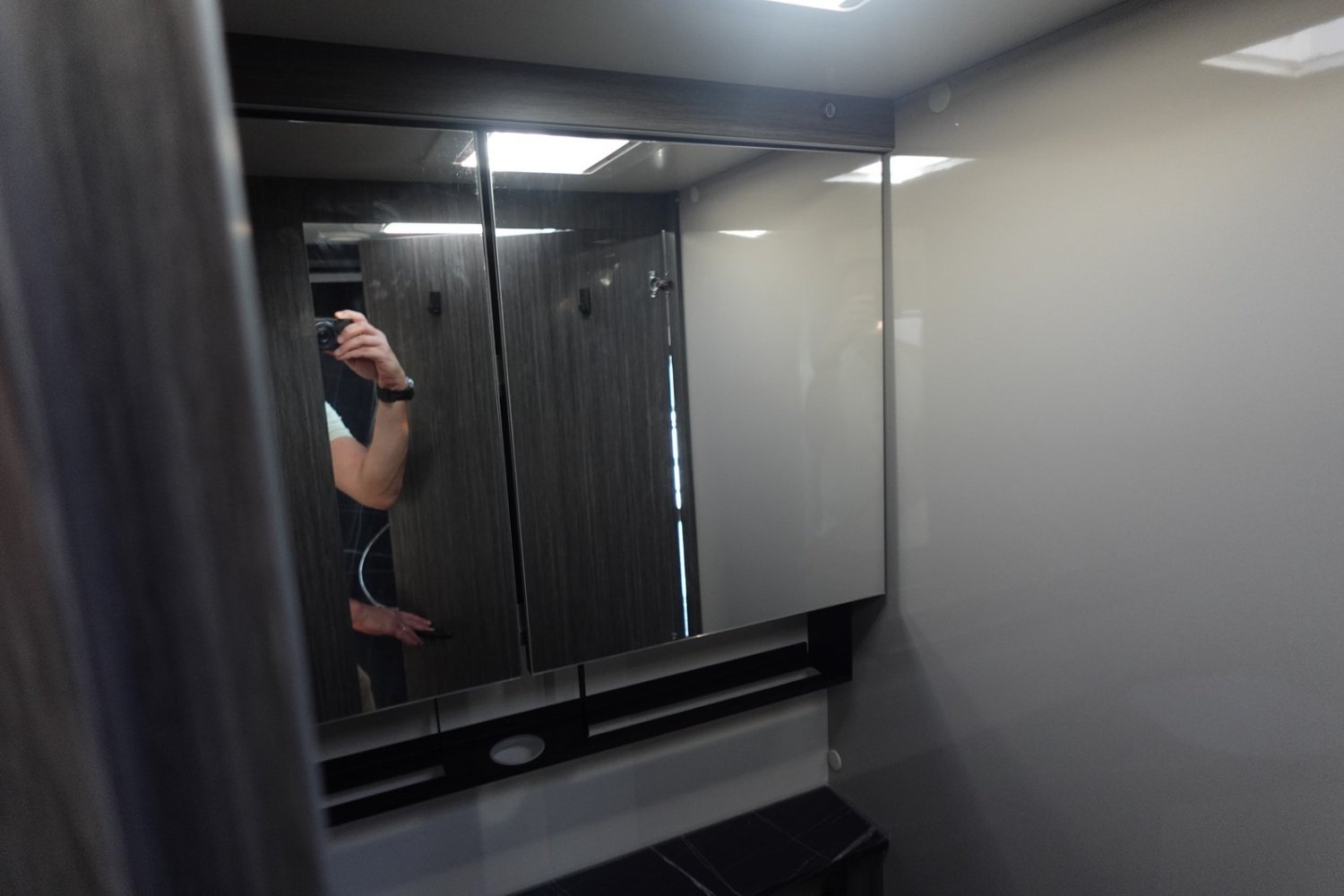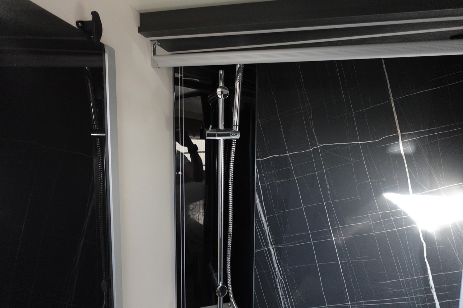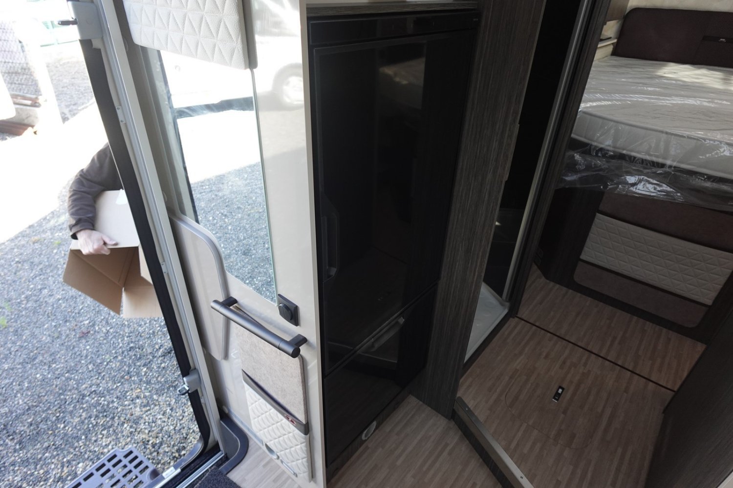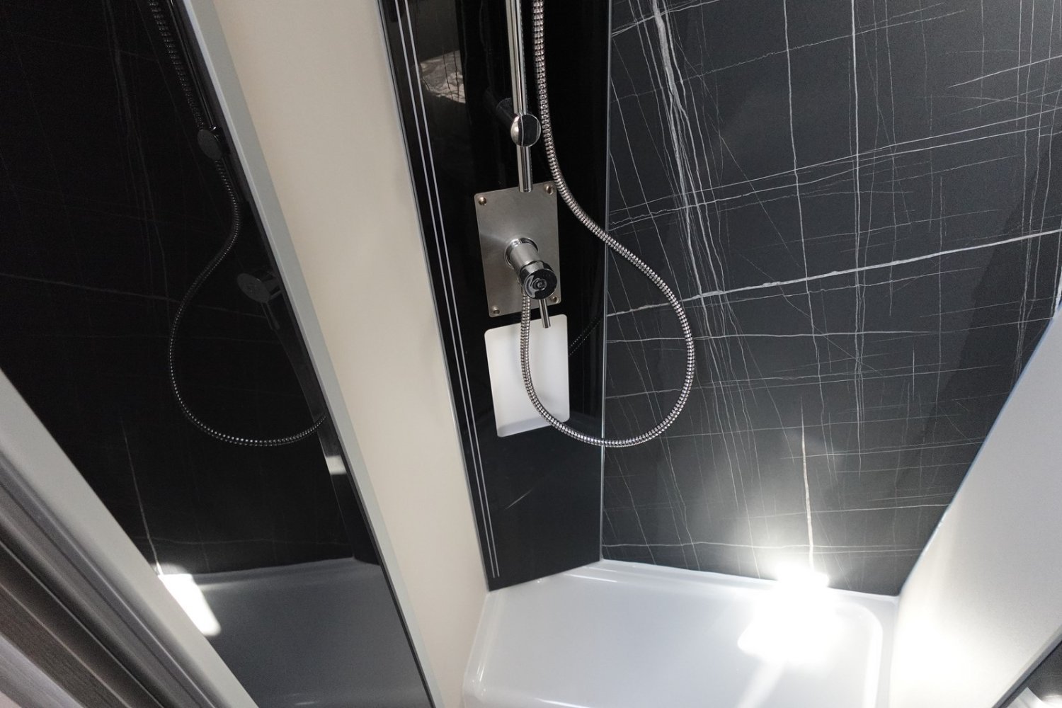 Le profilé avec lit de pavillon de 7,45 m avec lit arrière central, salle de bains avec douche indépendante et dînette face-à-face avec table pliante pivotante à 360°.