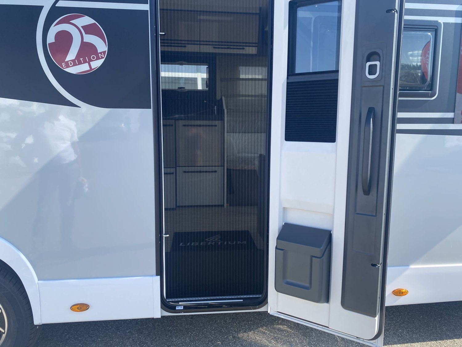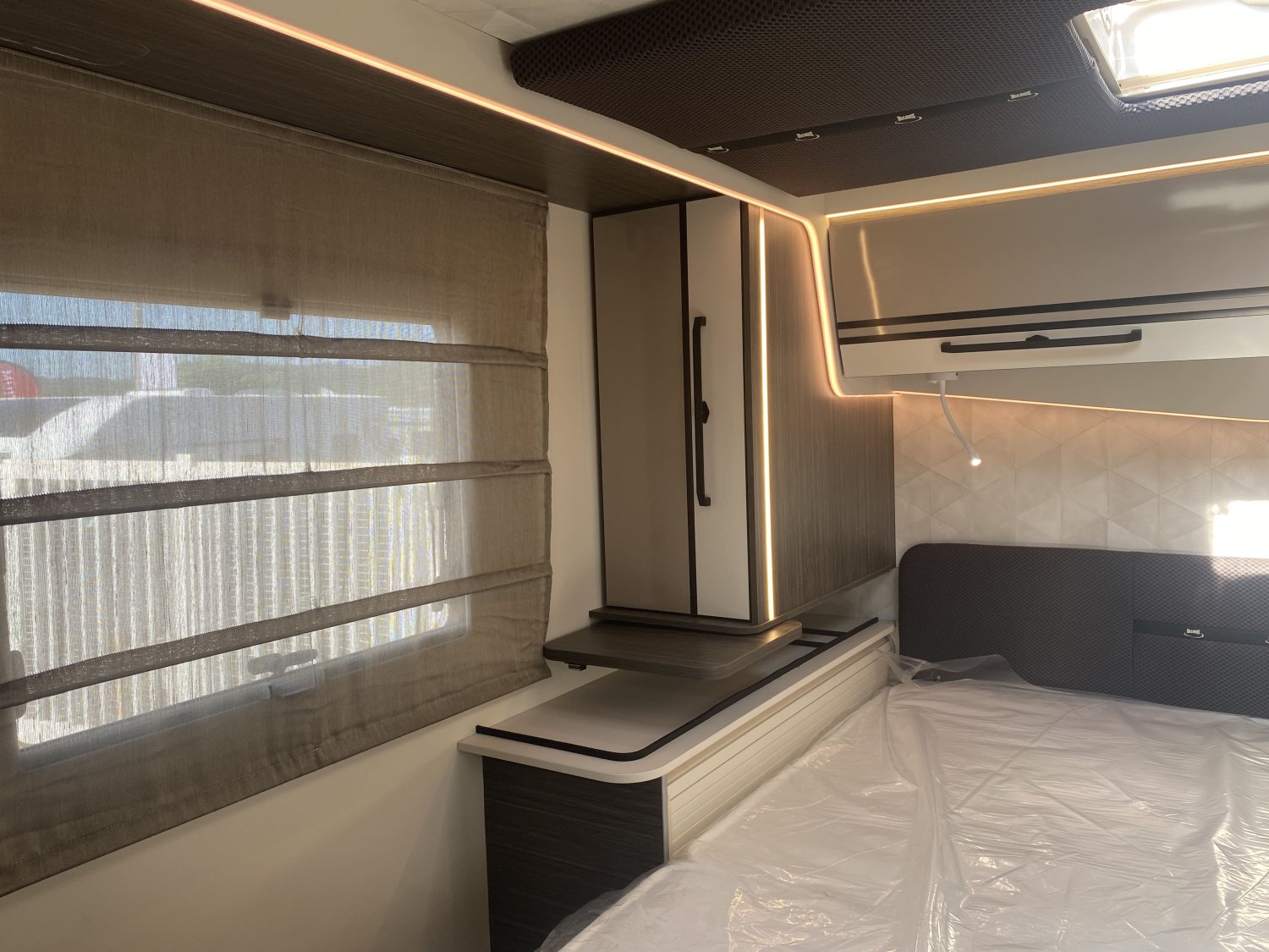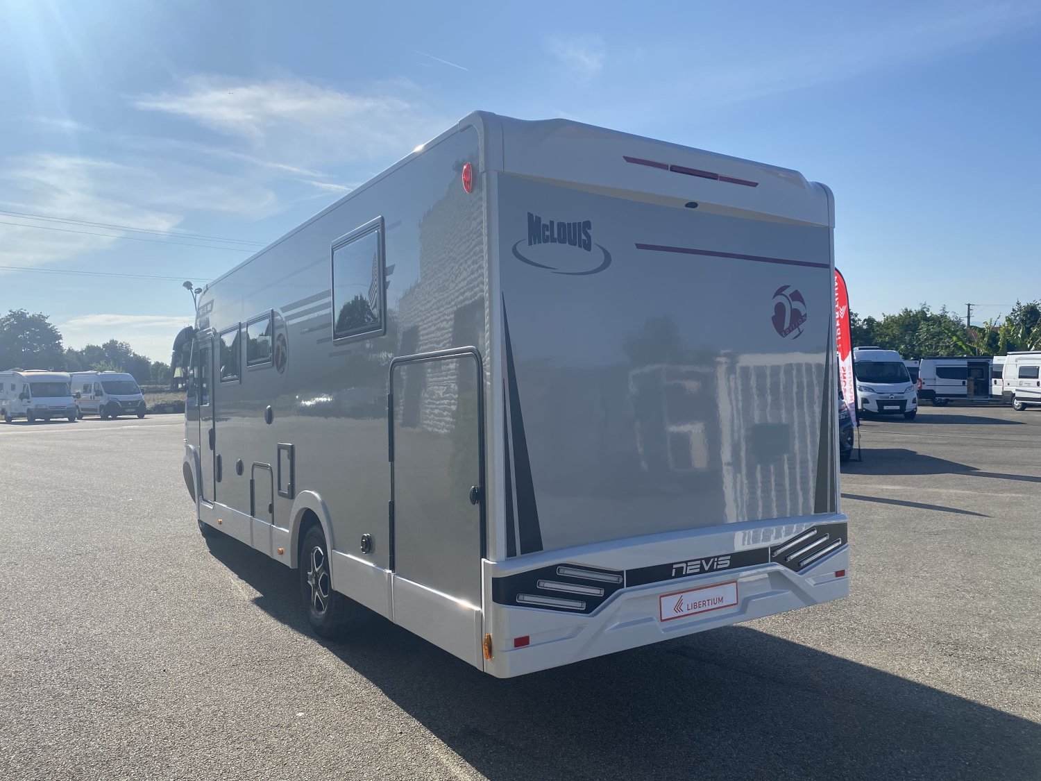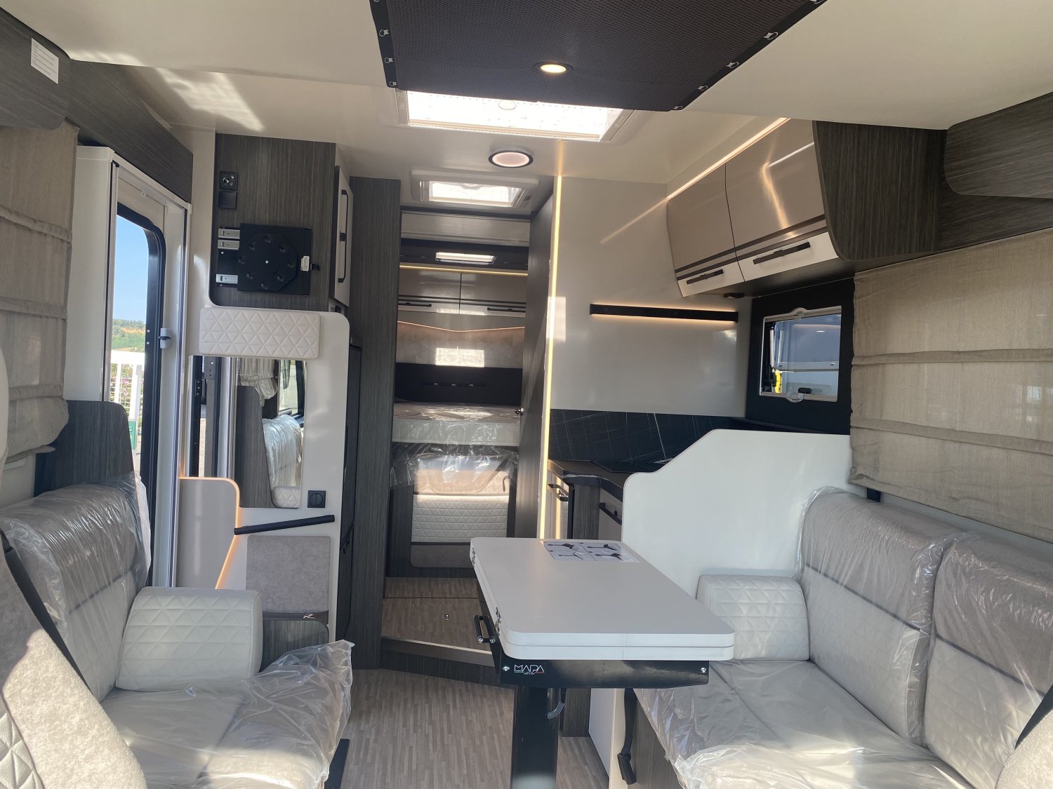 Intégral lit central sur soute garage réglable en hauteur, lit de cabine, salon en face à face et douche indépendante pour cette nouvelle série 25 Edition de chez Mc Louis. Véhicule sur équipé avec une finition spécifique, intérieure et extérieure et qui aborde une nouvelle face avant.