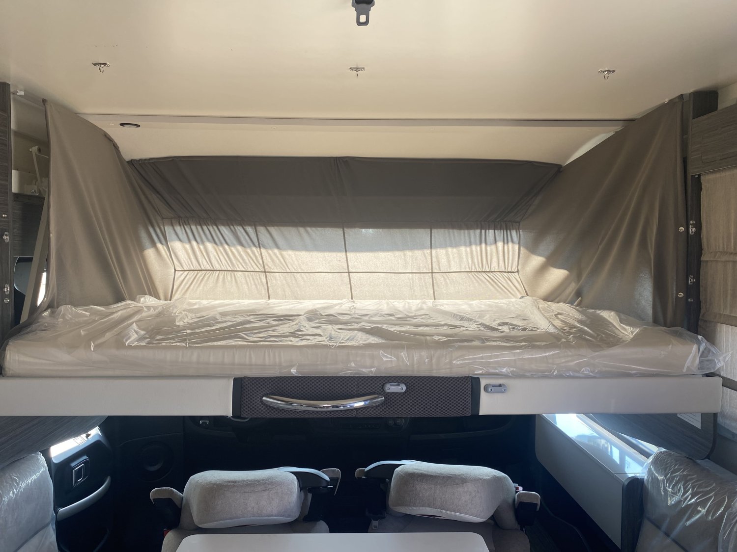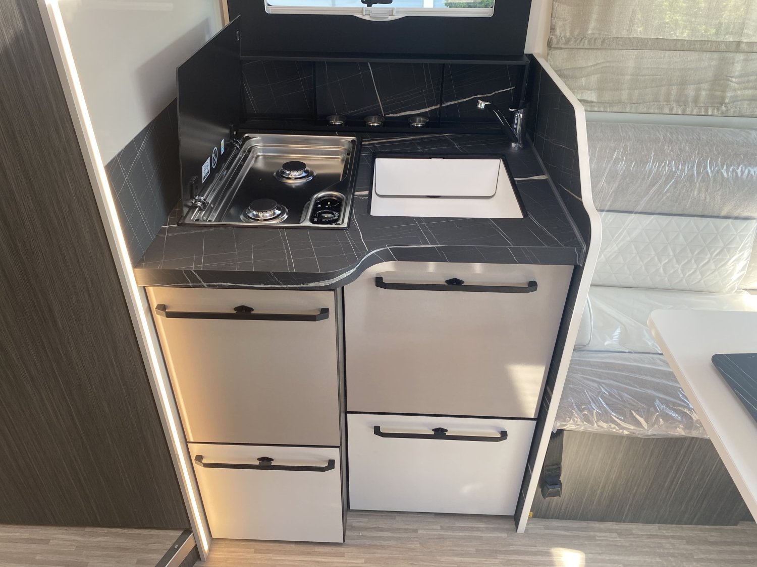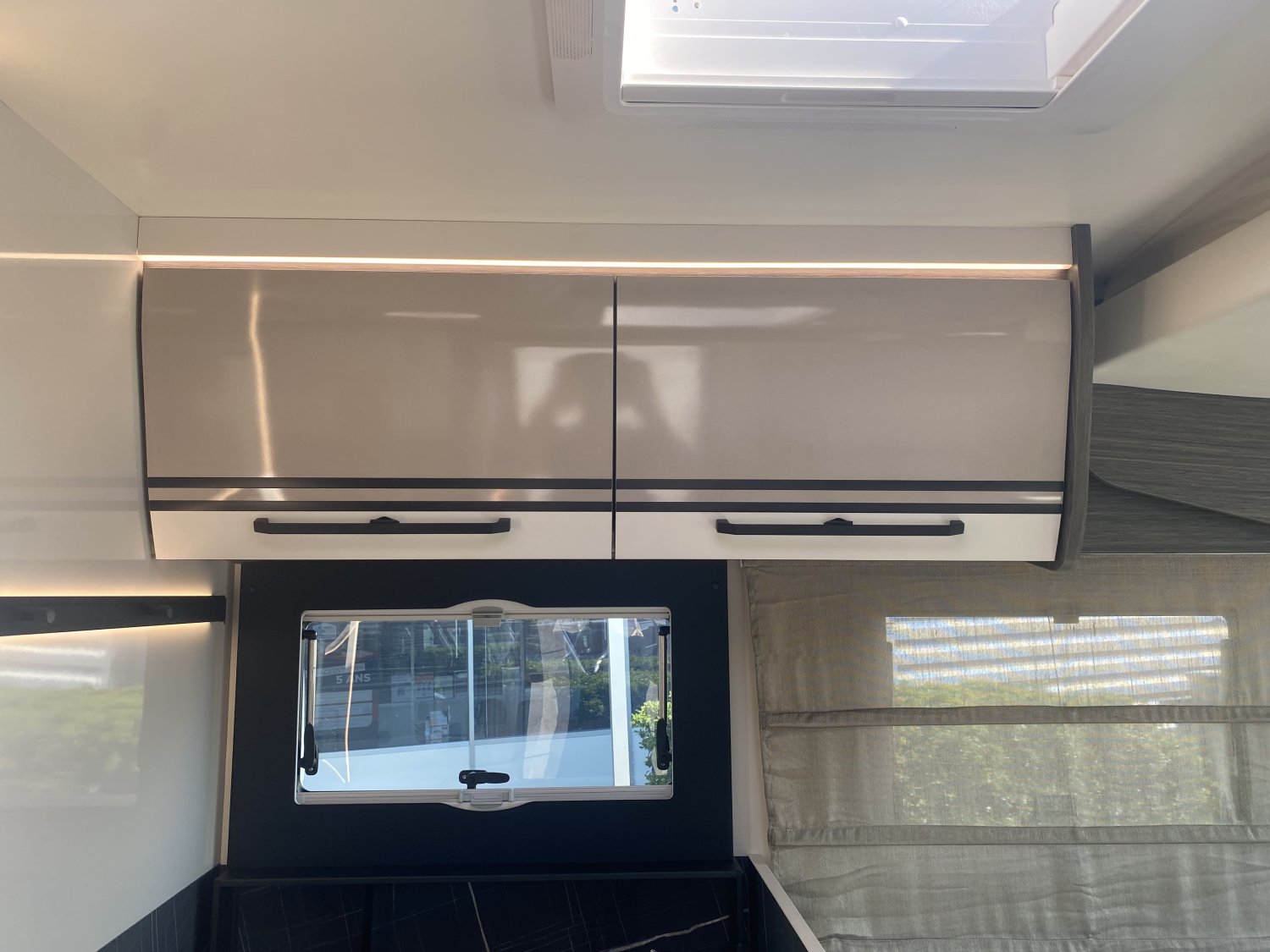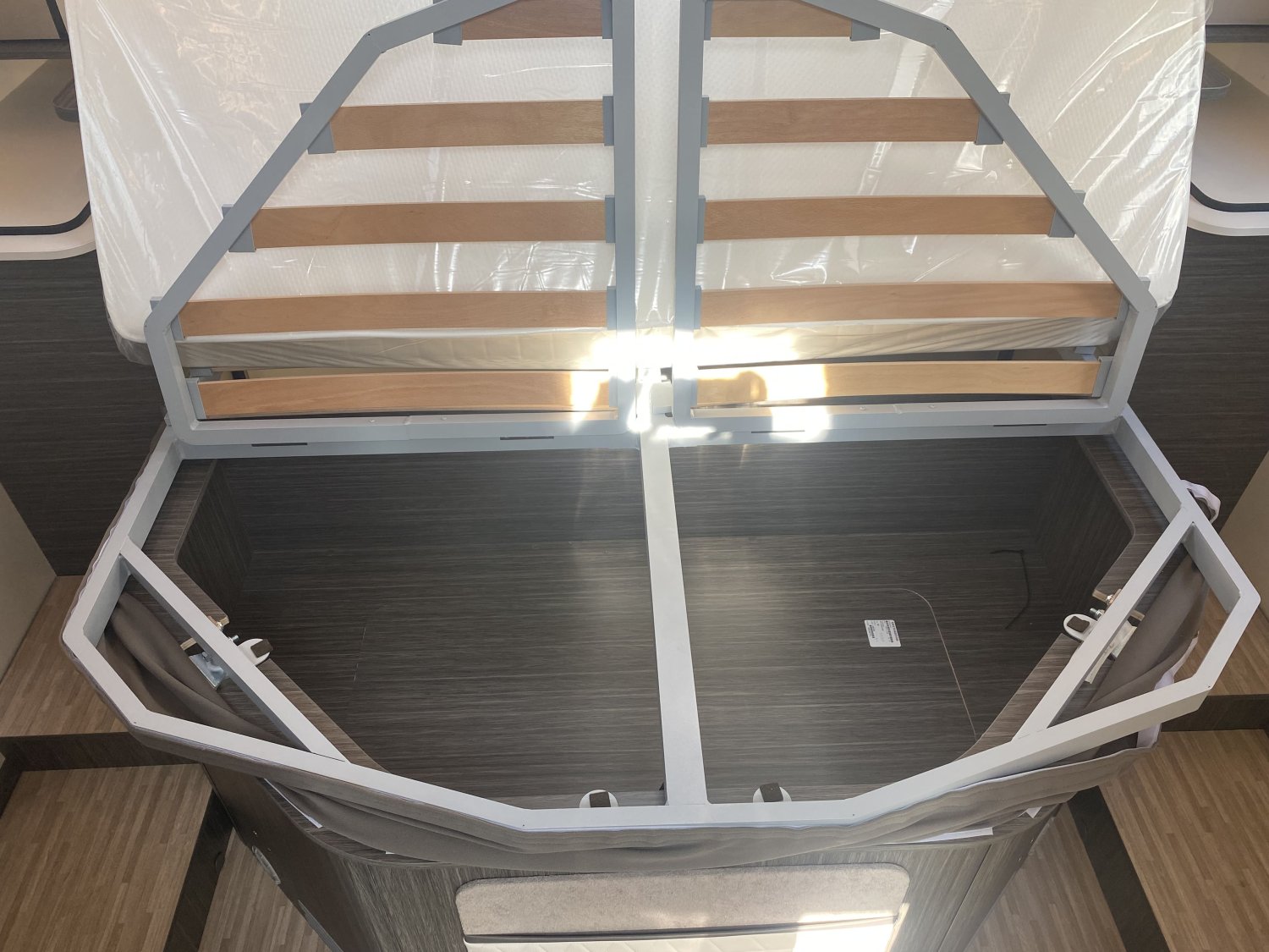 Intégral lit central sur soute garage réglable en hauteur, lit de cabine, salon en face à face et douche indépendante pour cette nouvelle série 25 Edition de chez Mc Louis. Véhicule sur équipé avec une finition spécifique, intérieure et extérieure et qui aborde une nouvelle face avant.