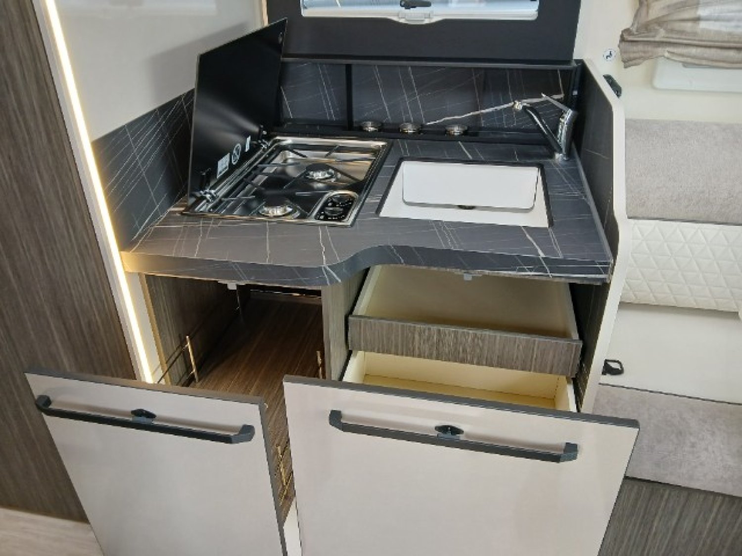 Boite de vitesse automatique, Caméra de recul, Douchette extérieure, Jantes en alliages 16'' bicolore, Pneus 4 saisons, Prisez gaz externe, Radio 9'' Pioneer, Réservoir eaux usées isolé et chauffé, Store extérieur Anthracite
