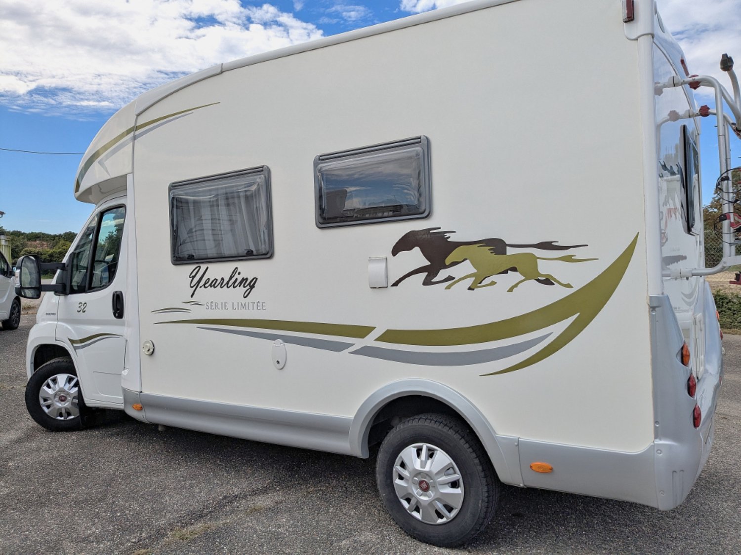 Profilé ultra compact en très bon état sur Fiat 2,3 JTD 130 CV BV6 avec salle d'eau/WC et douche séparée arrière, cuisine latérale en L avec frigo conservateur et plaque de cuisson 2 feux, et salon avant avec banquette face/face convertible en couchage de deux personnes. Lit de pavillon électrique de deux personnes au-dessus du salon.